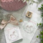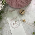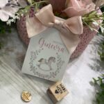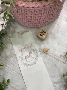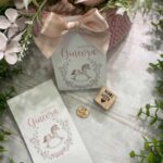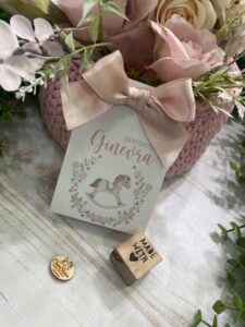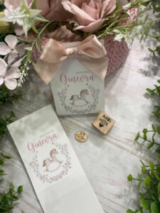 Un delicato porta confetti in cartoncino, impreziosito da grafica personalizzata a tema cavallino a dondolo con decoro floreale nei toni del rosa, pensato per accompagnare con eleganza e dolcezza i momenti più importanti.