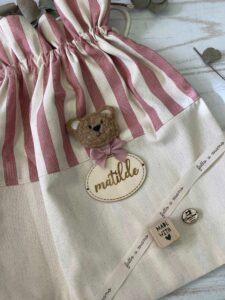 Arricchita da un tenero orsetto in tessuto bouclè e una targhetta in legno personalizzata, questa sacca è una scelta elegante e funzionale.