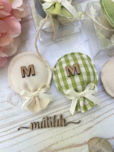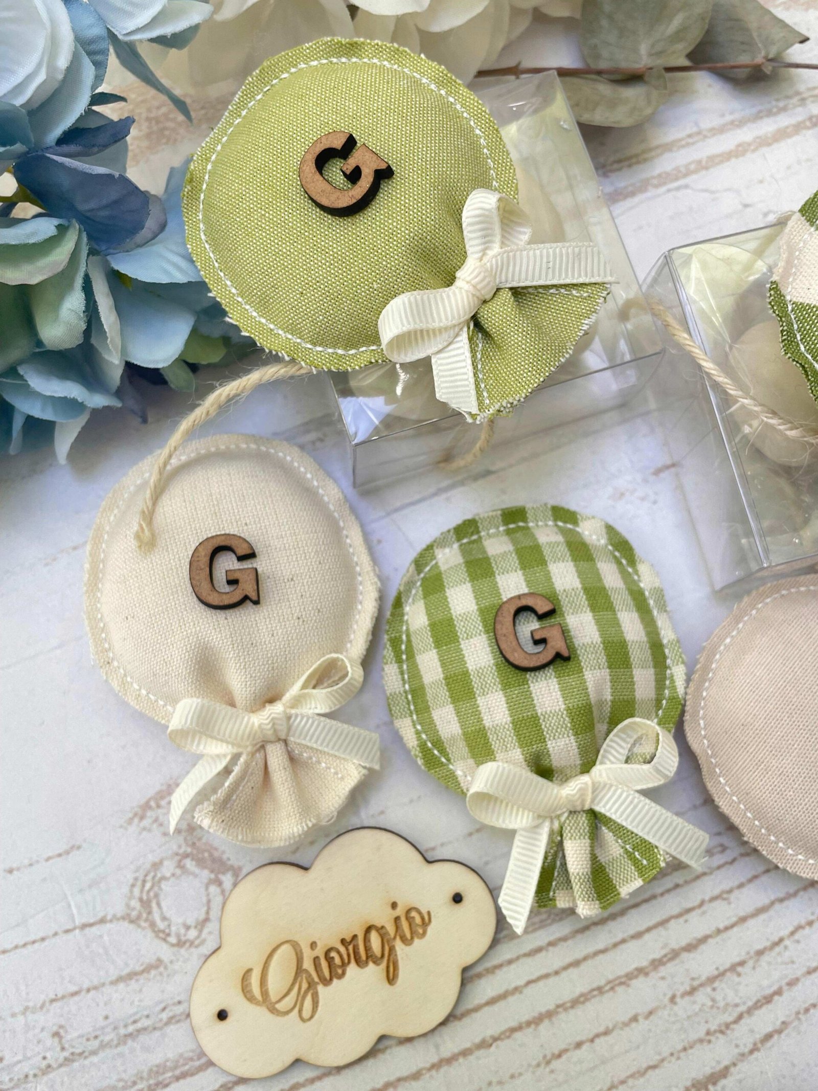 Personalizzazione completa con iniziale in legno e tag dedicato.