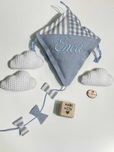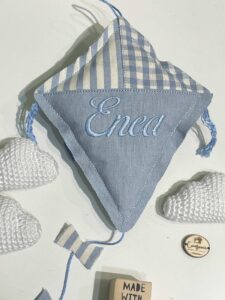 Creato in cotone tinto filo nei delicati toni del nuvola, con il nome del bimbo ricamato, è una bomboniera elegante e raffinata, ideale per celebrare con dolcezza i momenti più speciali.