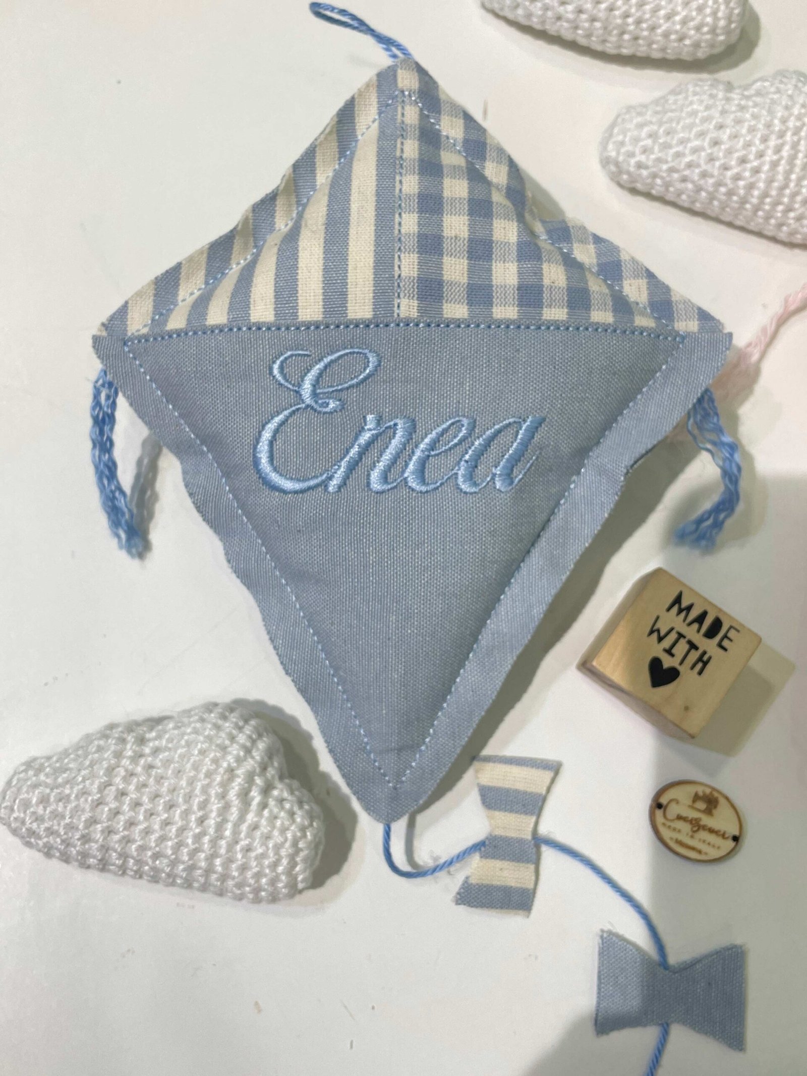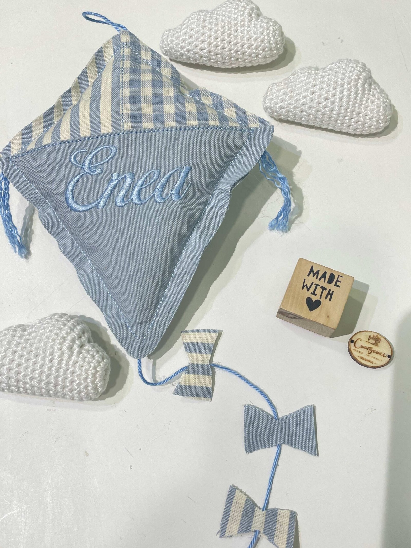 • Forma di aquilone, realizzato artigianalmente in cotone tinto filo nuvola