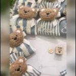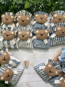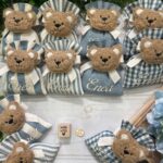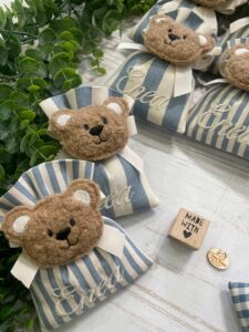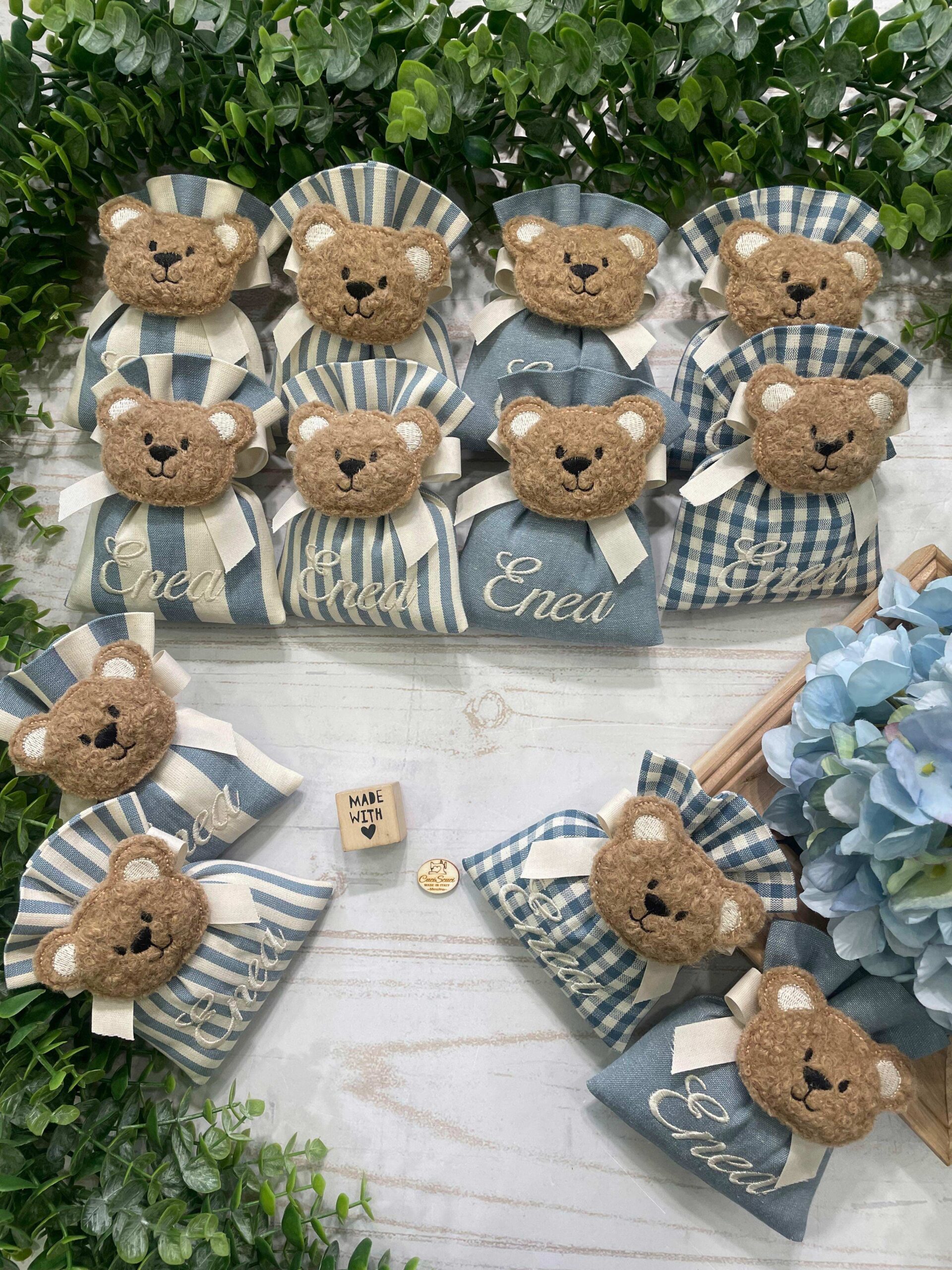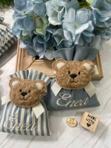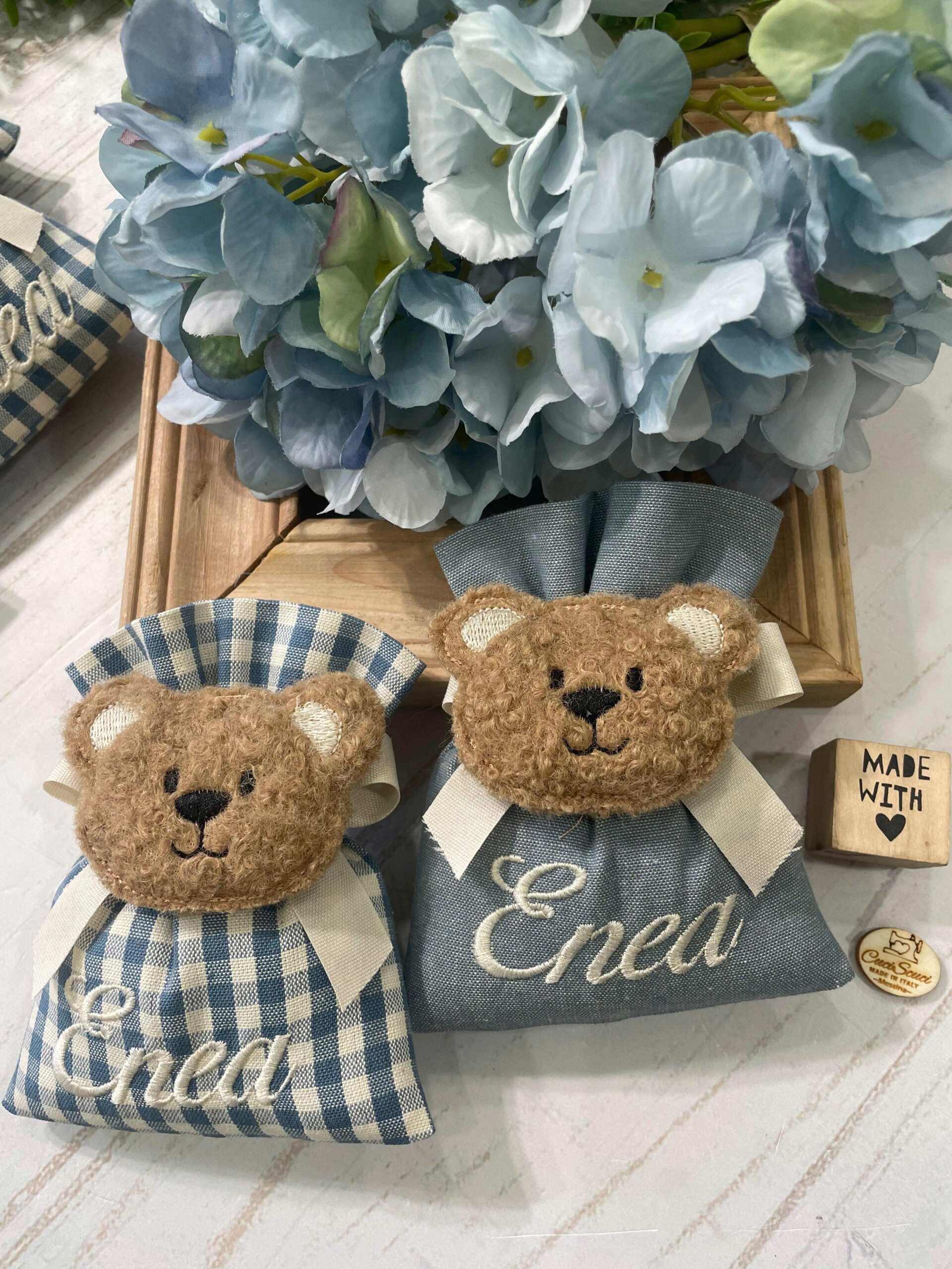• Confezionato – bomboniera pronta da donare, con sacchetto ricamato, imbottitura in ovatta, fiocco abbinato, 5 confetti in busta sigillata e applicazione orsetto calamita