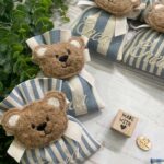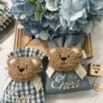 Confezionato in cotone tinto filo nei raffinati toni dell’azzurro polvere, in fantasie assortite o a scelta, è impreziosito dal ricamo di un nome e dall’applicazione di un tenero orsetto calamita in tessuto bouclè marrone o bianco.