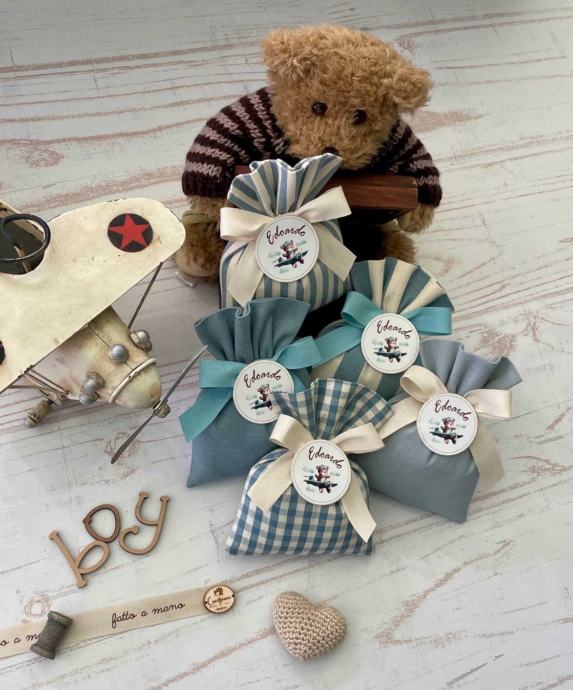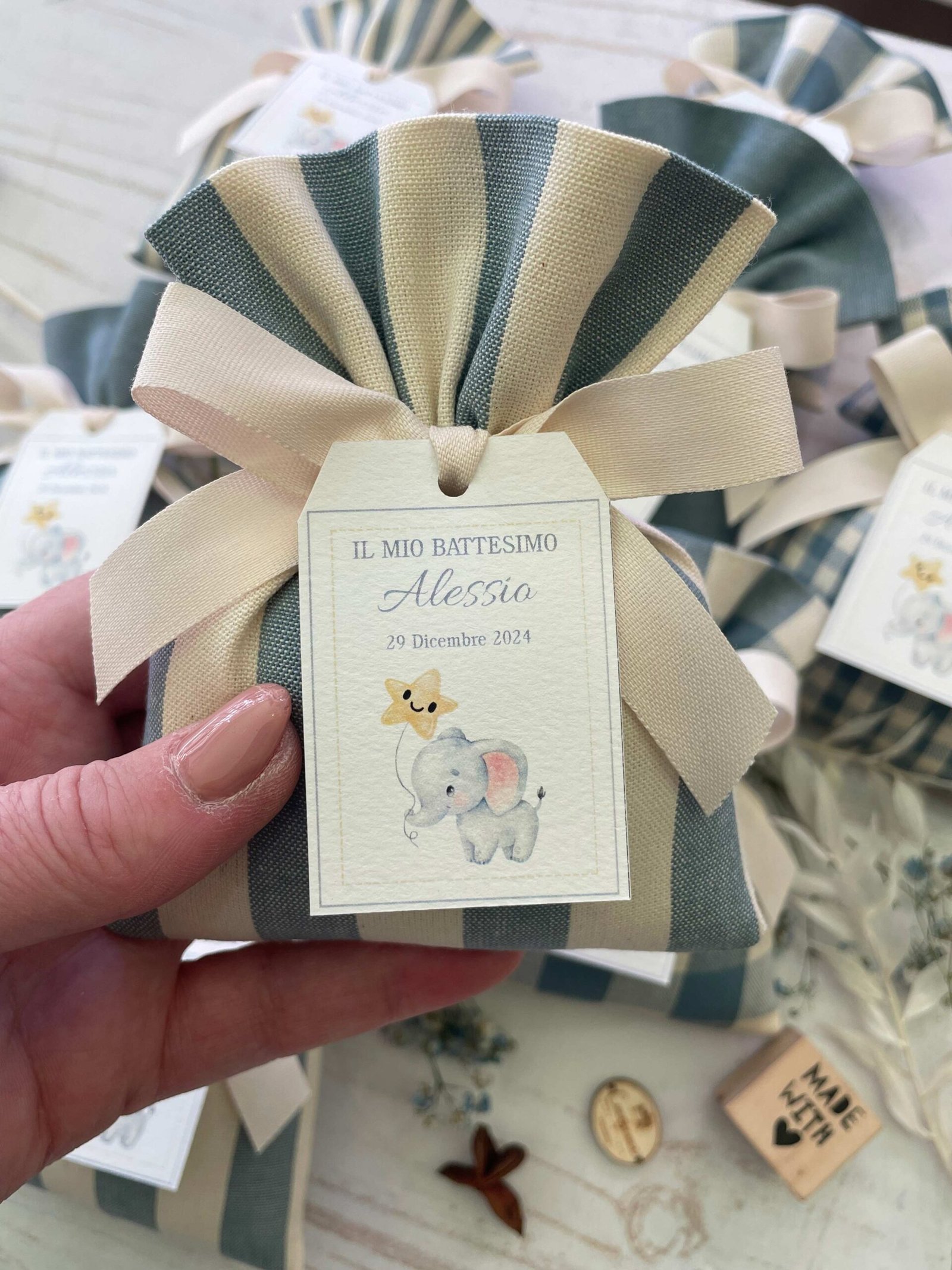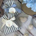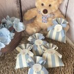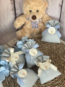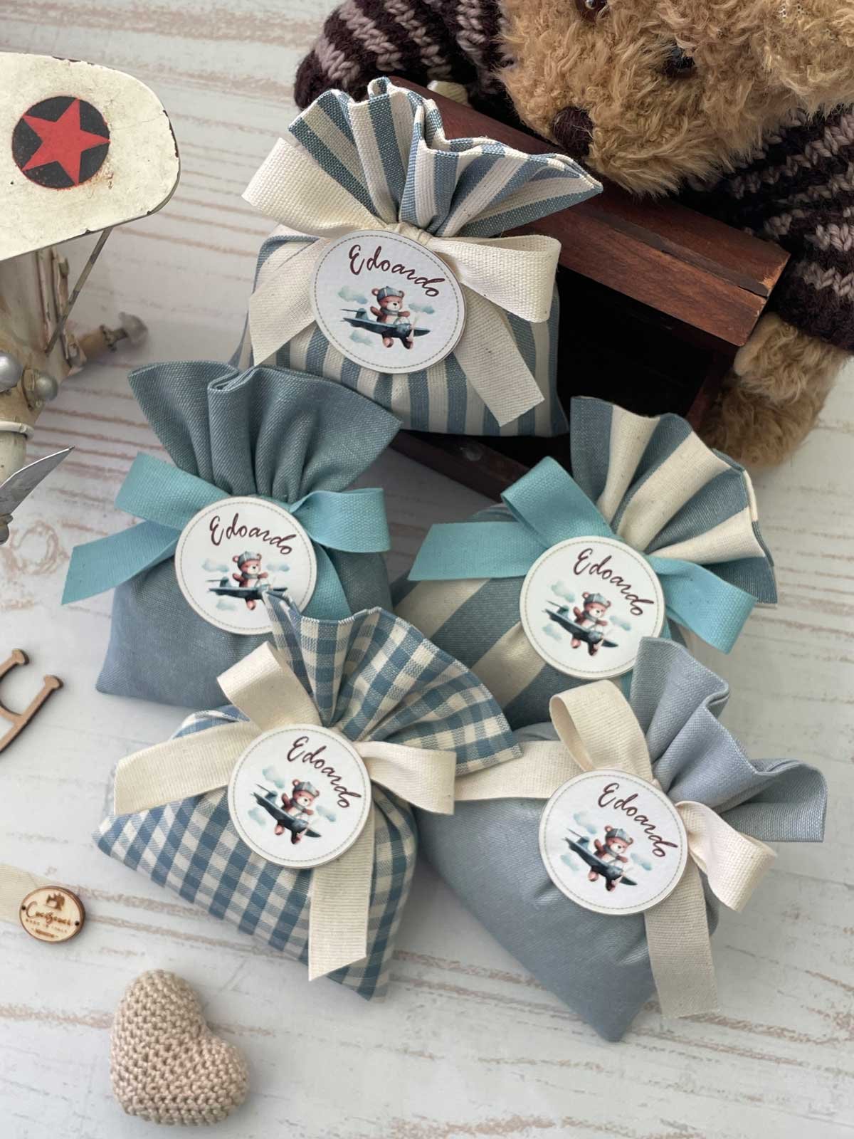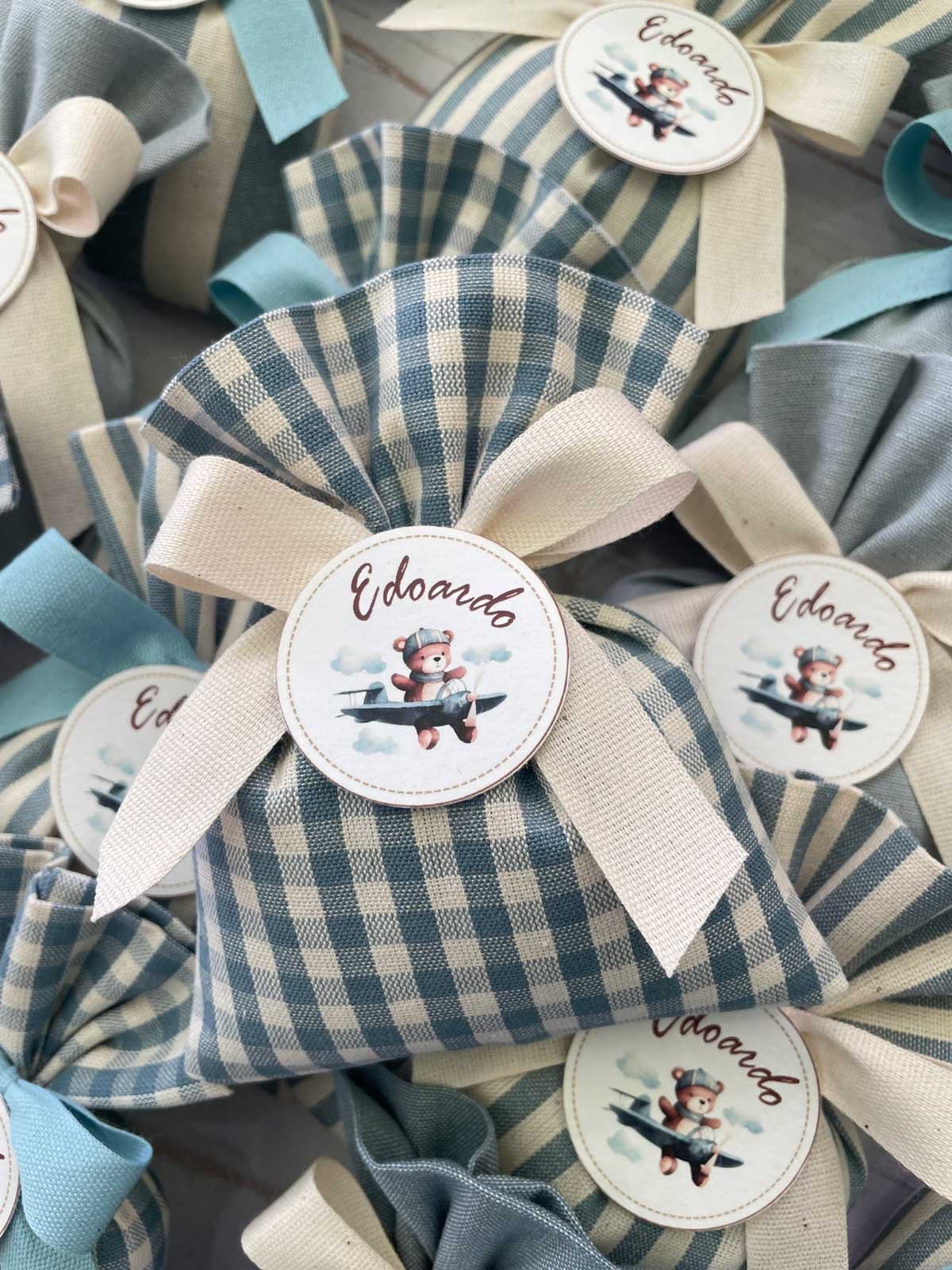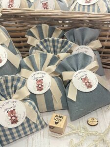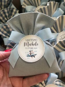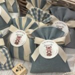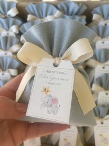 • Confezionato: bomboniera pronta da donare, completa di sacchetto imbottito in ovatta, fiocco abbinato e 5 confetti in busta sigillata.