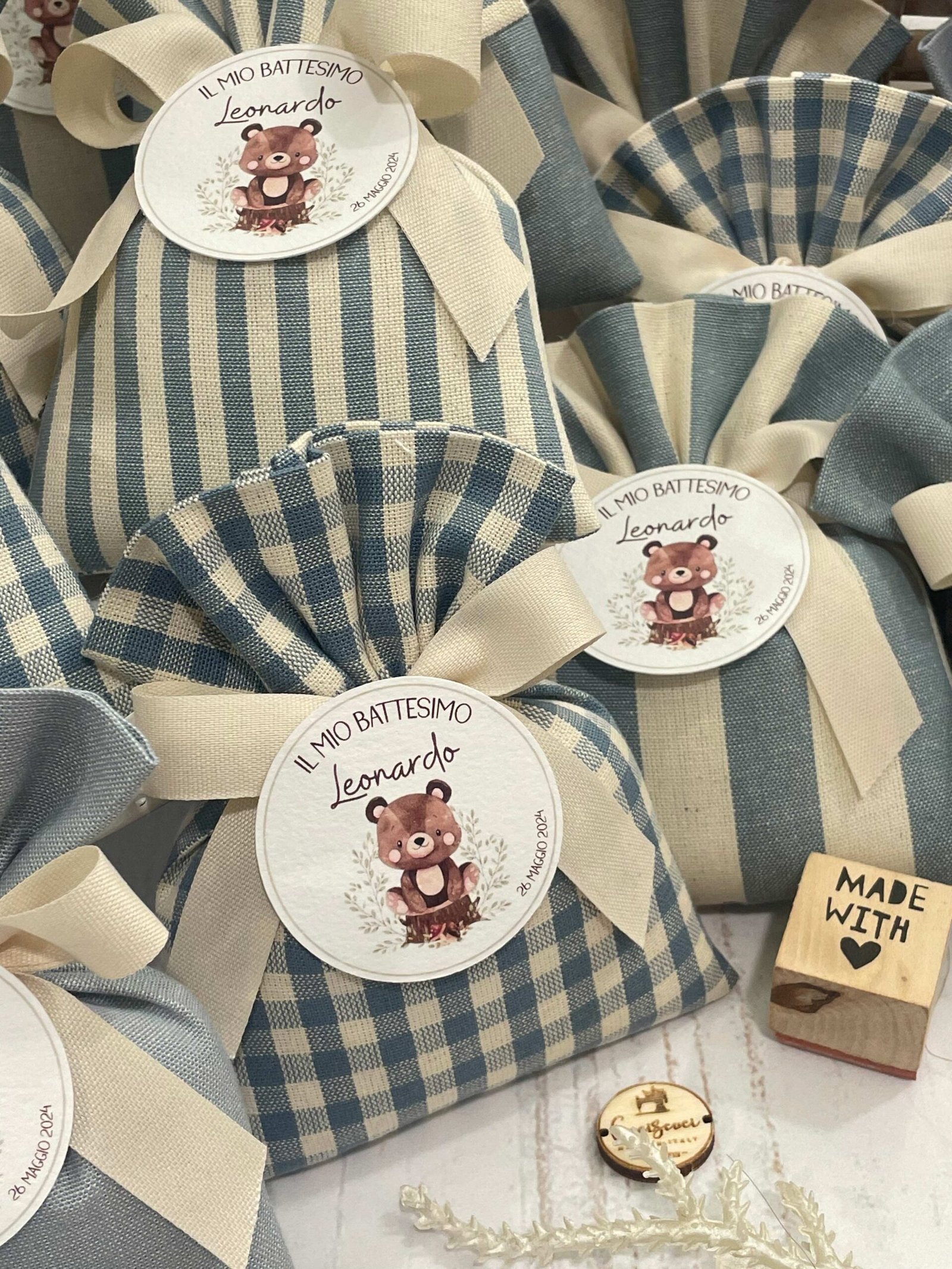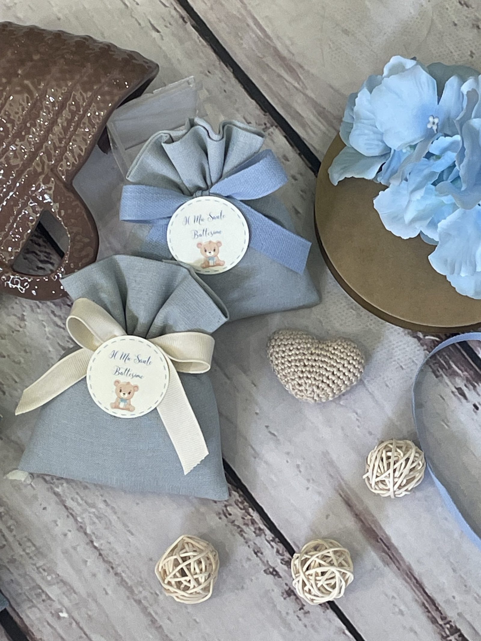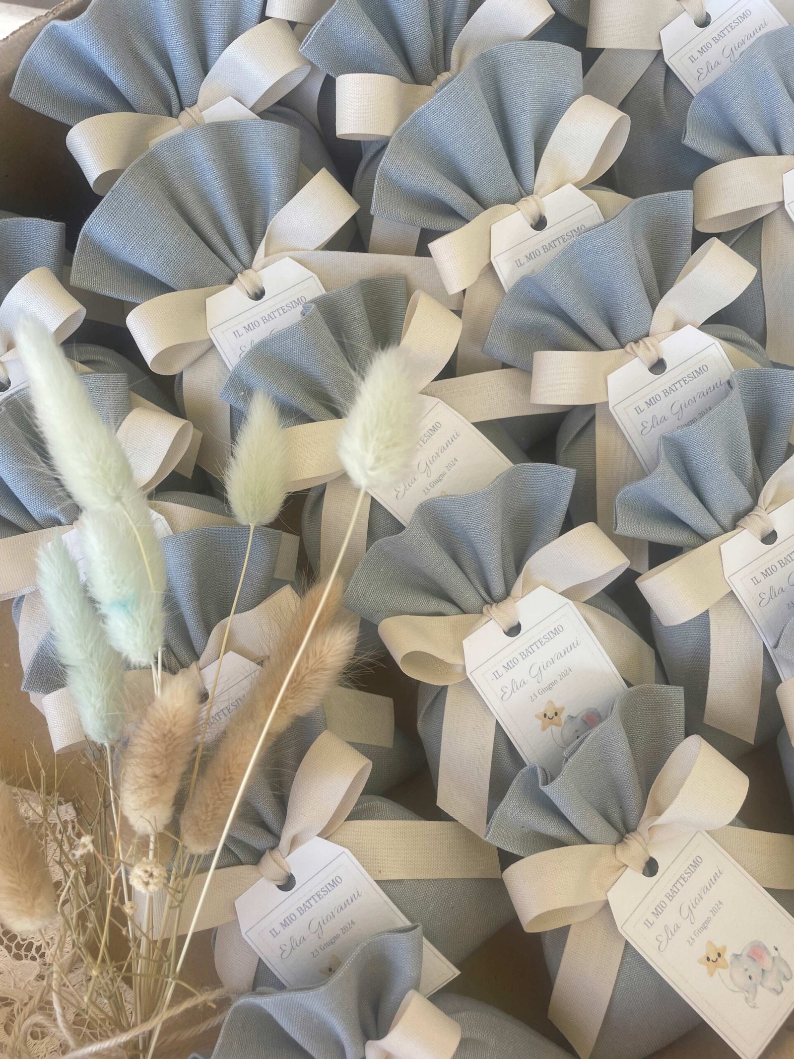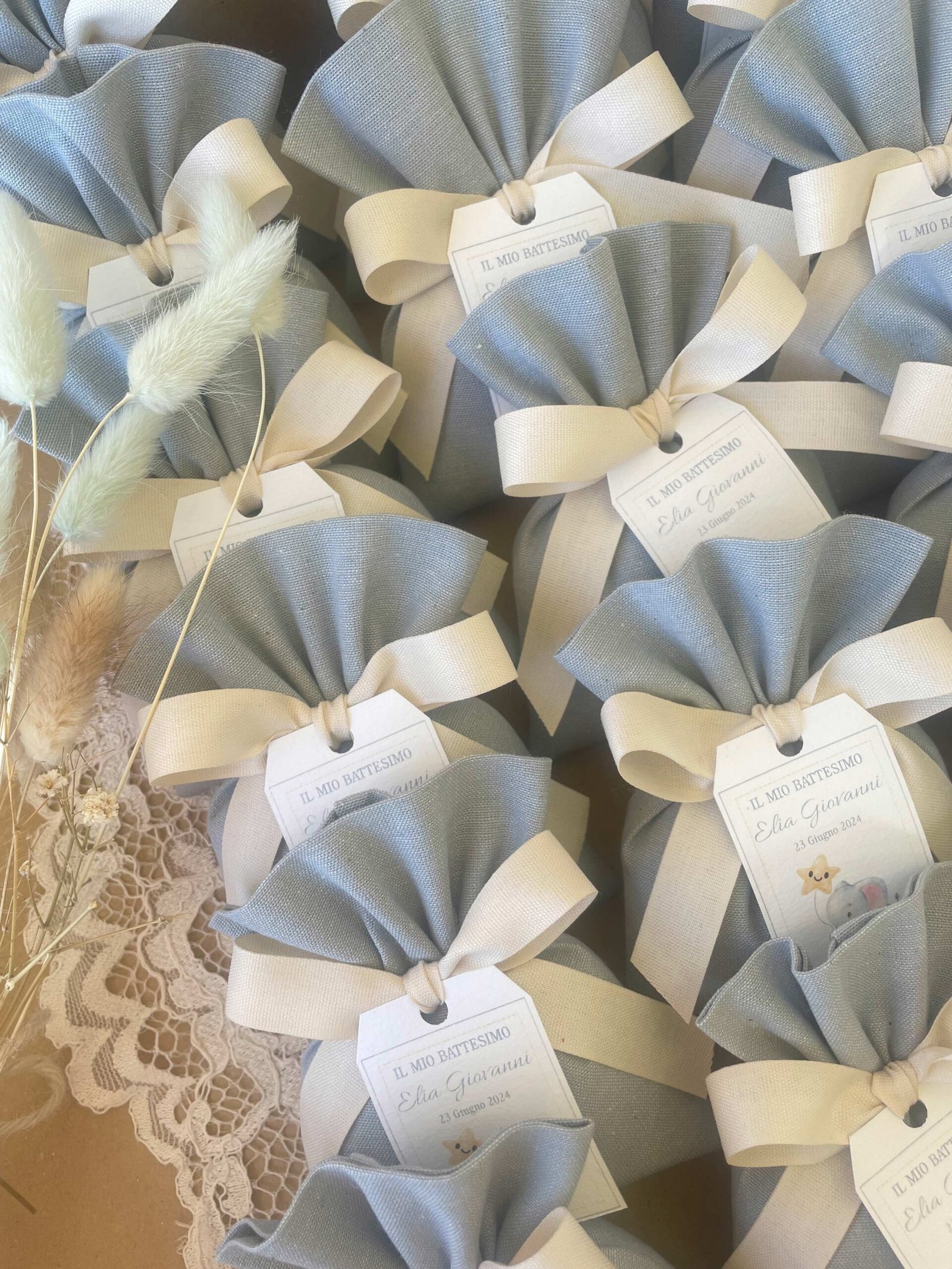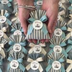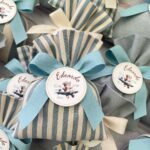 • Confezionato: bomboniera pronta da donare, completa di sacchetto imbottito in ovatta, fiocco abbinato e 5 confetti in busta sigillata.
