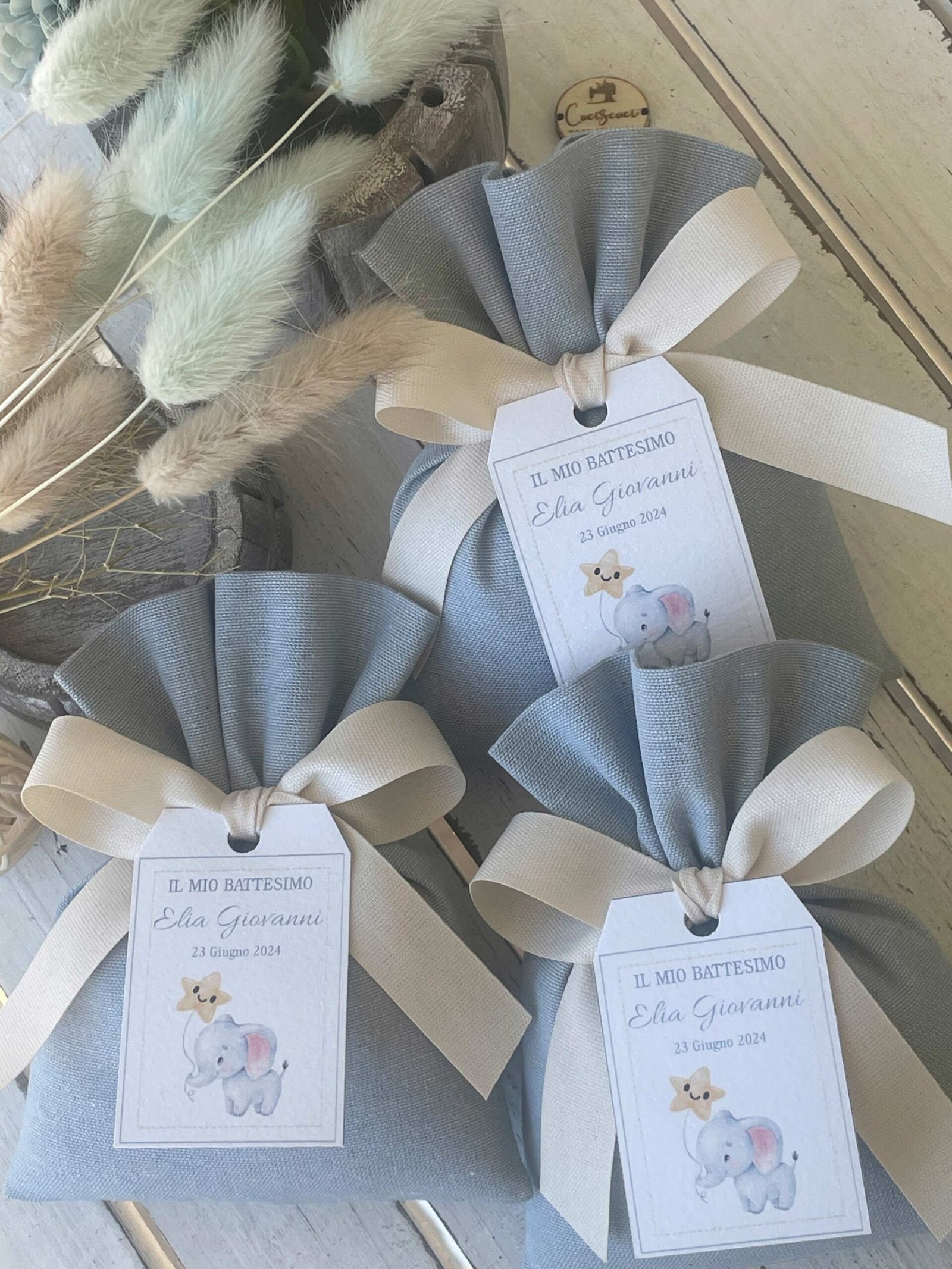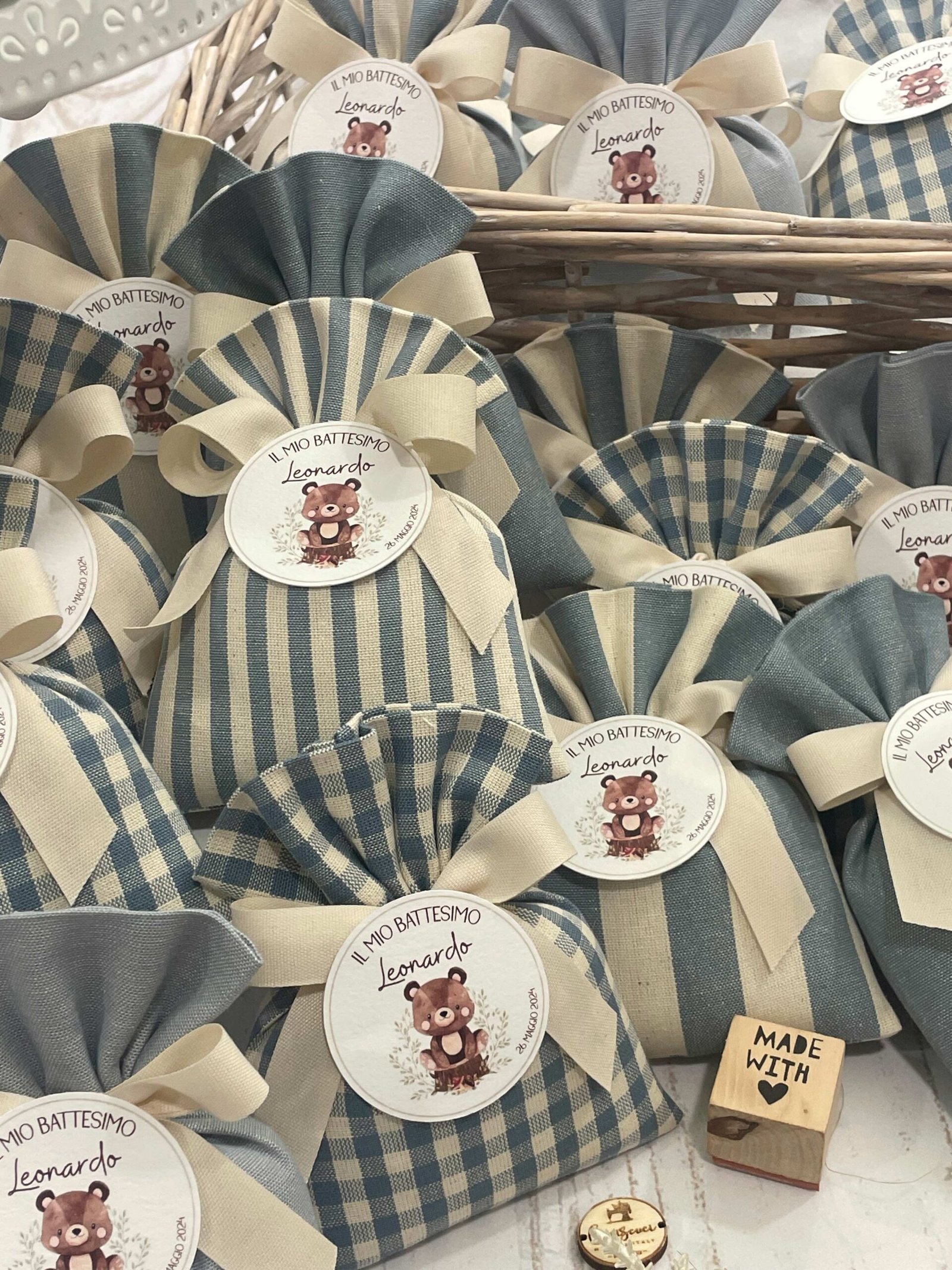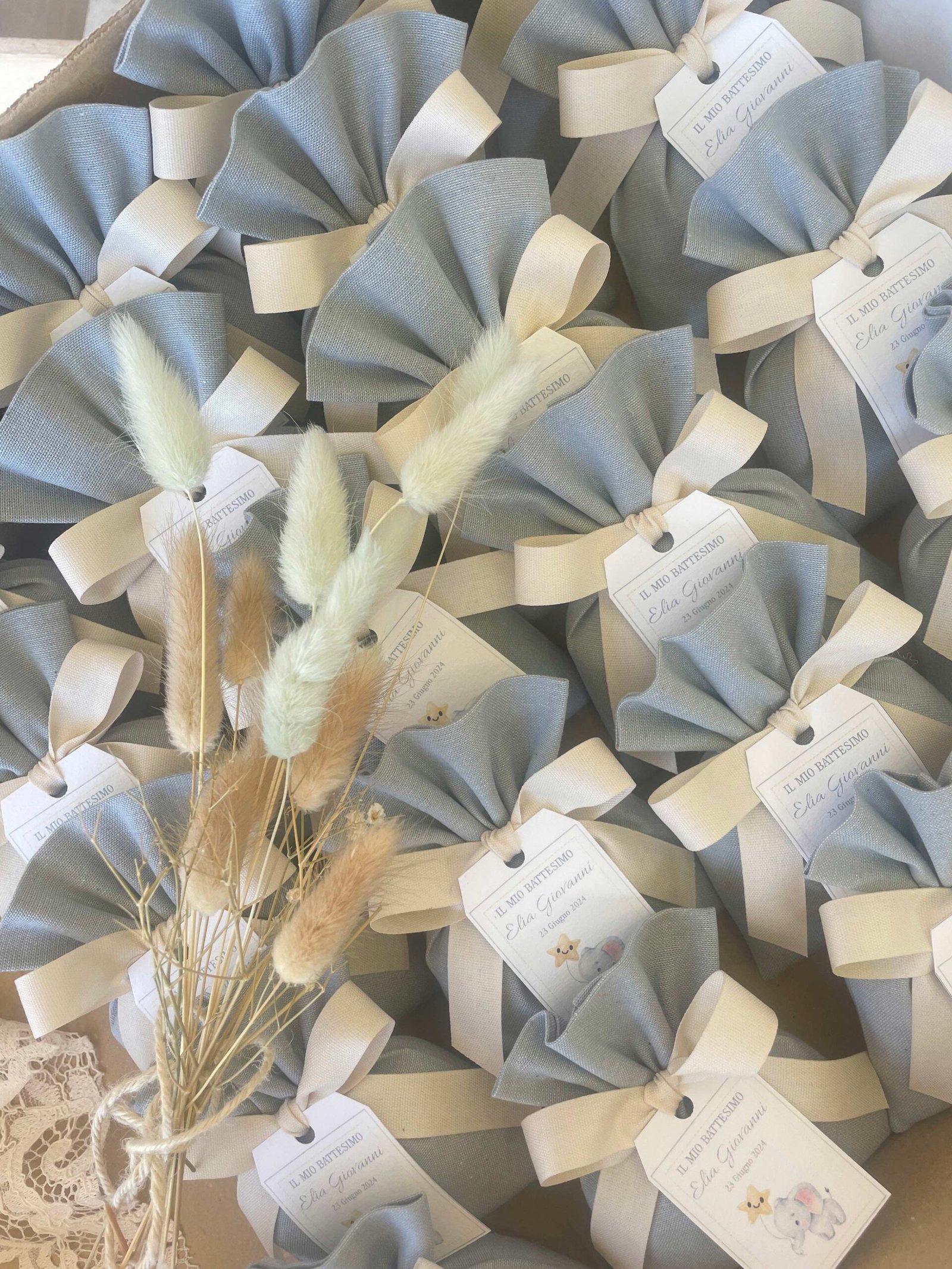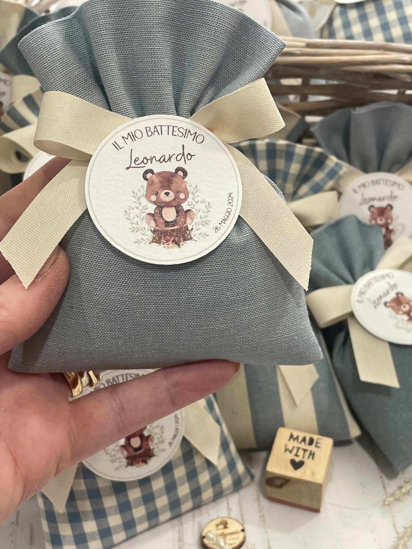 • Confezionato: bomboniera pronta da donare, completa di sacchetto imbottito in ovatta, fiocco abbinato e 5 confetti in busta sigillata.