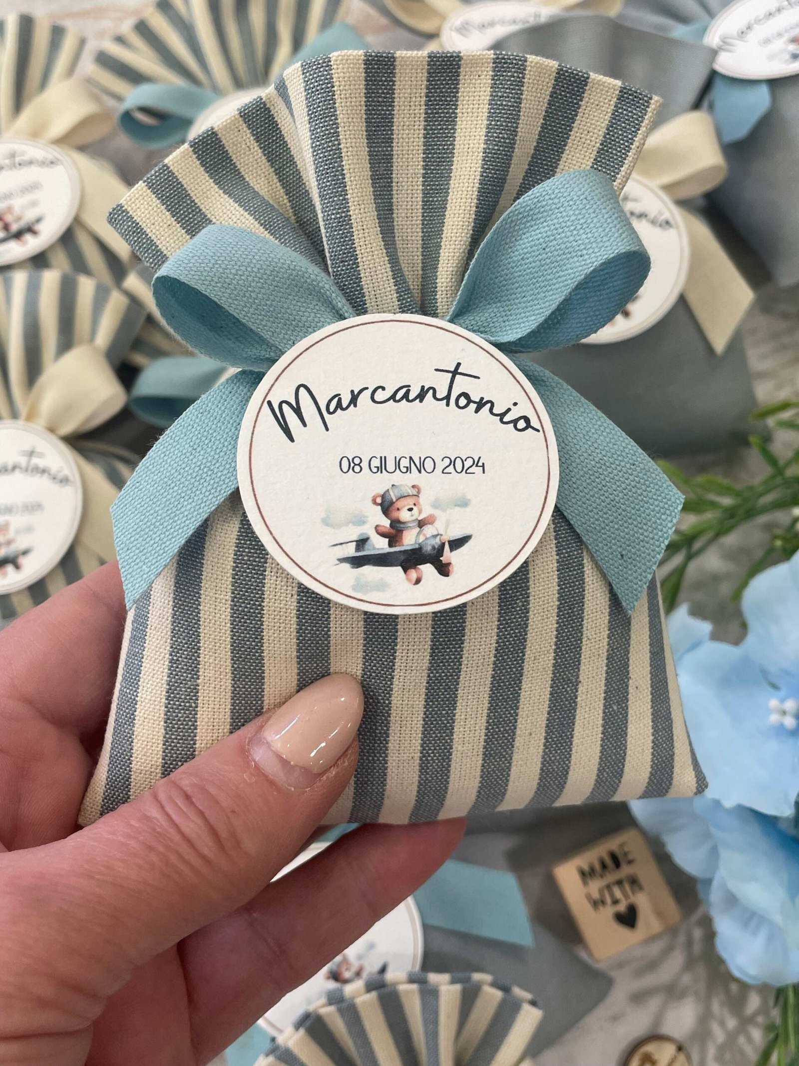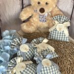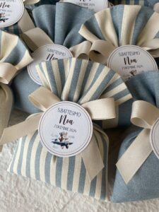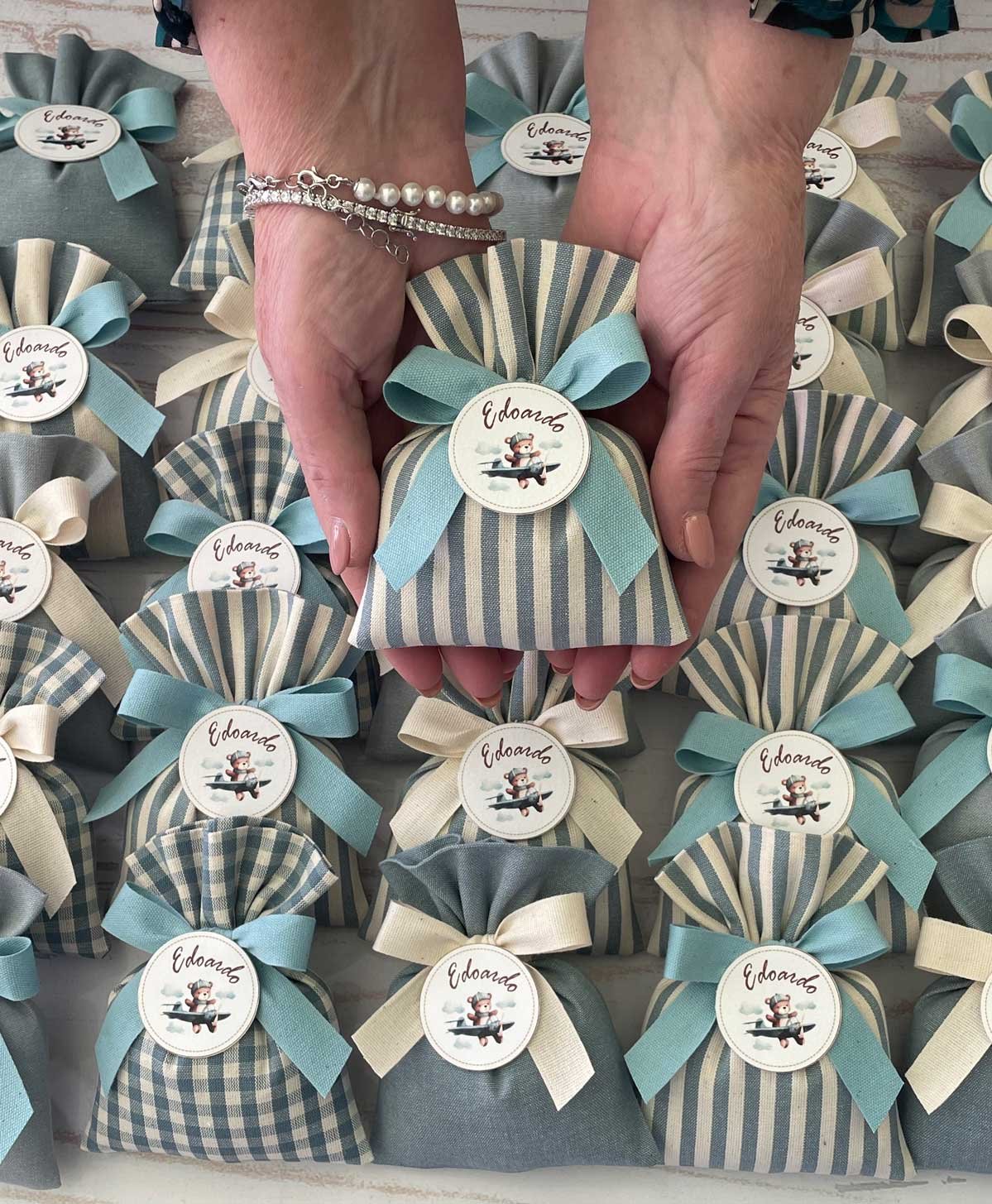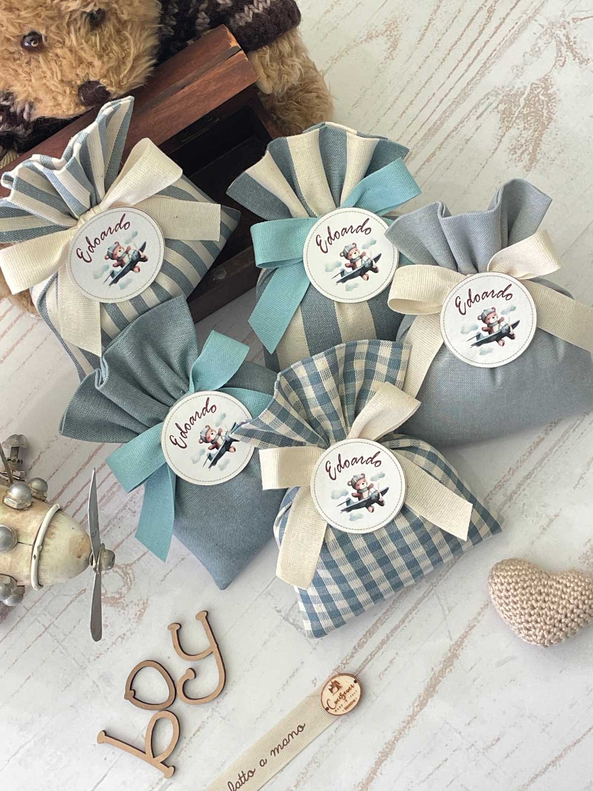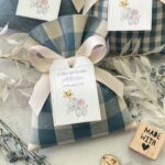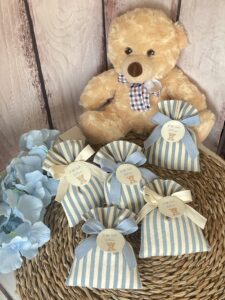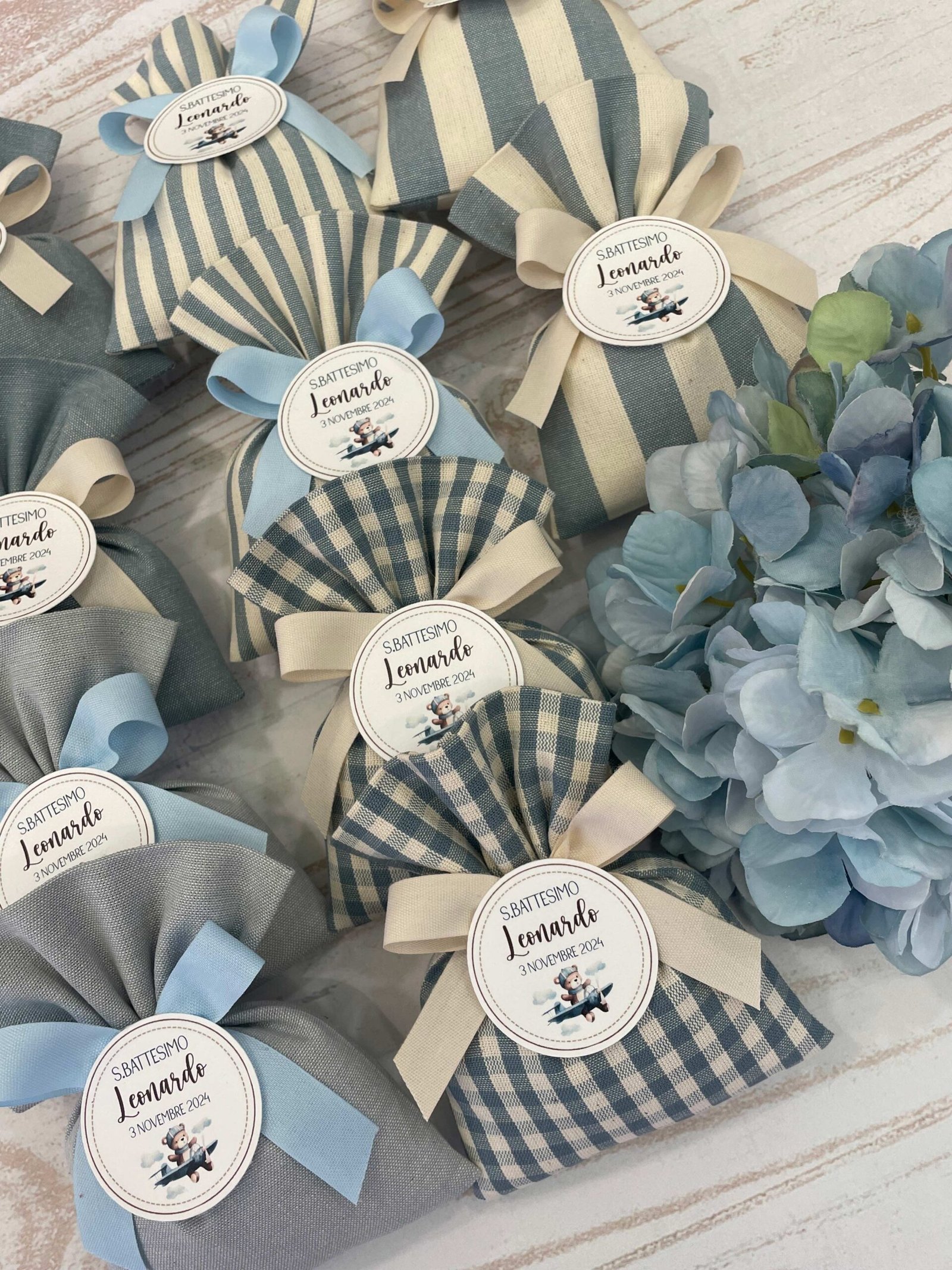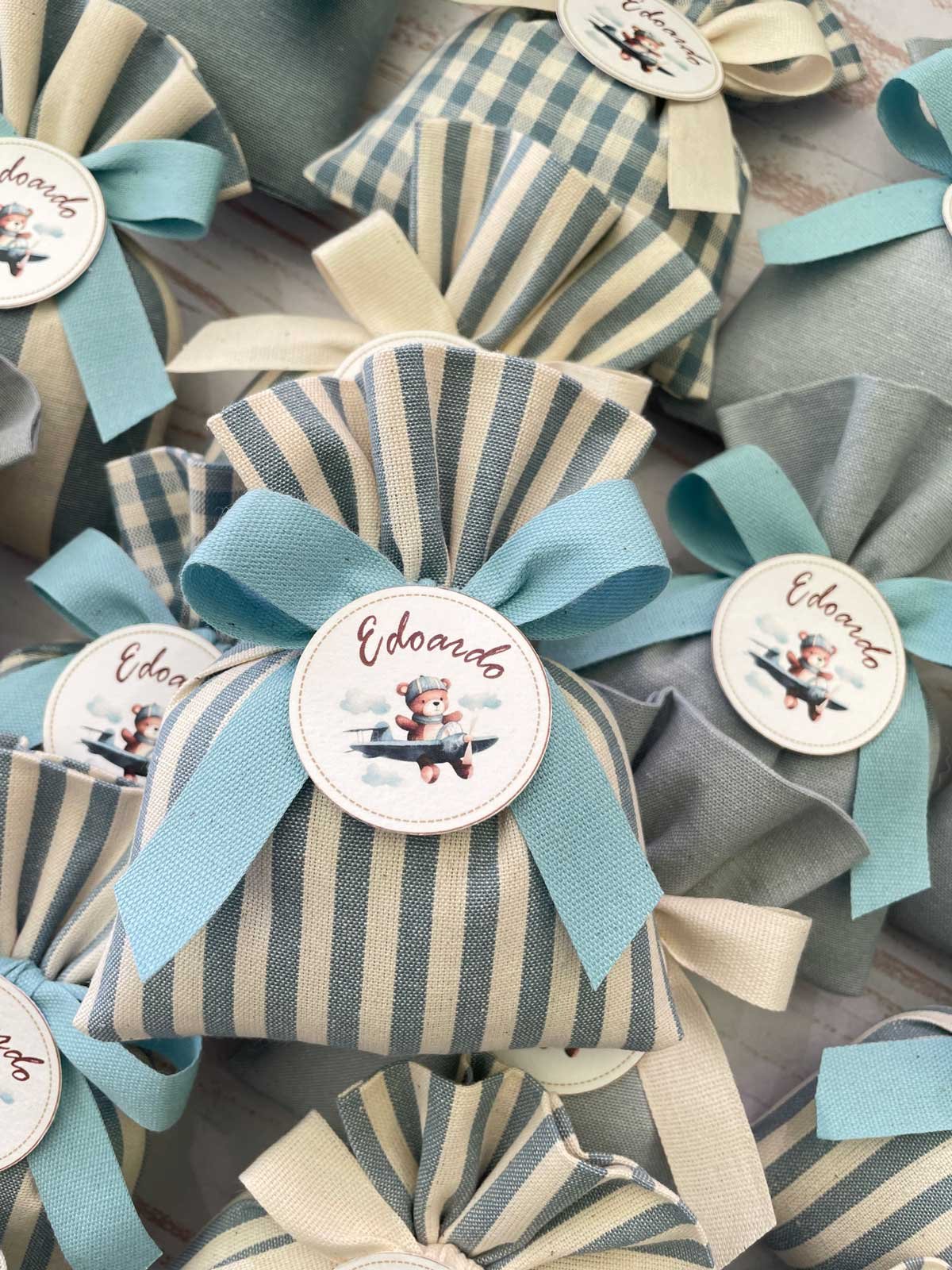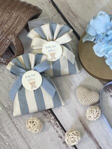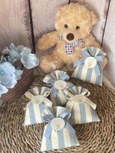 Confezionata in cotone tinto filo, disponibile in fantasie assortite (o a scelta) nei delicati toni dell’azzurro polvere, rappresenta un dono raffinato e originale per le tue occasioni speciali.
