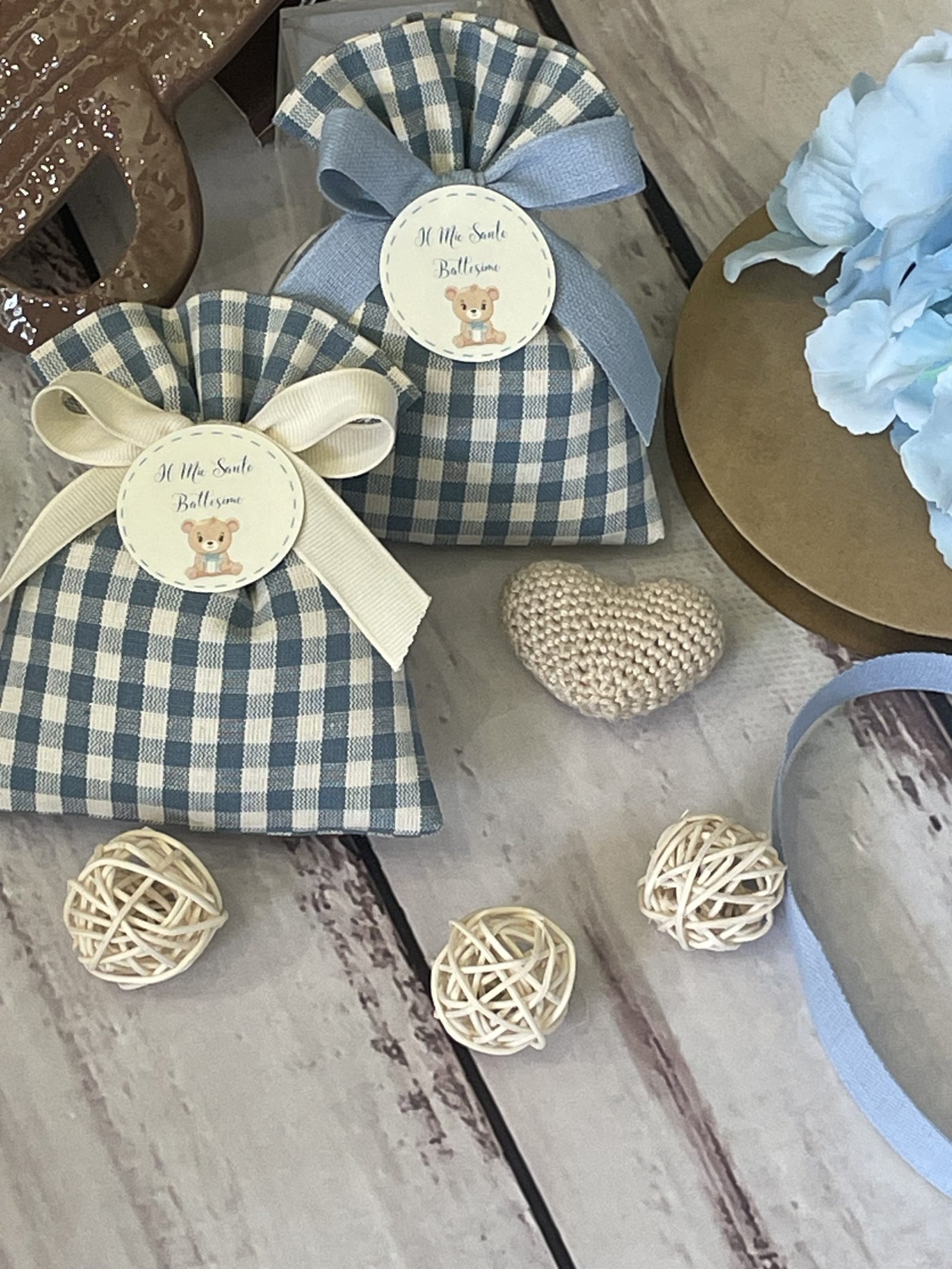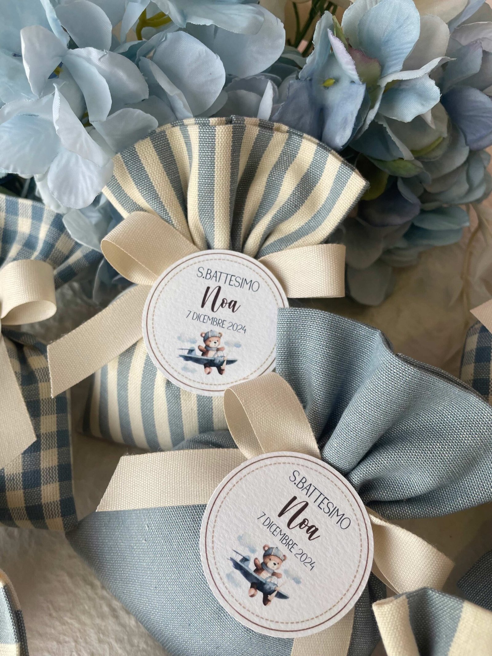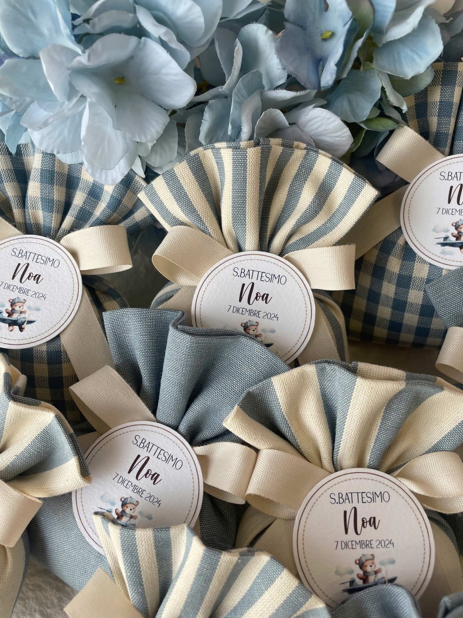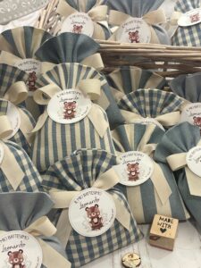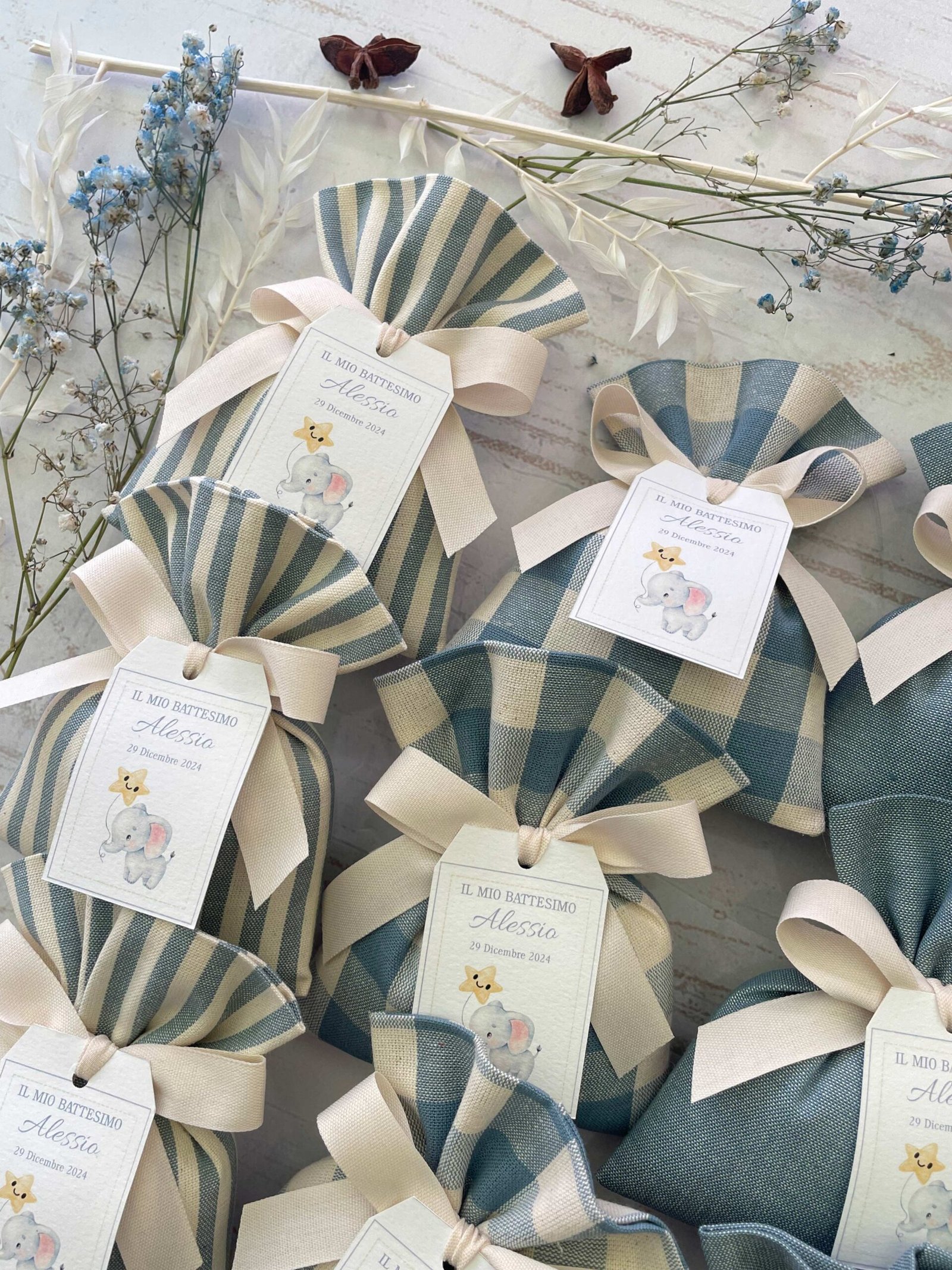 Confezionata in cotone tinto filo, disponibile in fantasie assortite (o a scelta) nei delicati toni dell’azzurro polvere, rappresenta un dono raffinato e originale per le tue occasioni speciali.