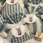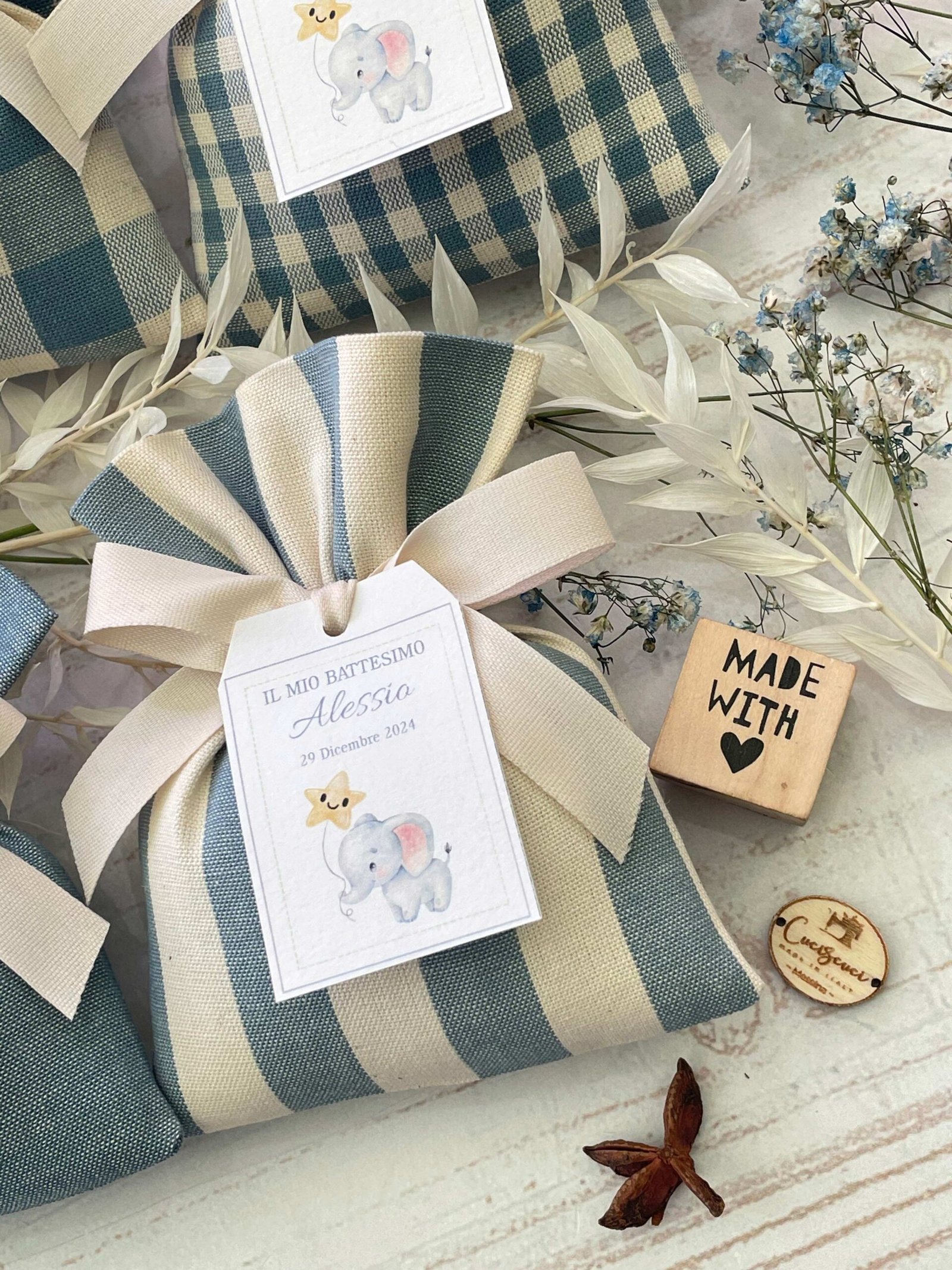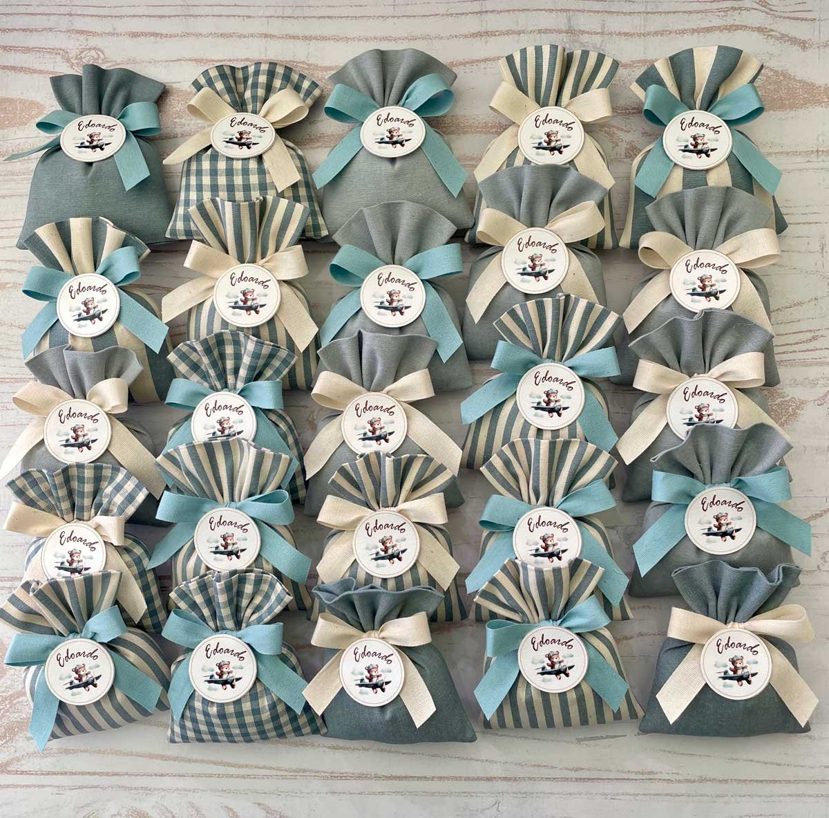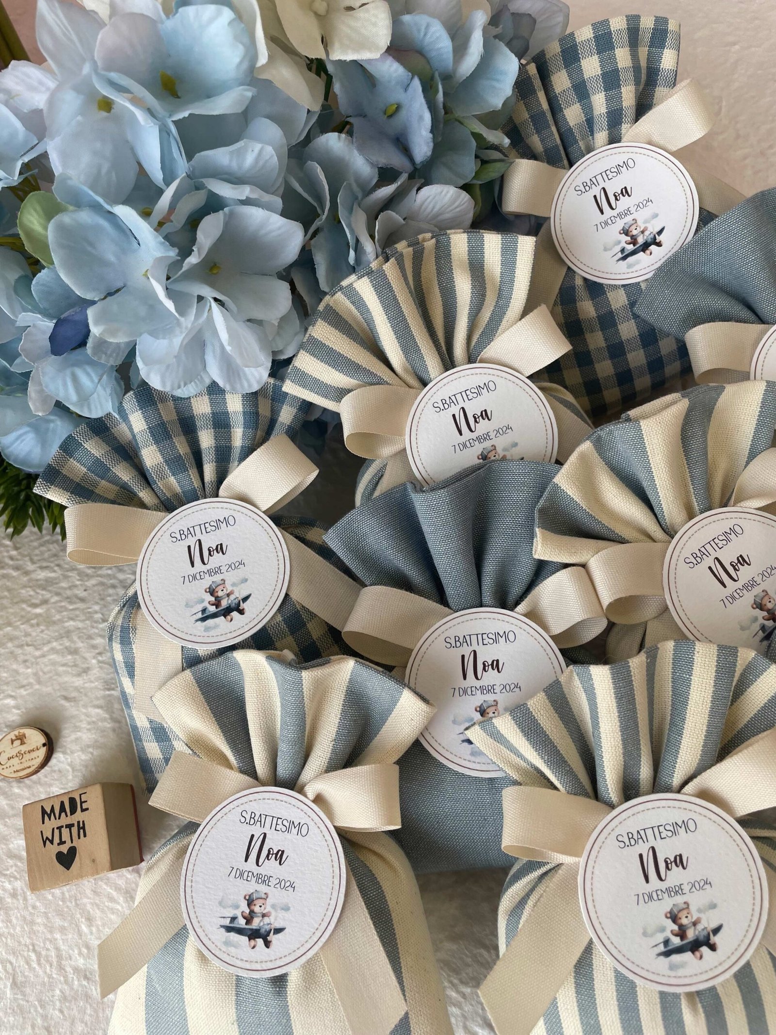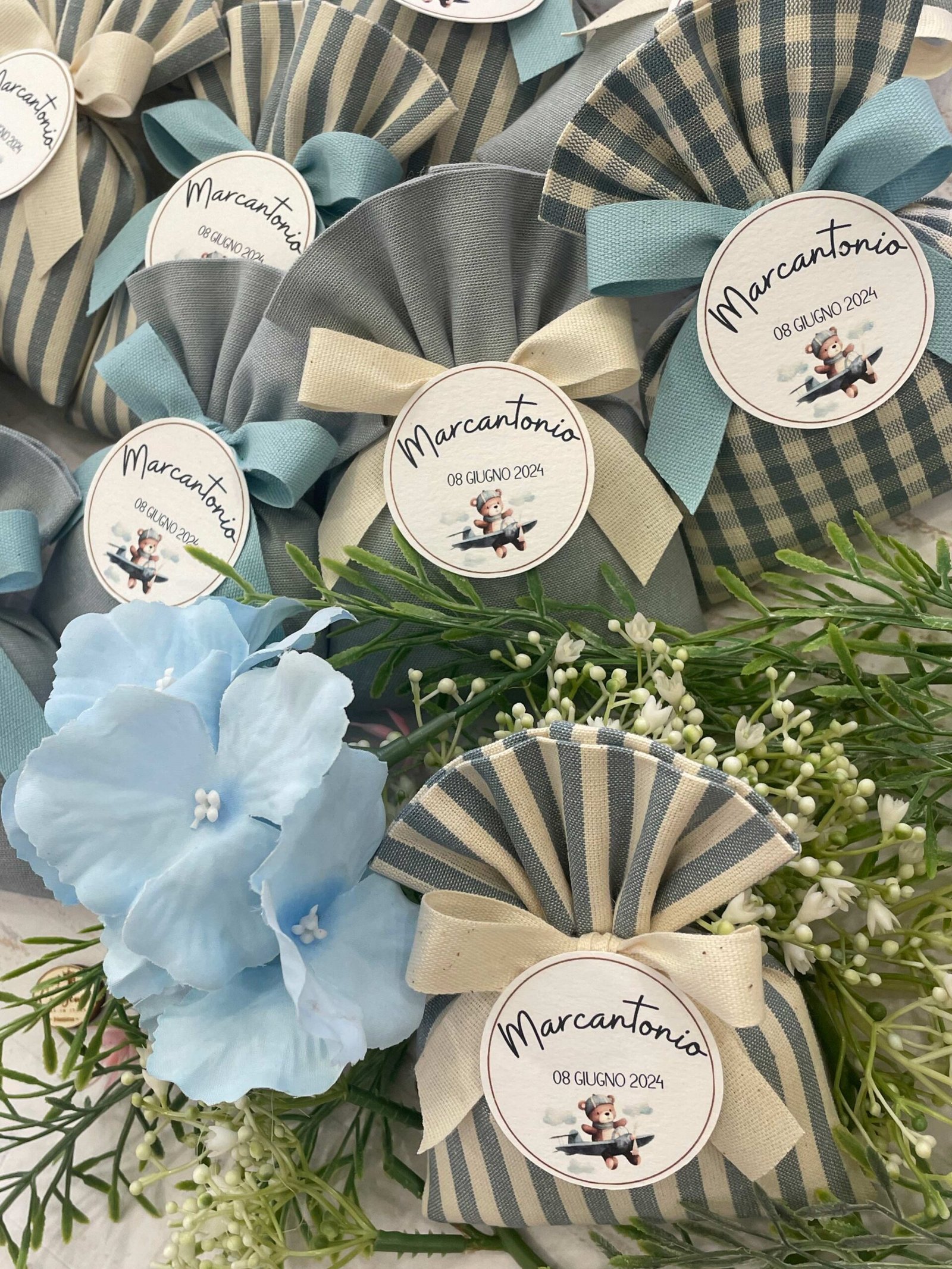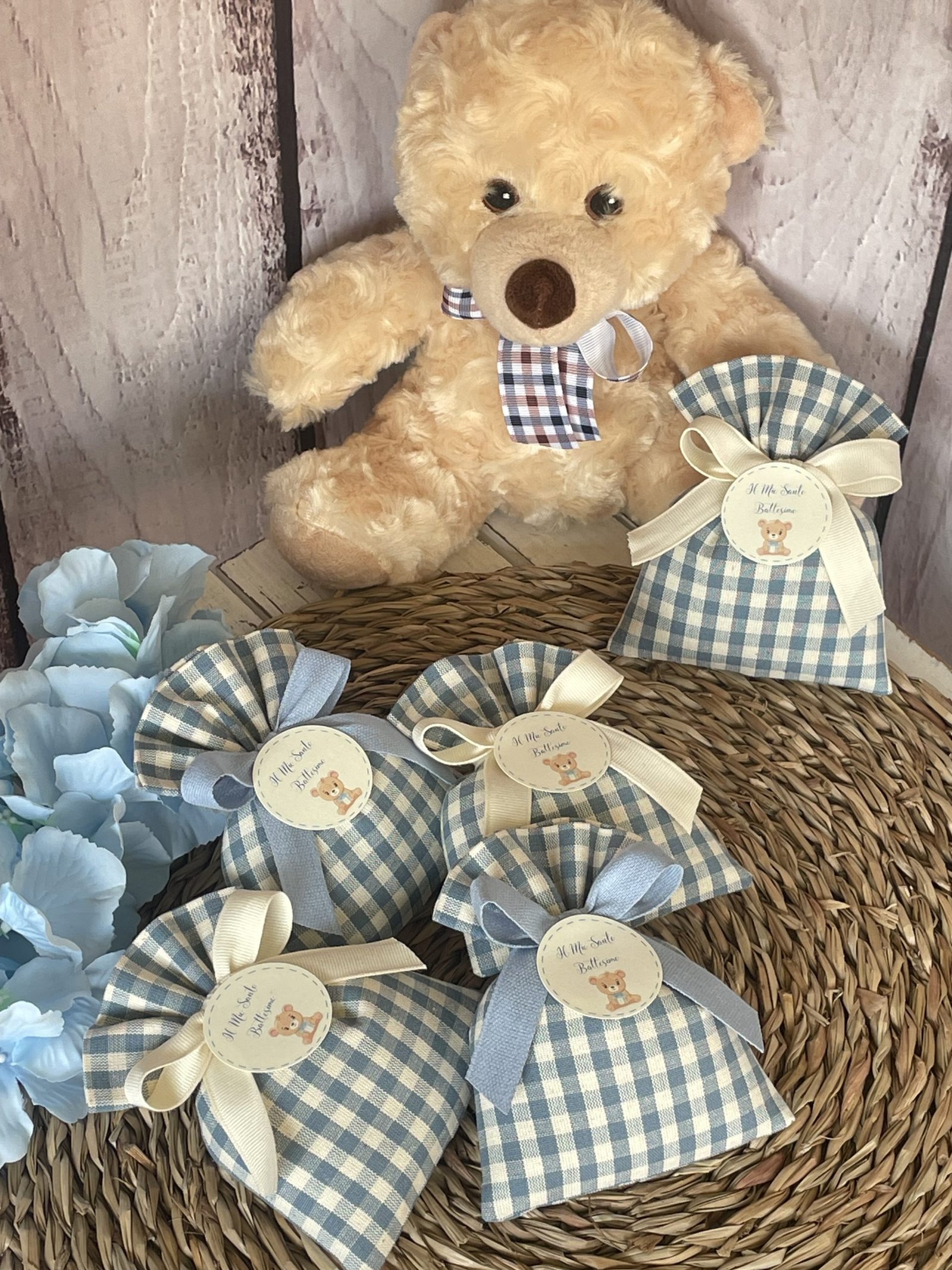 Confezionata in cotone tinto filo, disponibile in fantasie assortite (o a scelta) nei delicati toni dell’azzurro polvere, rappresenta un dono raffinato e originale per le tue occasioni speciali.