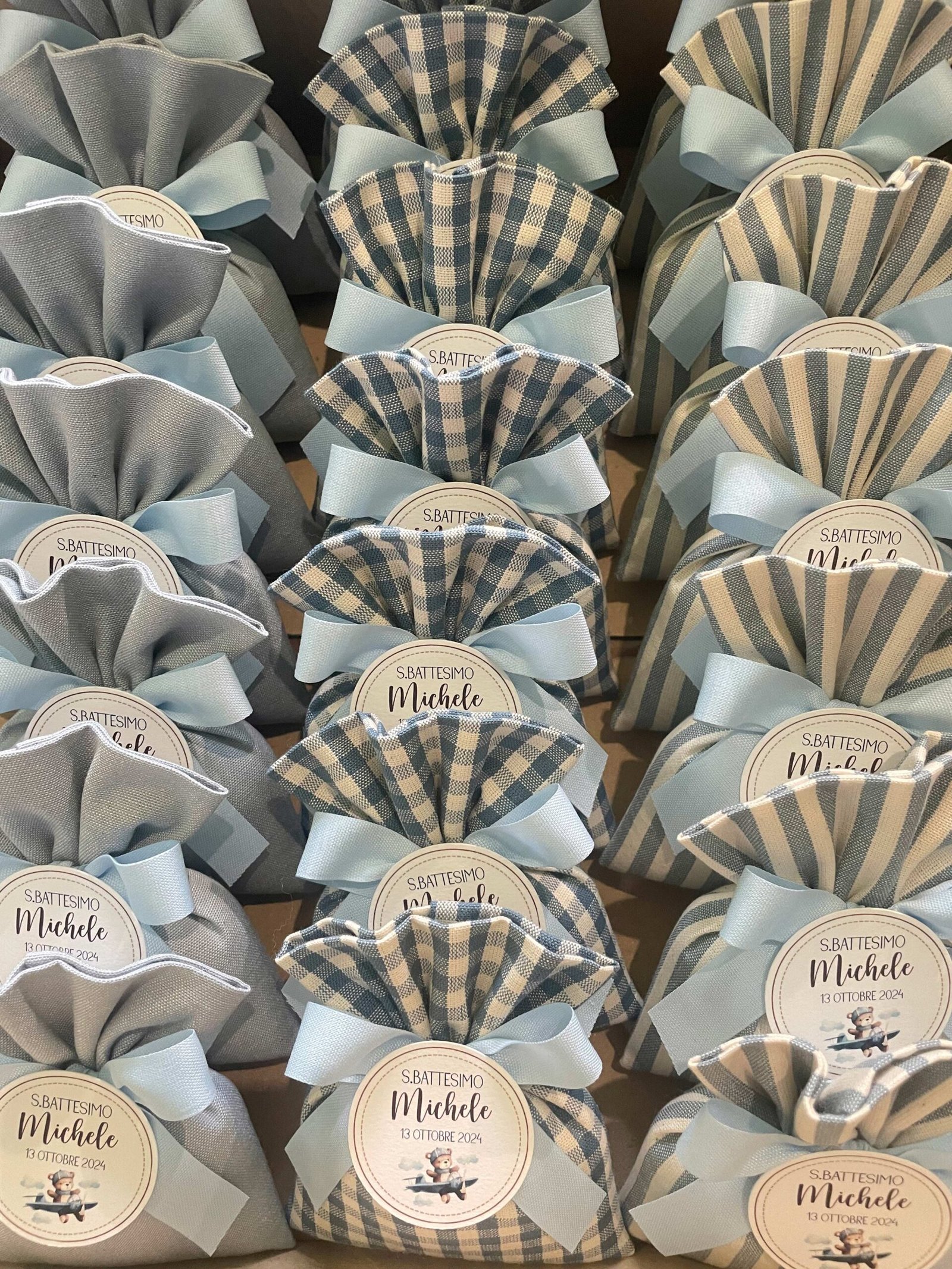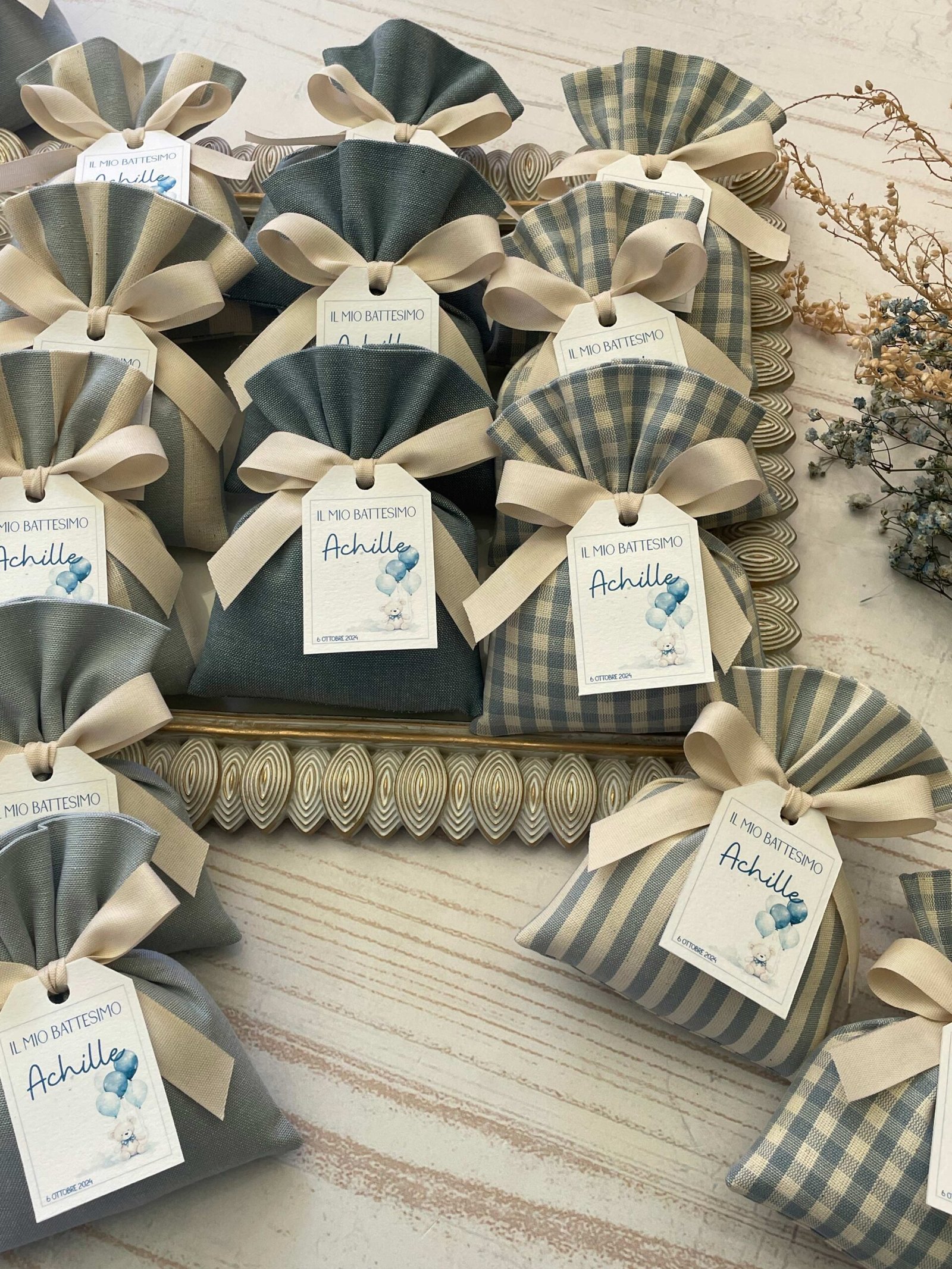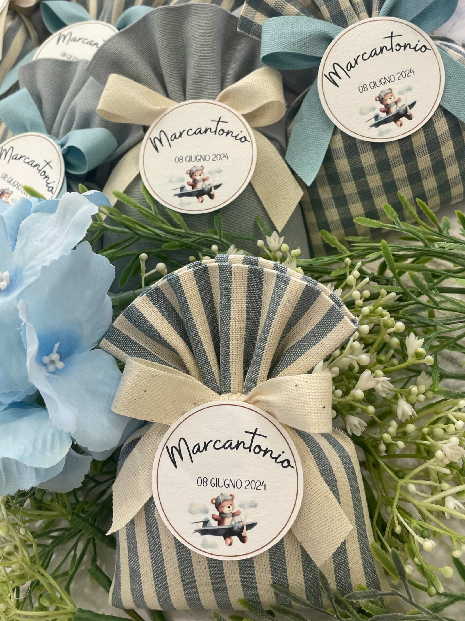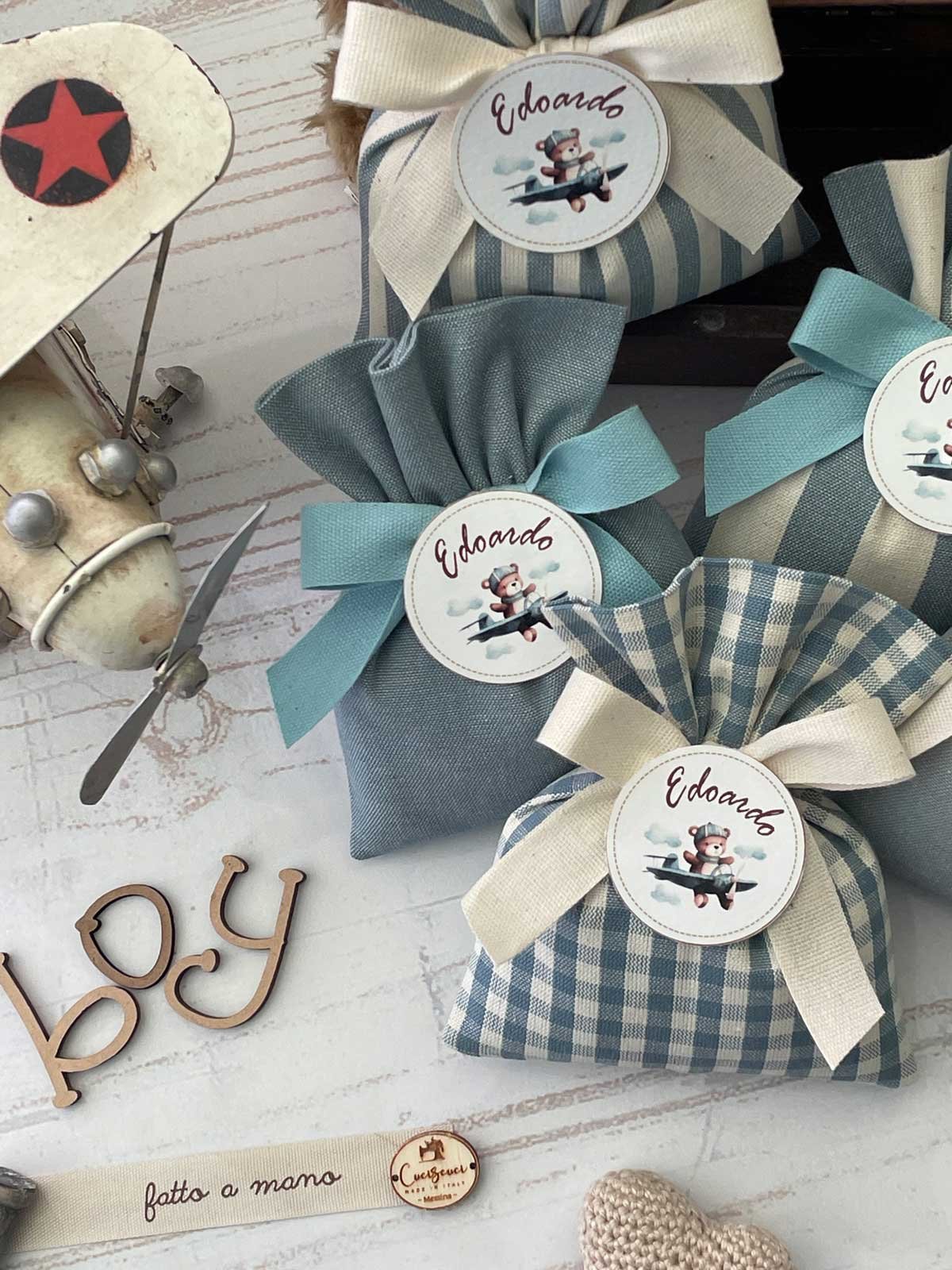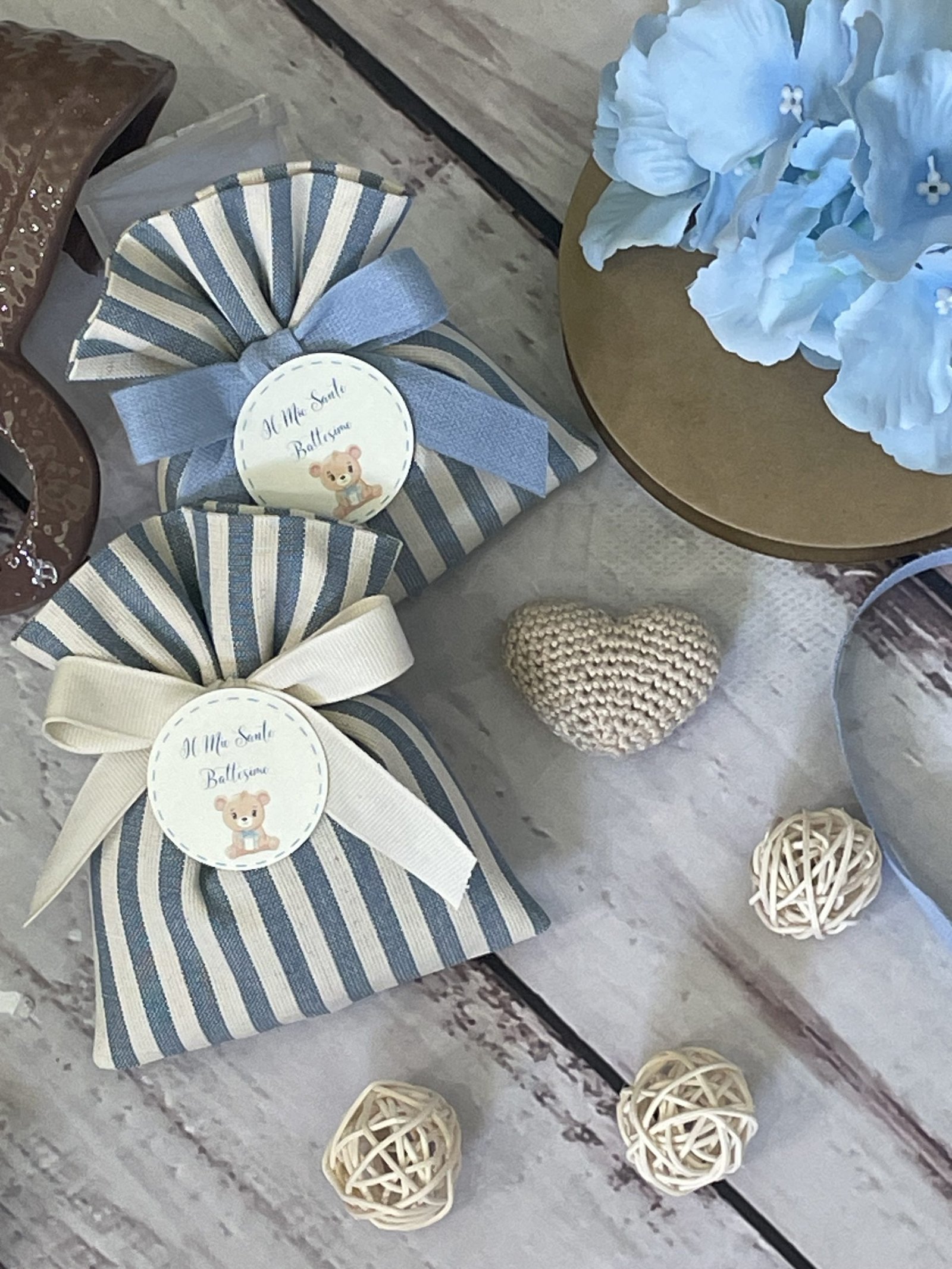 Confezionata in cotone tinto filo, disponibile in fantasie assortite (o a scelta) nei delicati toni dell’azzurro polvere, rappresenta un dono raffinato e originale per le tue occasioni speciali.