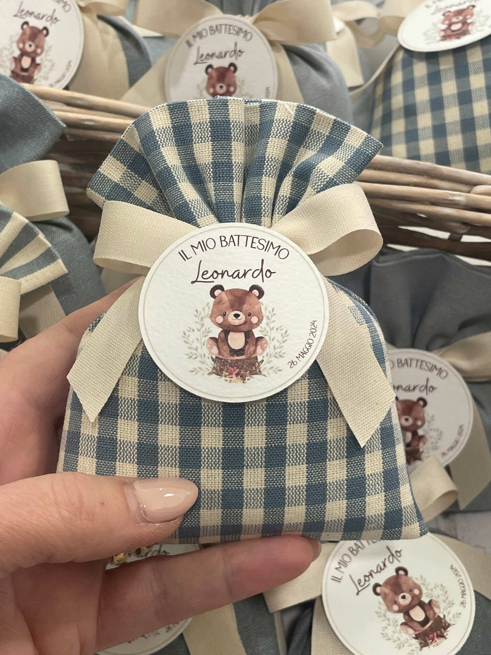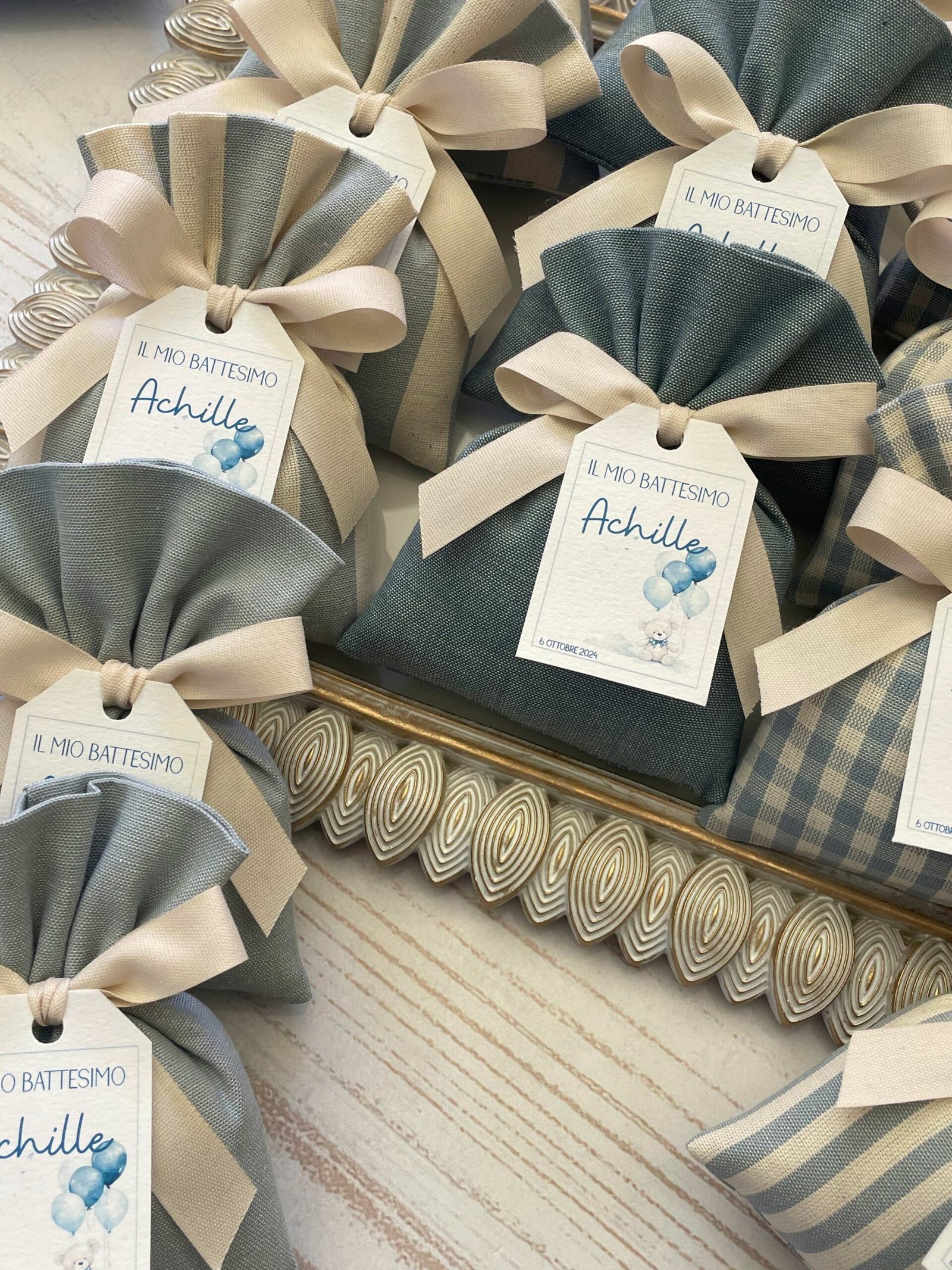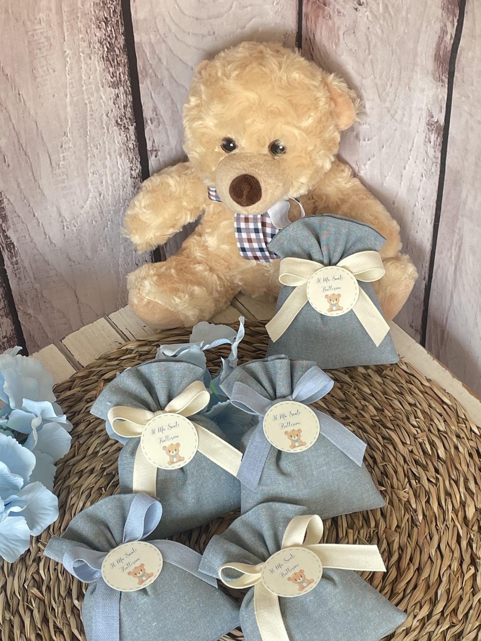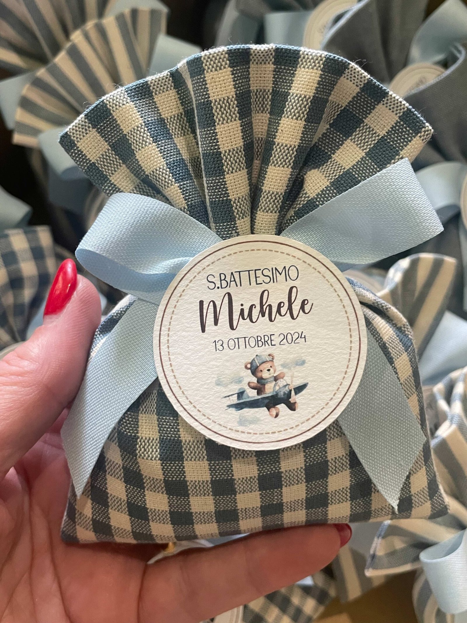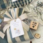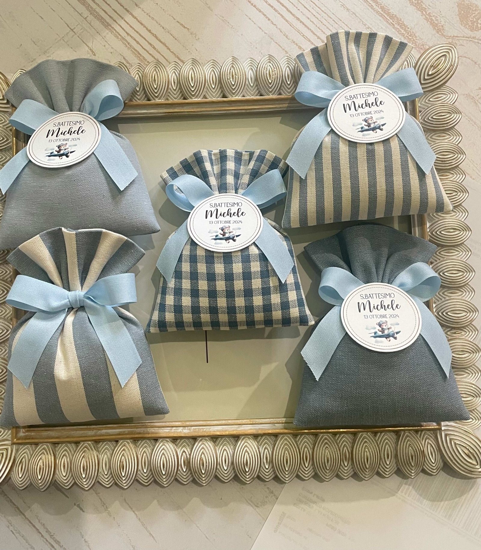 Confezionata in cotone tinto filo, disponibile in fantasie assortite (o a scelta) nei delicati toni dell’azzurro polvere, rappresenta un dono raffinato e originale per le tue occasioni speciali.