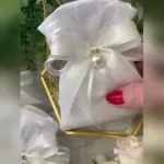Il sacchetto, confezionato in tela boston bianco, è impreziosito da una delicata perla con strass, che dona un tocco luminoso e raffinato alla composizione.