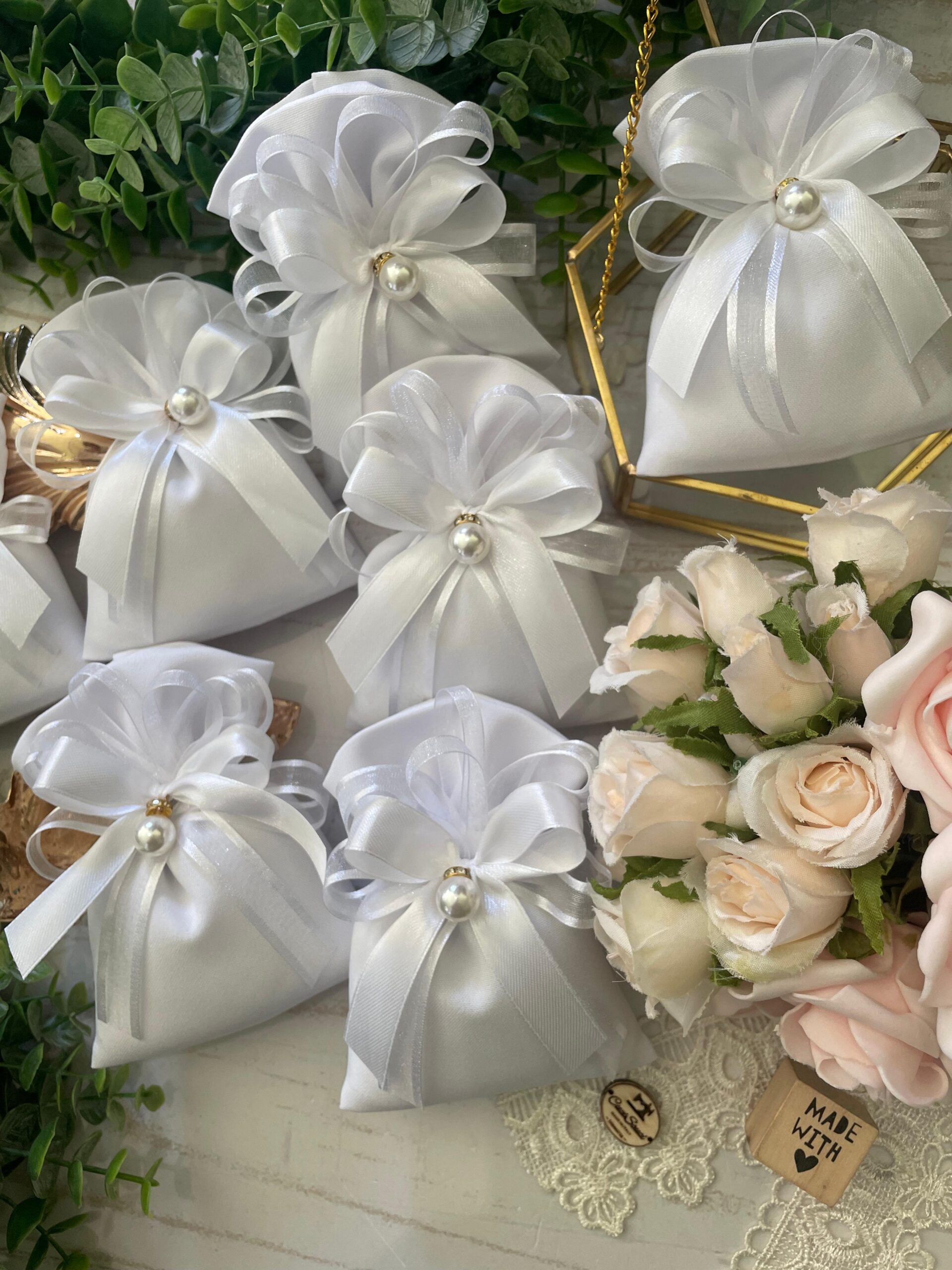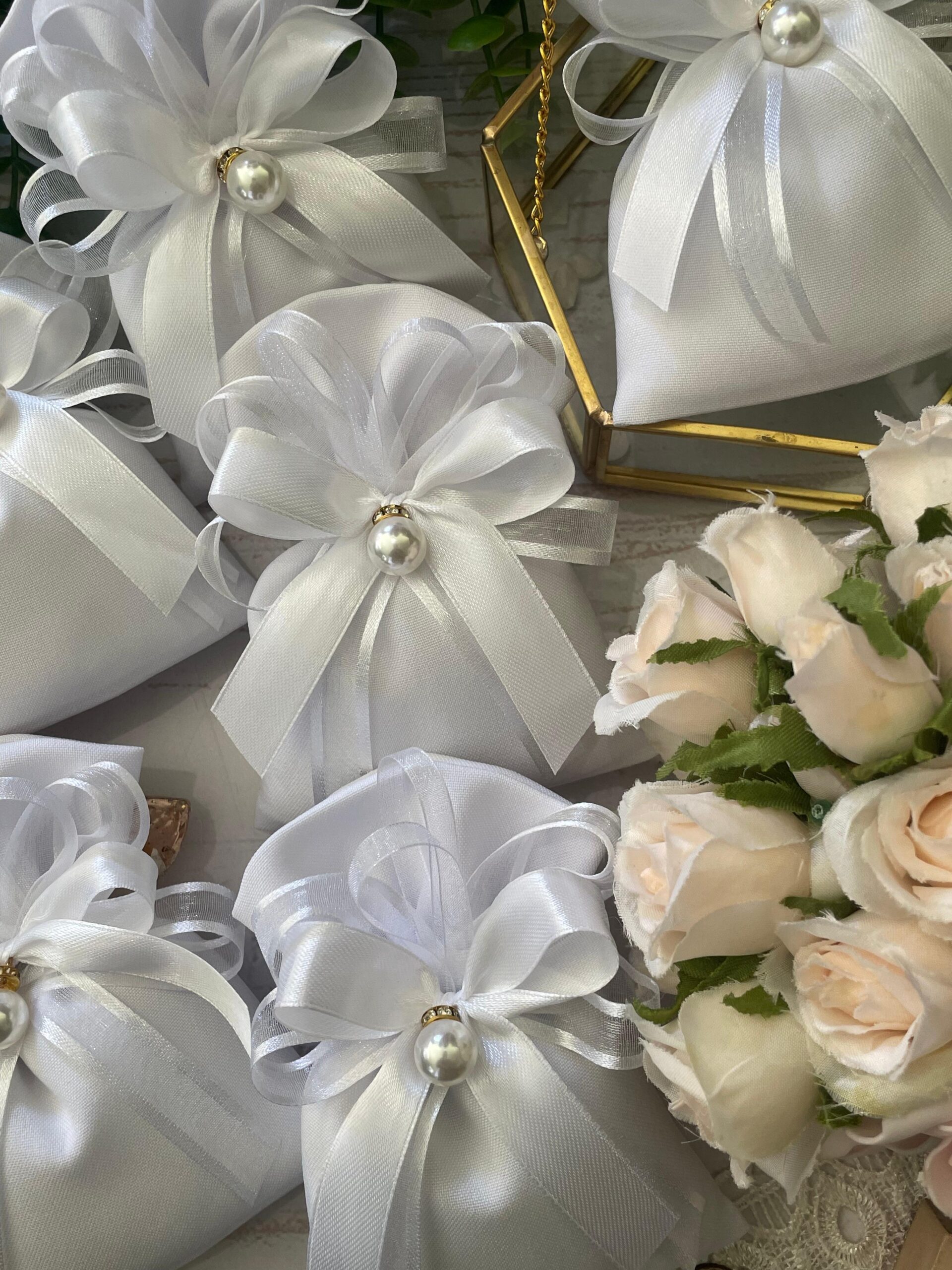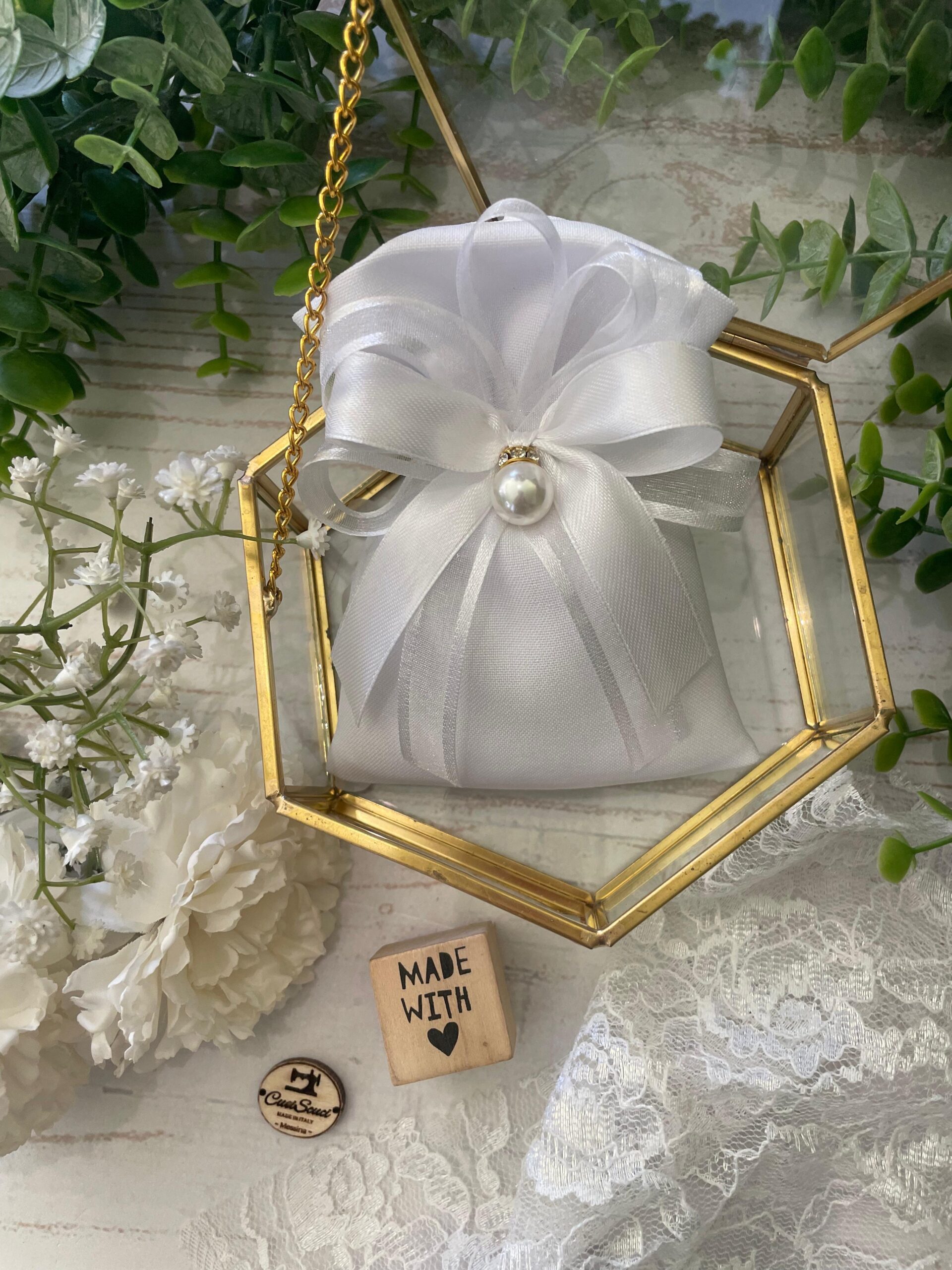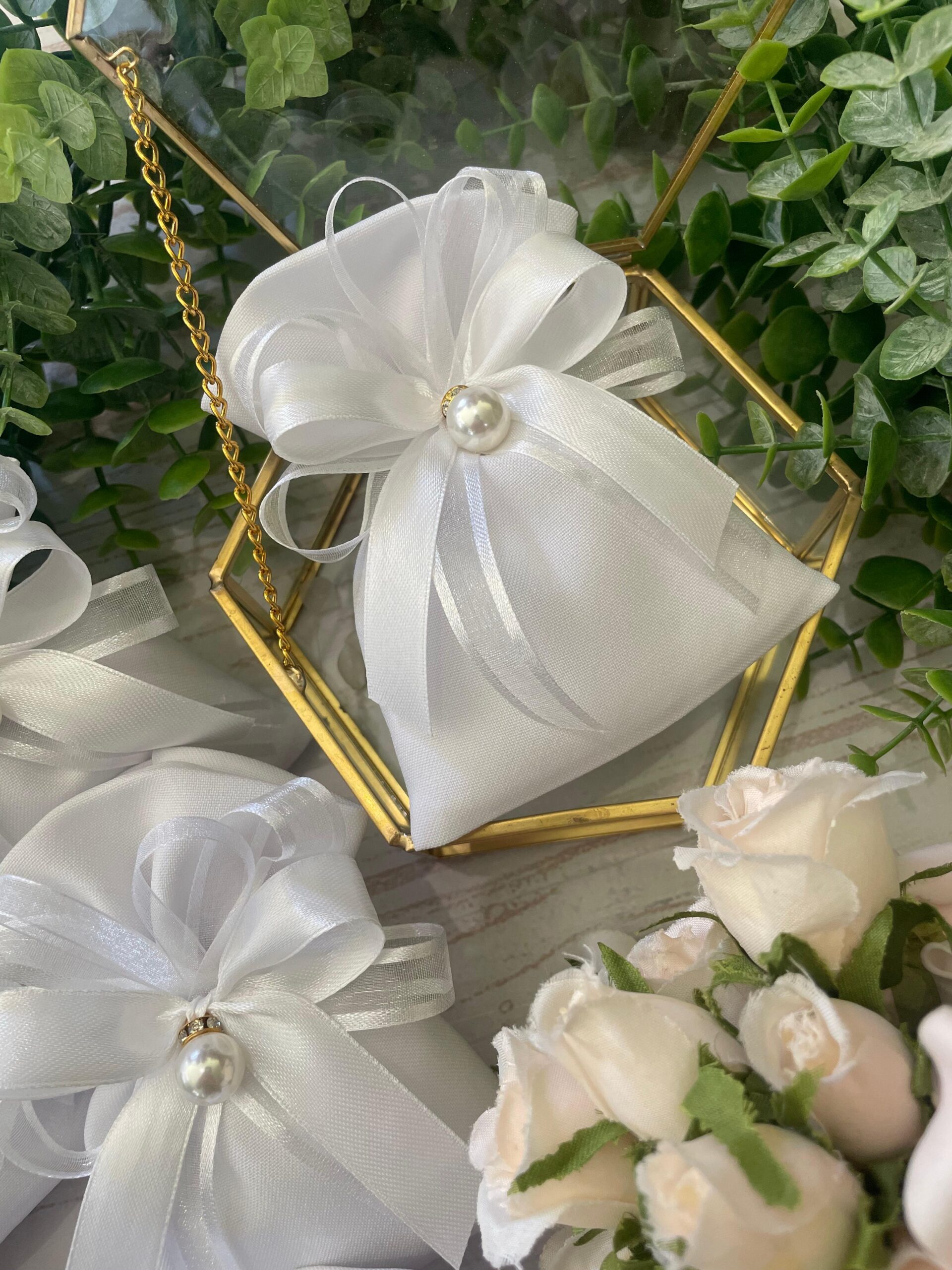 Il sacchetto, confezionato in tela boston bianco, è impreziosito da una delicata perla con strass, che dona un tocco luminoso e raffinato alla composizione.