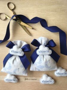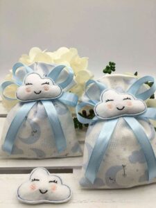 Realizzato in rigatino di cotone bianco con fantasia luna e nuvole azzurre, arricchito da una dolce applicazione in pannolenci a forma di nuvoletta, personalizzabile con una simpatica faccina o con il nome del bimbo.