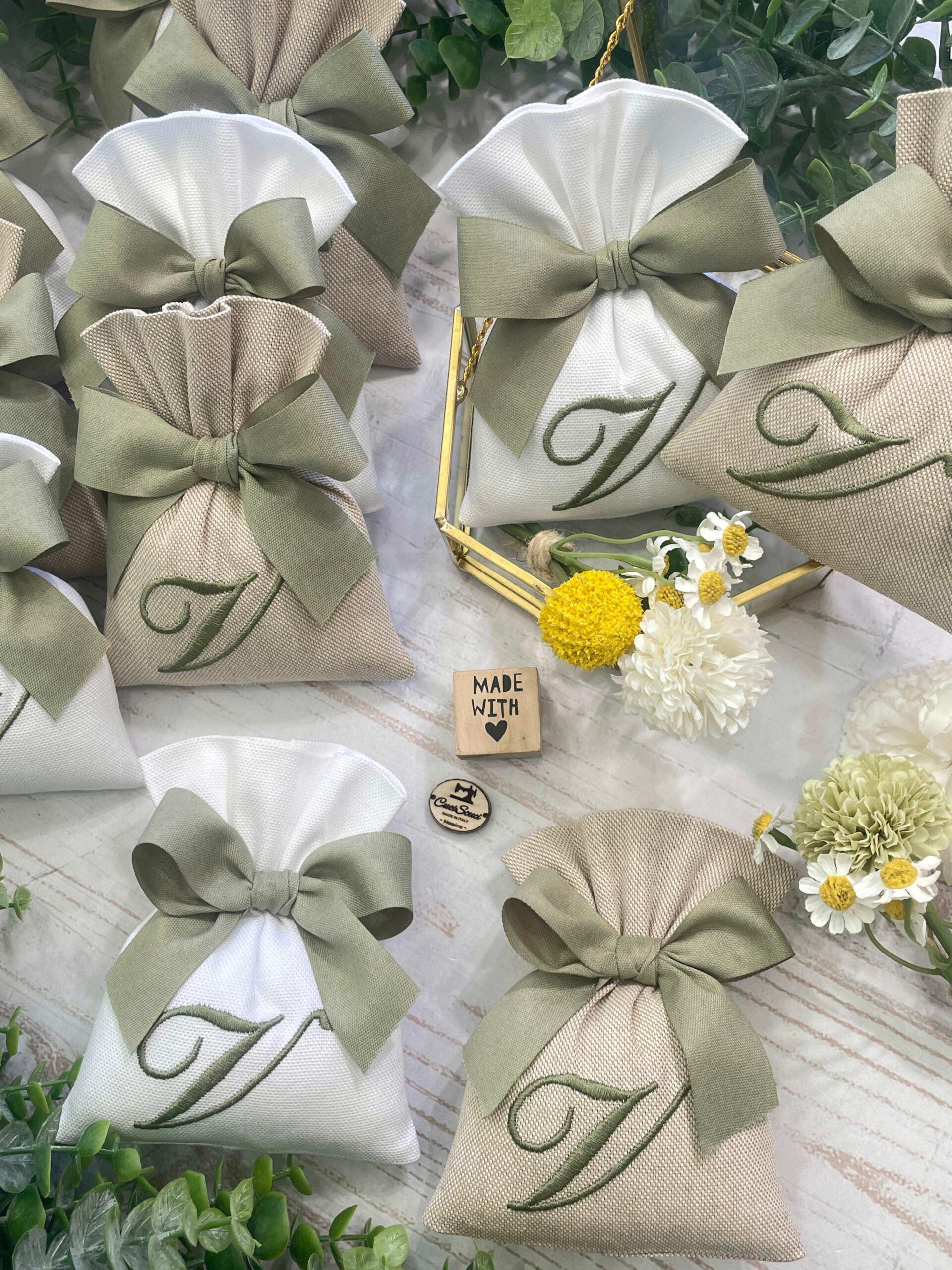 • Confezionato: bomboniera pronta da donare, completa di sacchetto con ricamo, imbottitura in ovatta, fiocco coordinato e 5 confetti in busta sigillata.