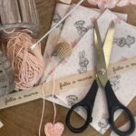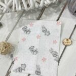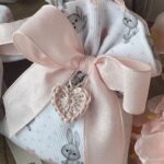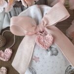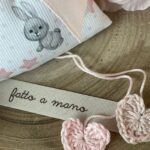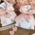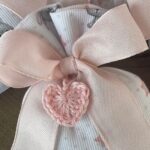 Realizzato in rigatino di cotone bianco con fantasia coniglietti, arricchito da un cuoricino in crochet applicato a mano, perfetto per donare un tocco tenero e originale alle tue bomboniere.