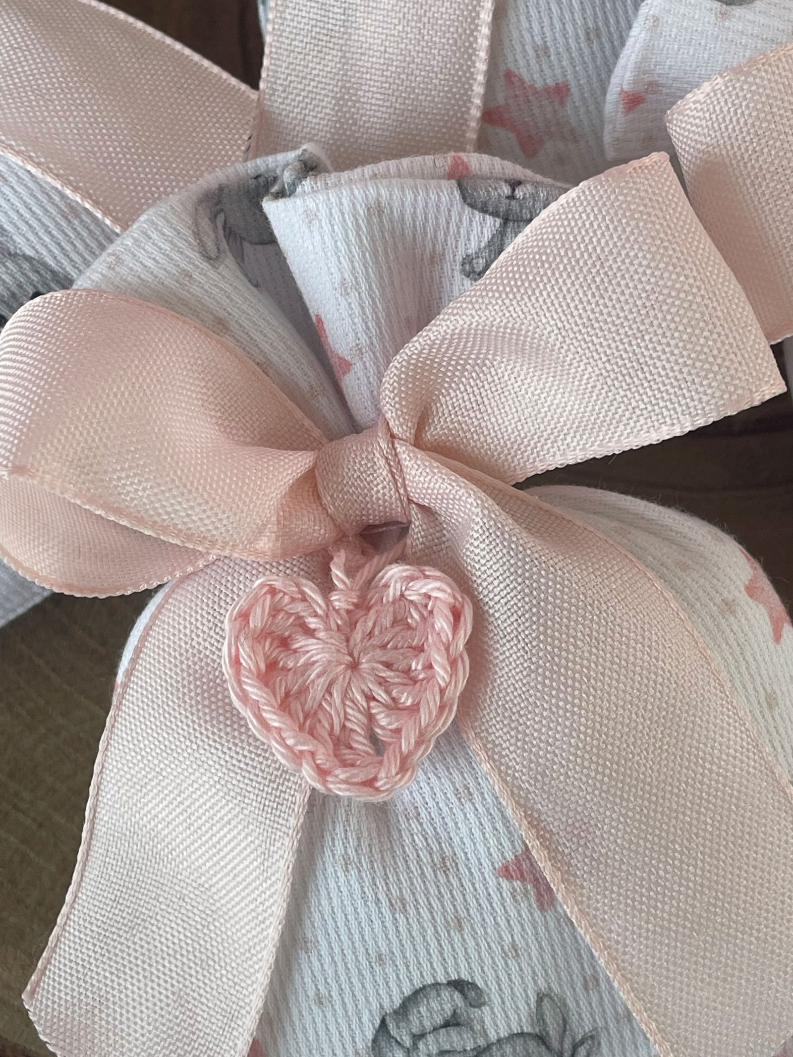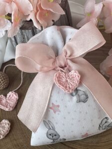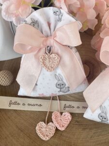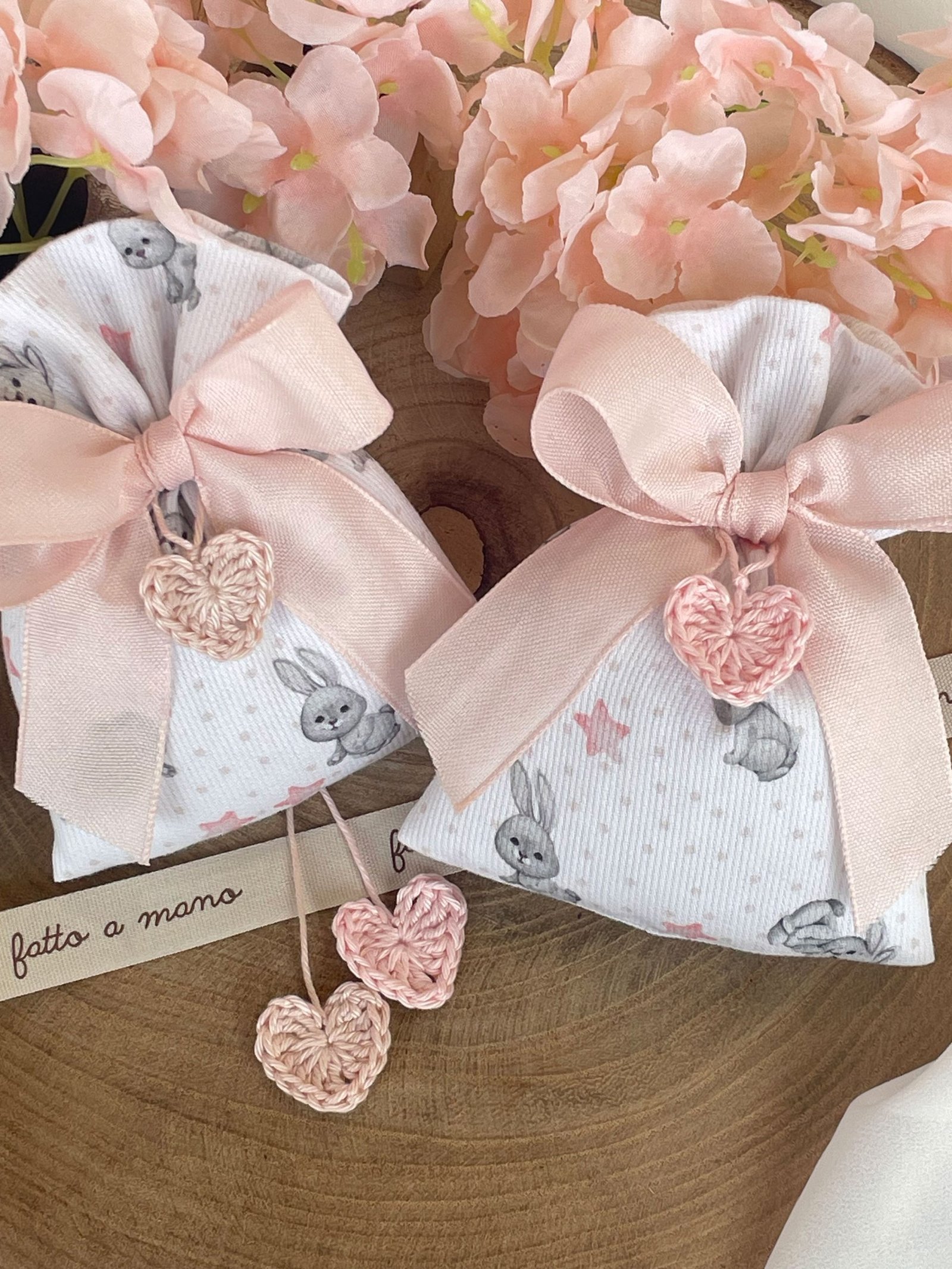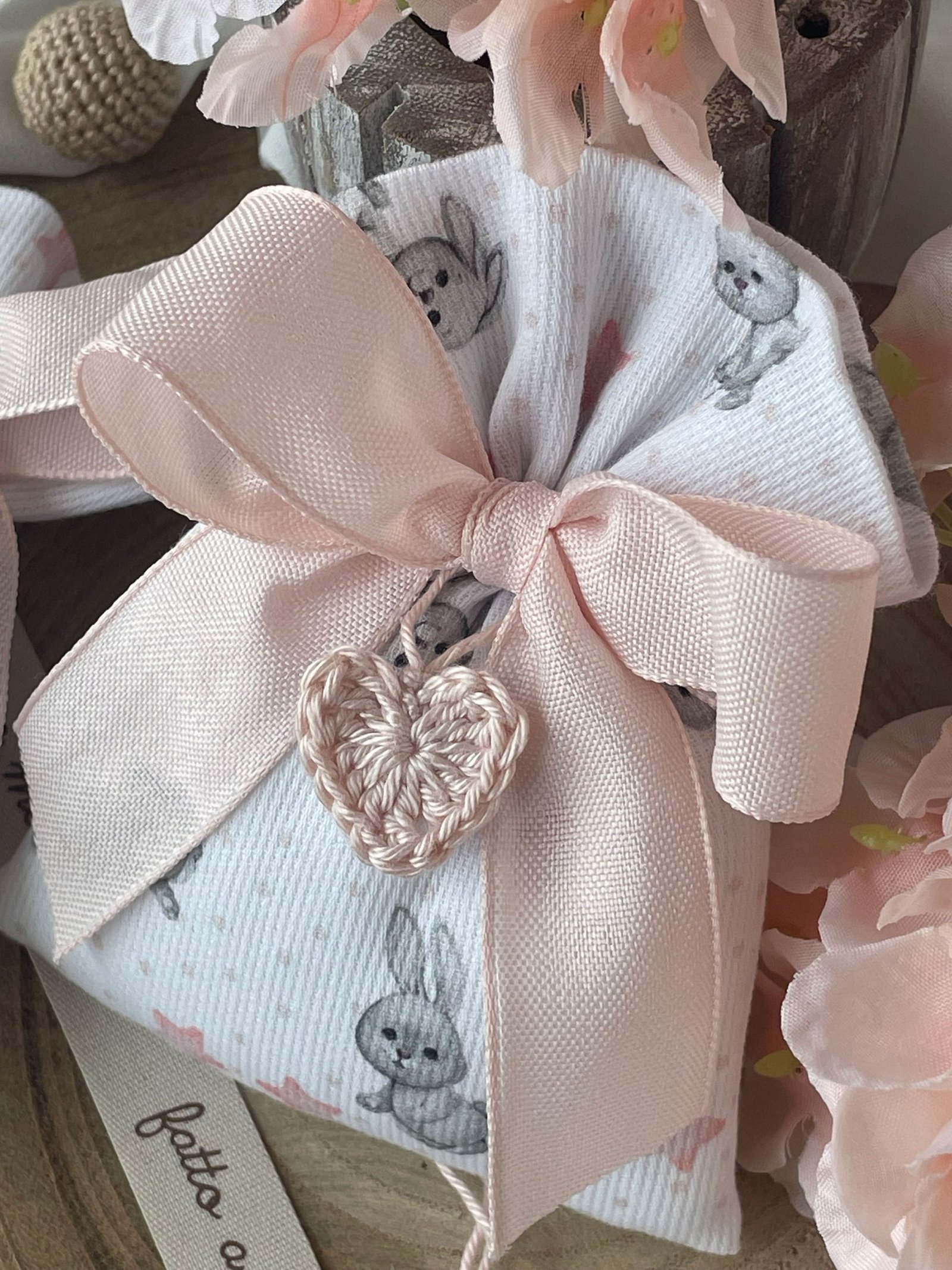 Realizzato in rigatino di cotone bianco con fantasia coniglietti, arricchito da un cuoricino in crochet applicato a mano, perfetto per donare un tocco tenero e originale alle tue bomboniere.