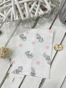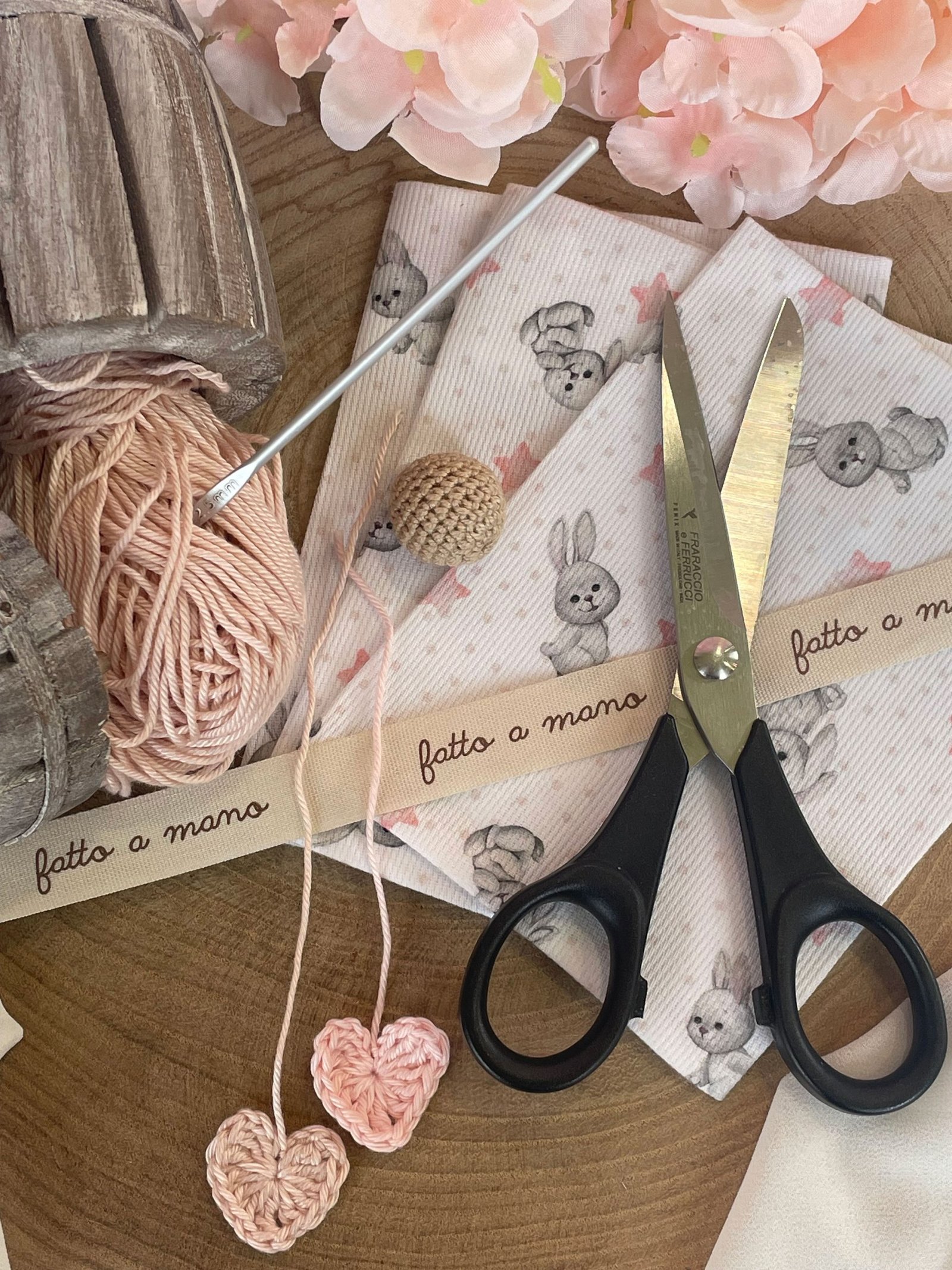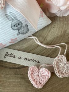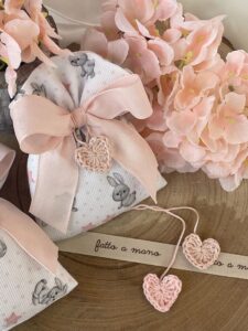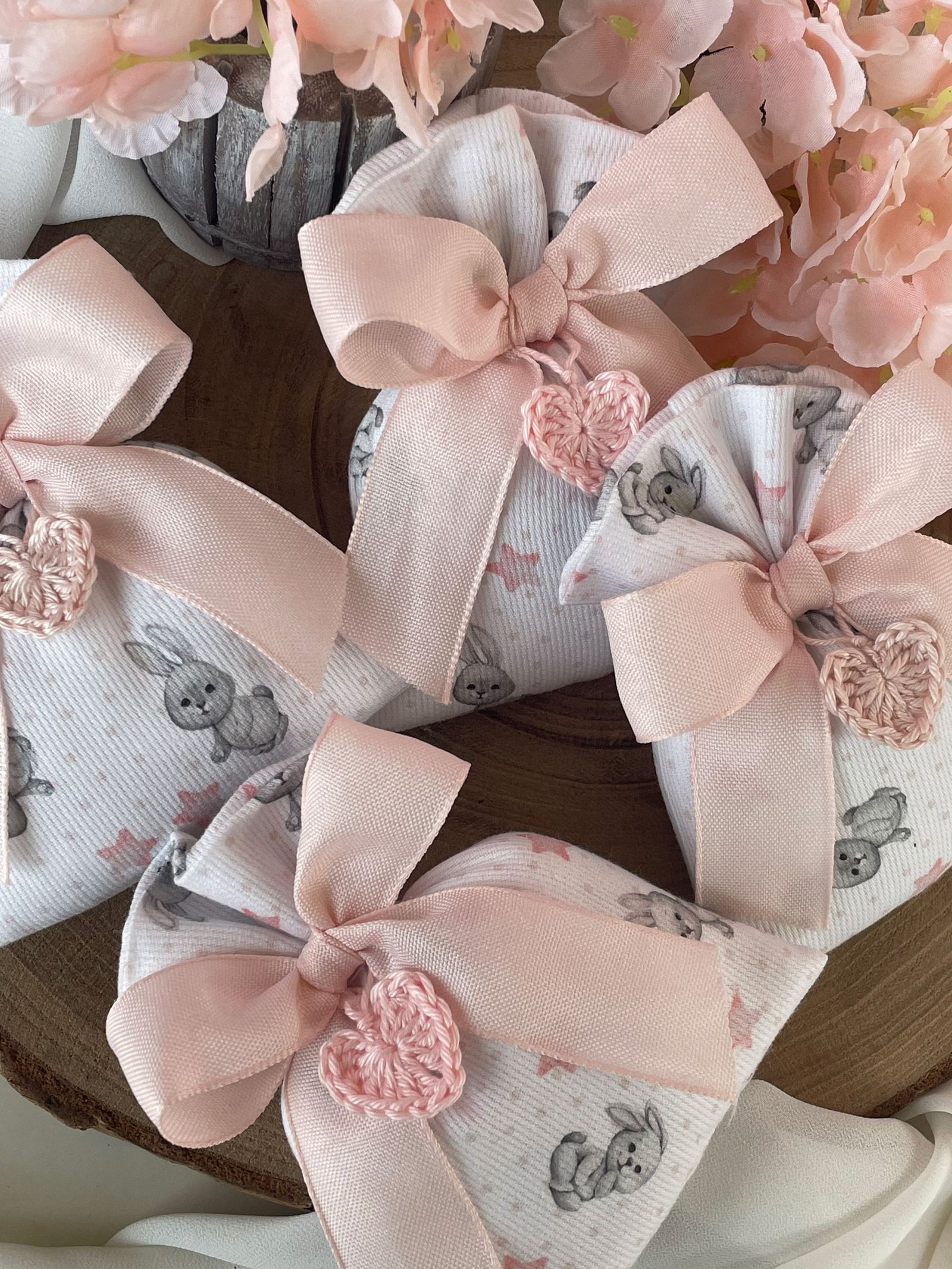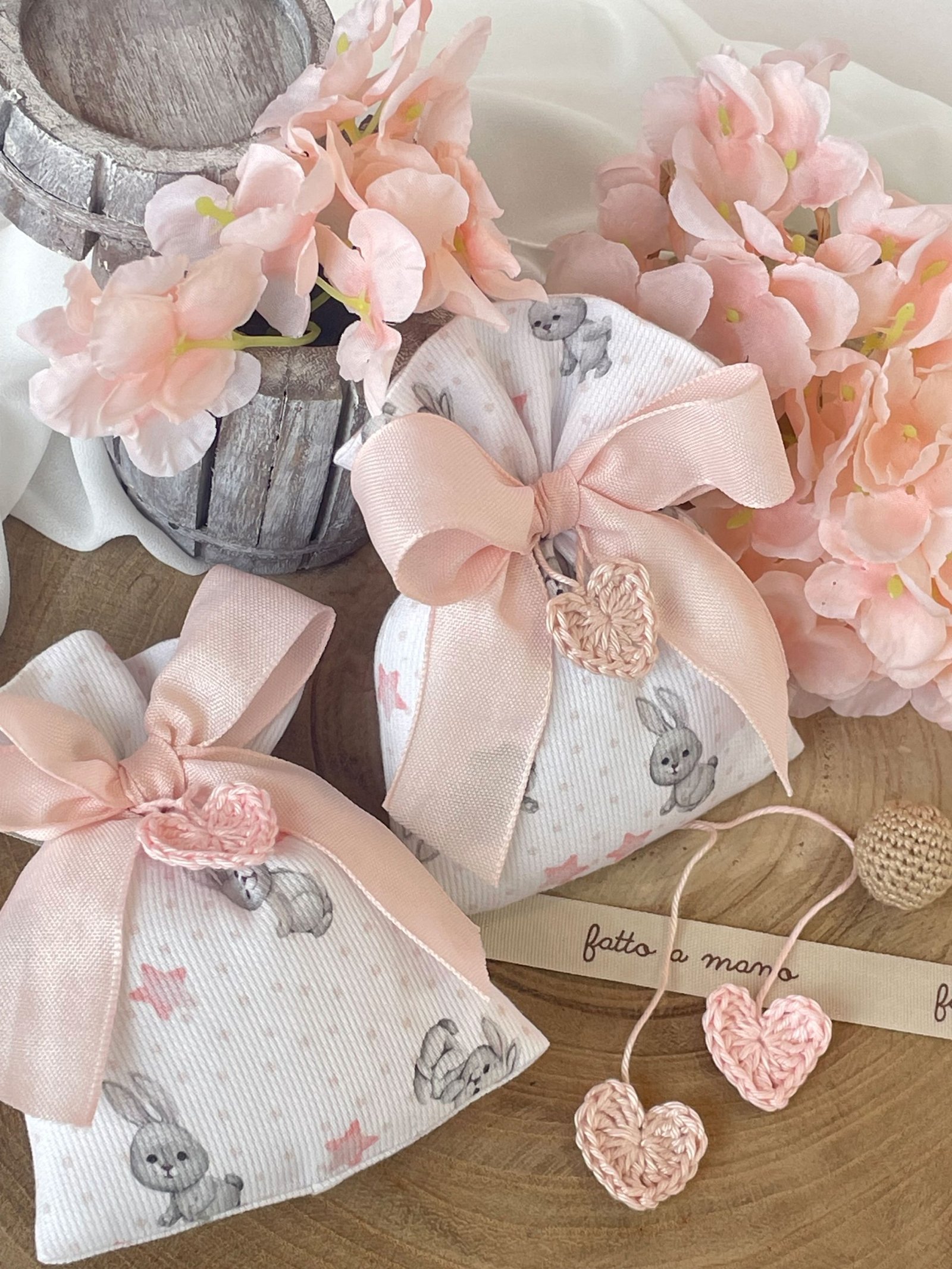 Realizzato in rigatino di cotone bianco con fantasia coniglietti, arricchito da un cuoricino in crochet applicato a mano, perfetto per donare un tocco tenero e originale alle tue bomboniere.