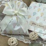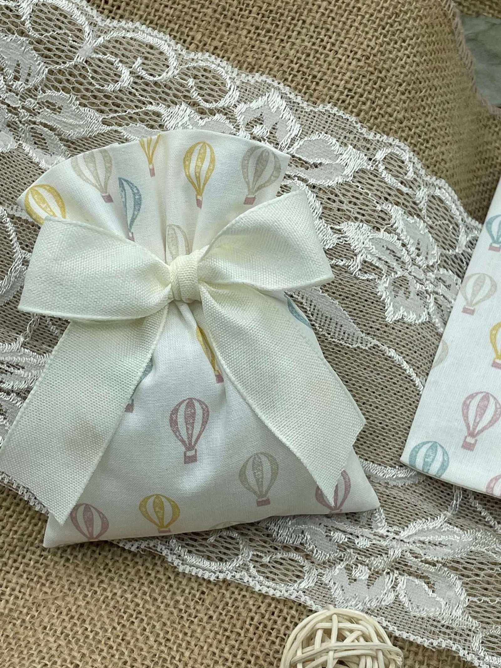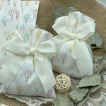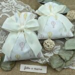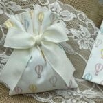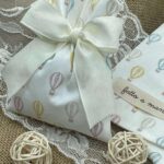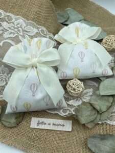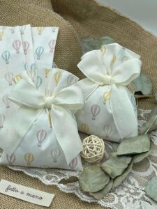 Questo dolce sacchetto in cotone bianco è decorato con una fantasia di mongolfiere rosa, gialle, azzurre e beige, per un ricordo allegro e raffinato, perfetto per ogni occasione speciale.
