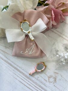 • Confezionato: bomboniera pronta da donare, completa di ricamo, fiocco, confetti e specchietto calamita.