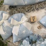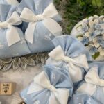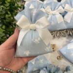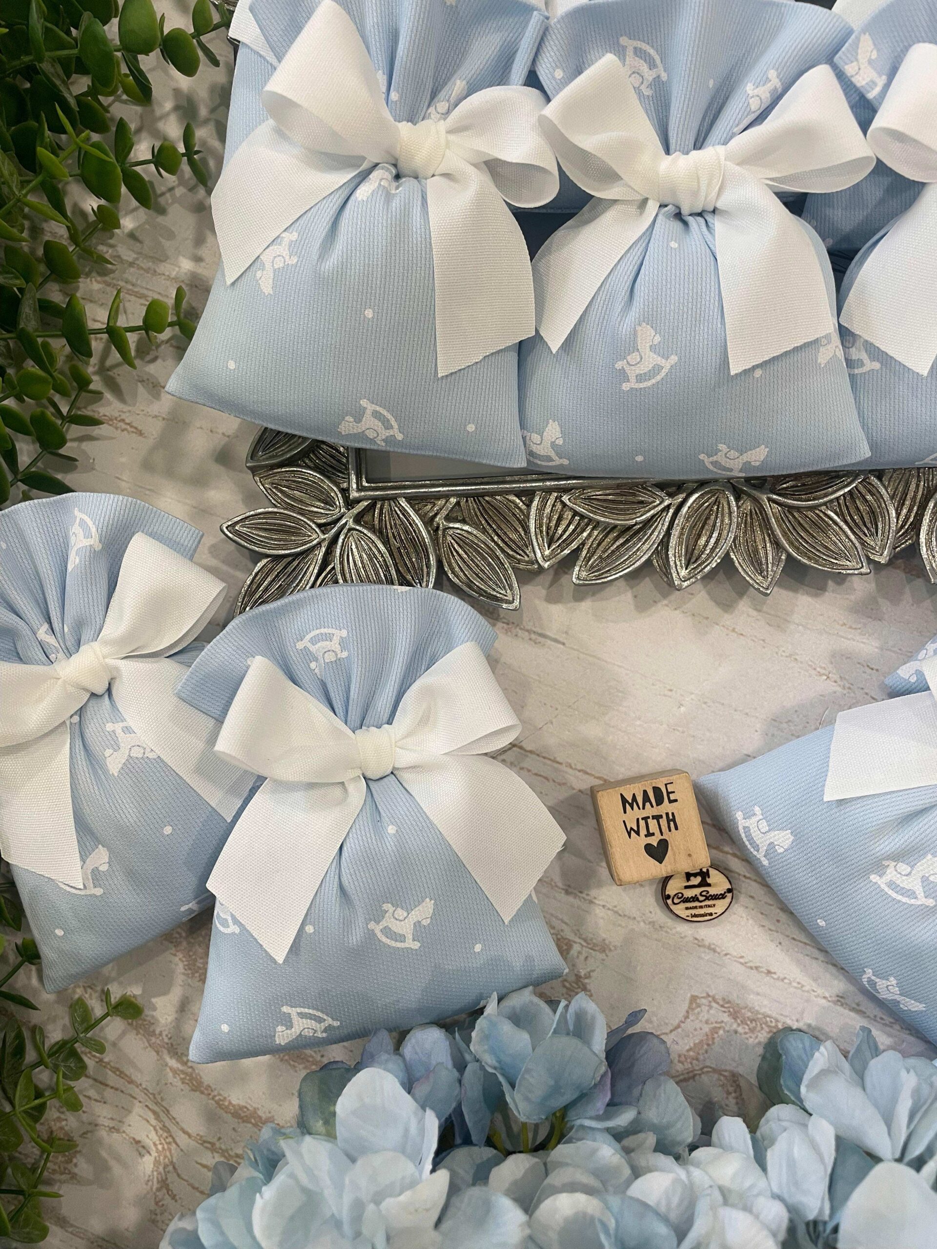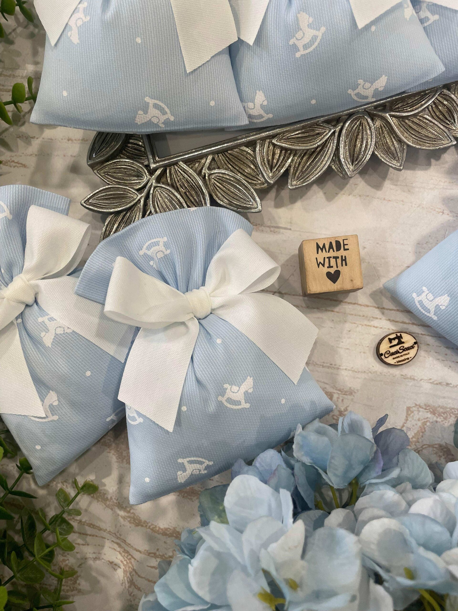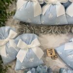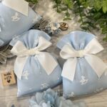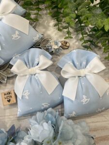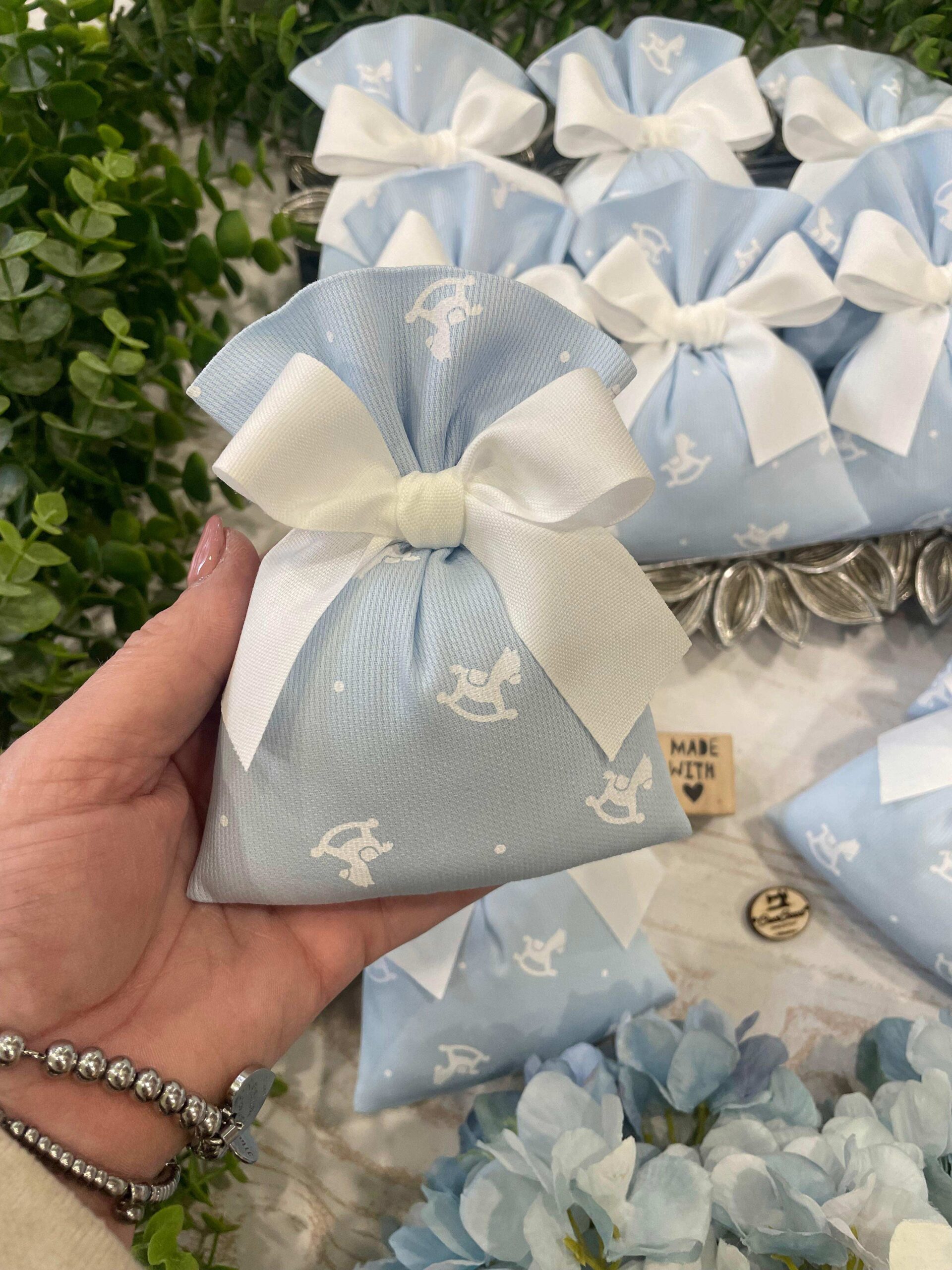 Il cotone rigatino celeste, impreziosito dalla tenera fantasia con cavallini a dondolo, dona alla bomboniera un carattere giocoso ma al tempo stesso raffinato, perfetto per celebrare i momenti più speciali.