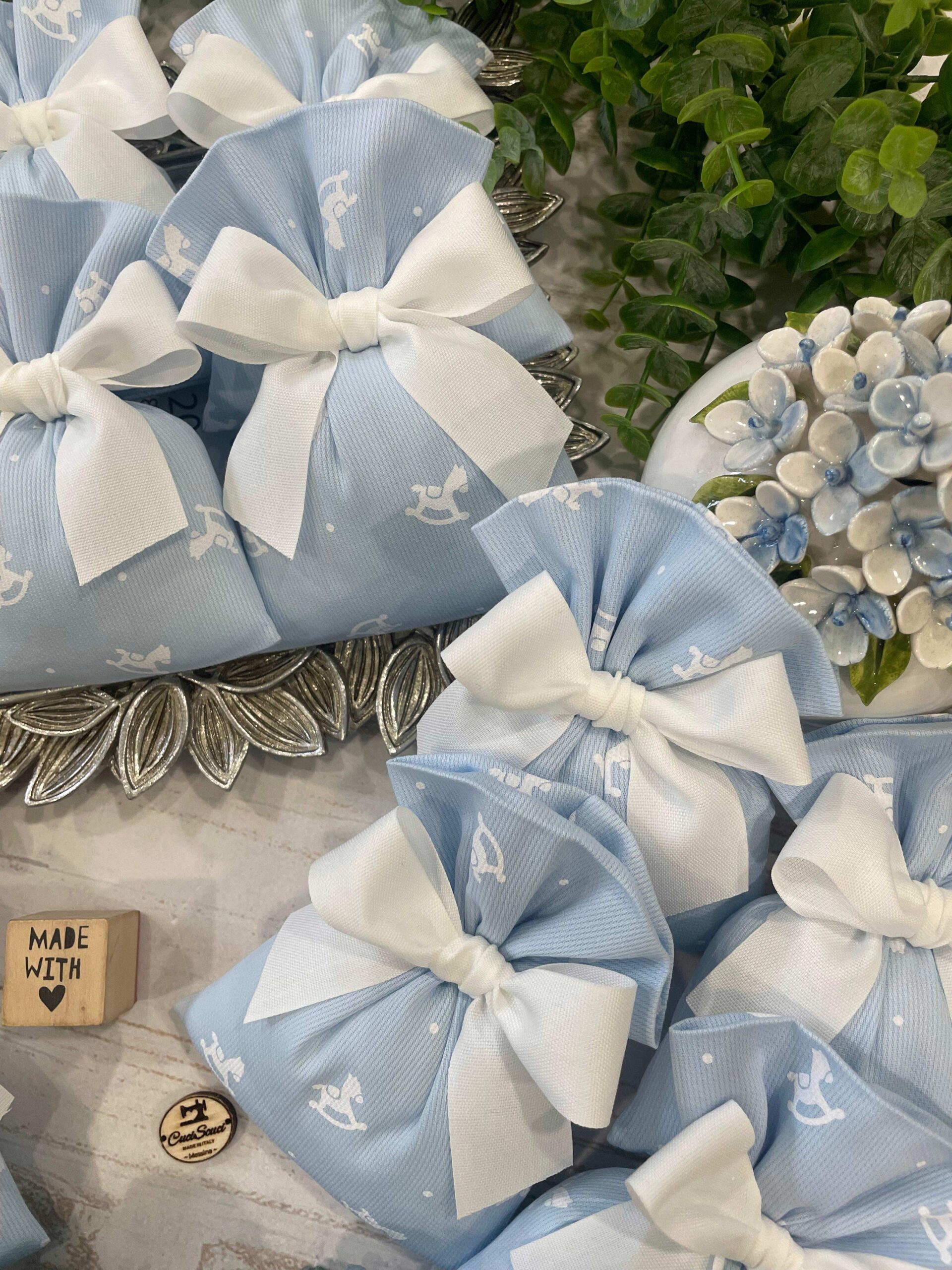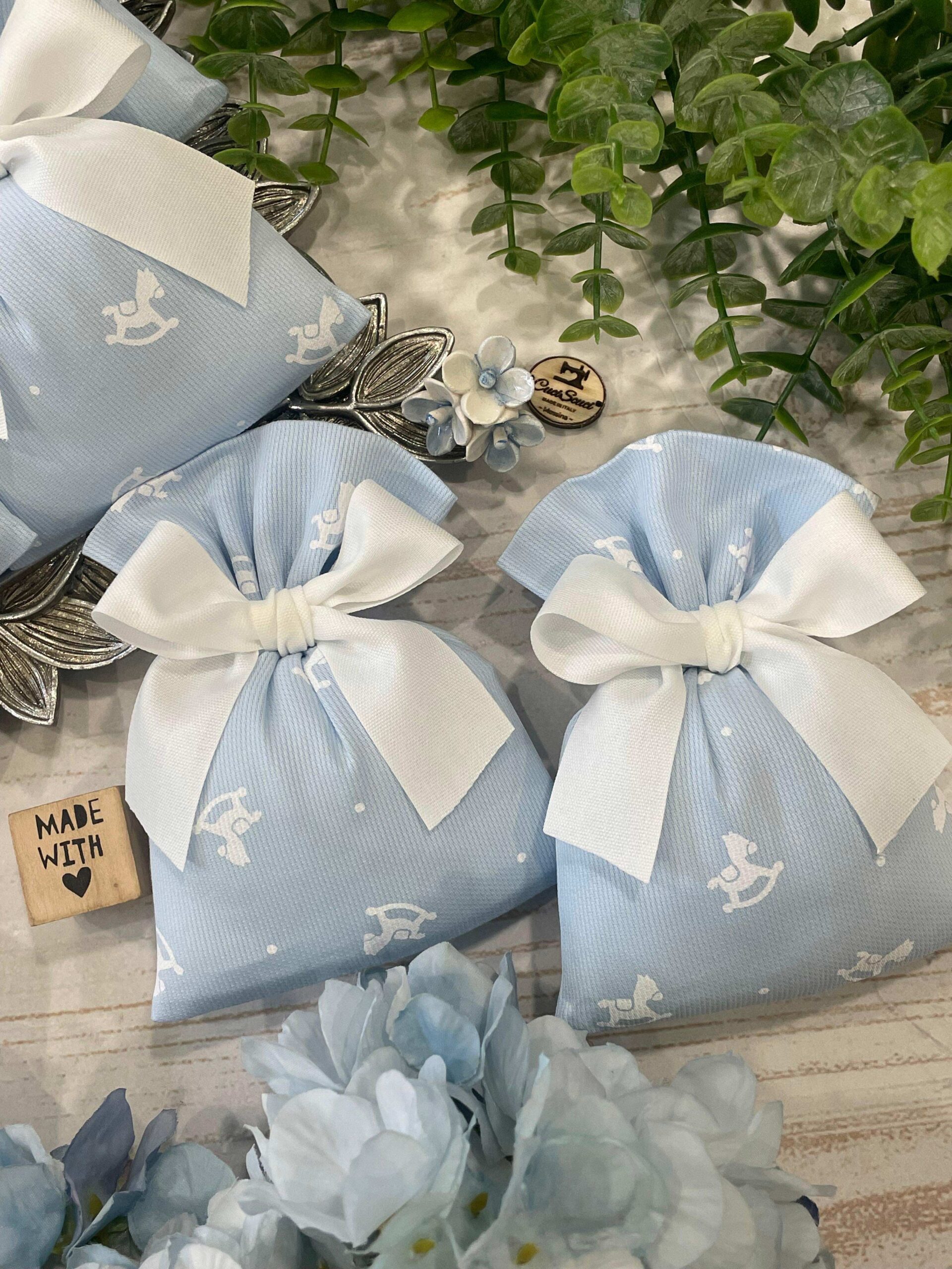 • Confezionato – sacchetto pronto da donare, confezionato con imbottitura in ovatta, fiocco abbinato e 5 confetti in busta sigillata