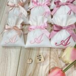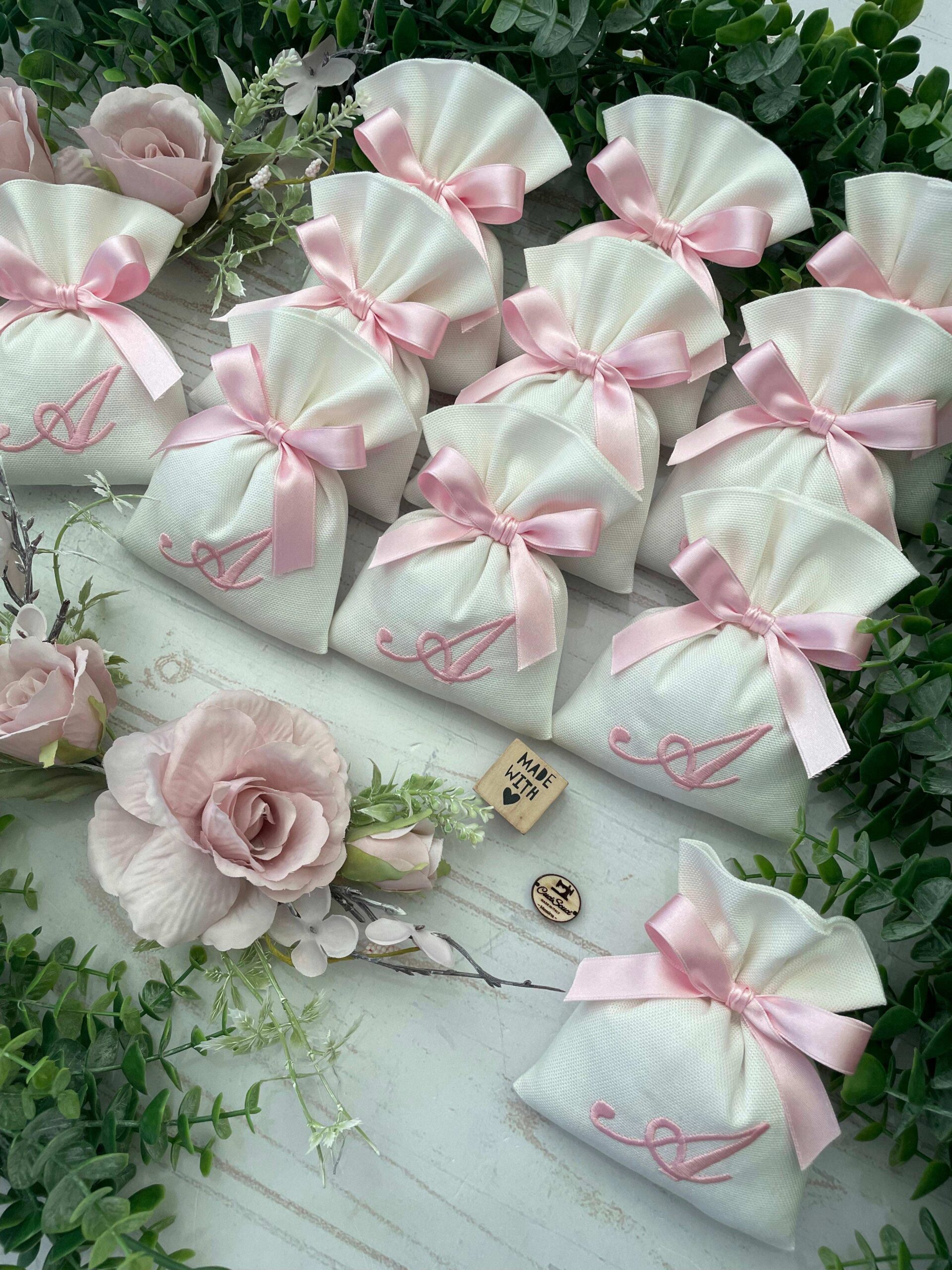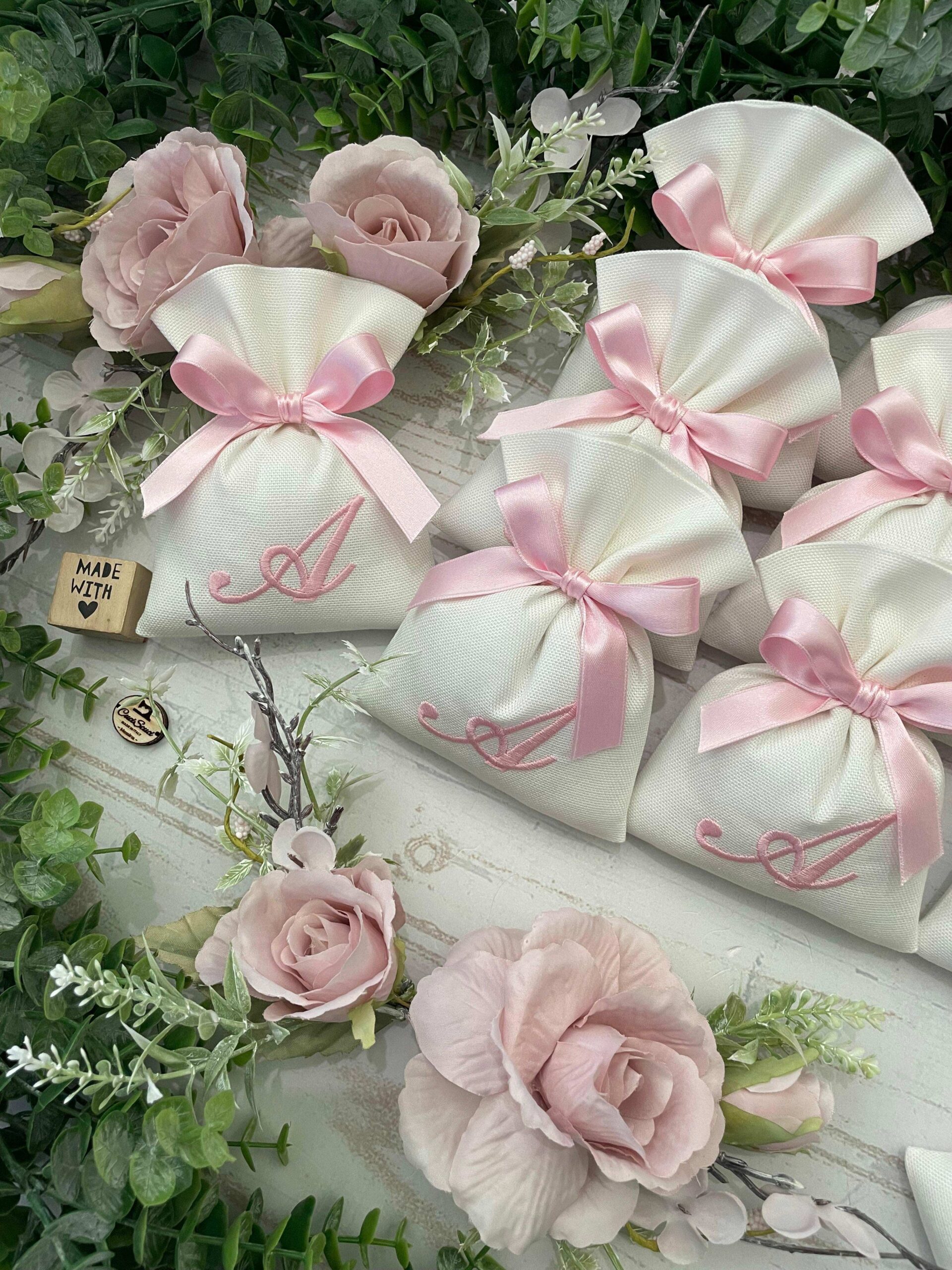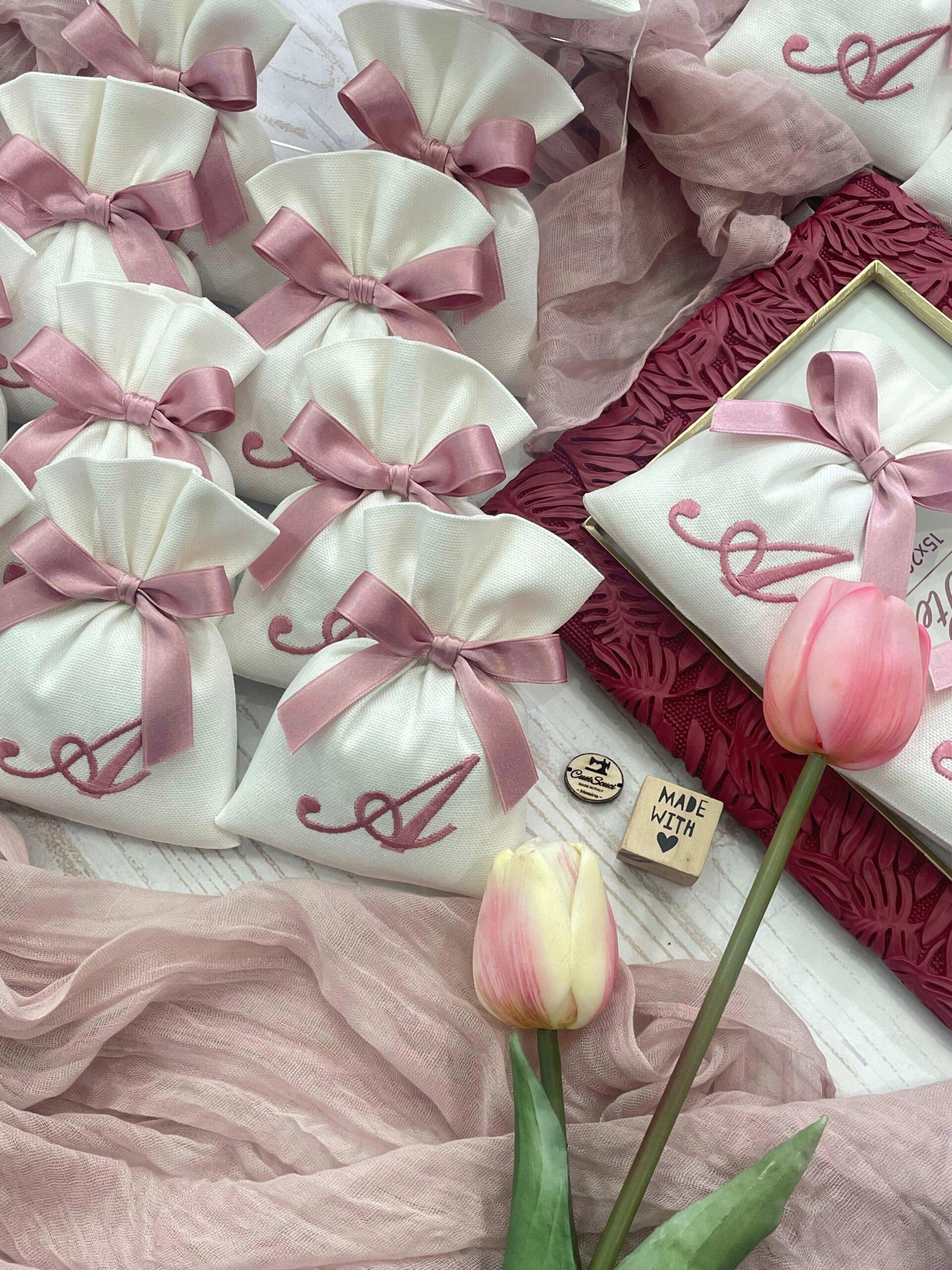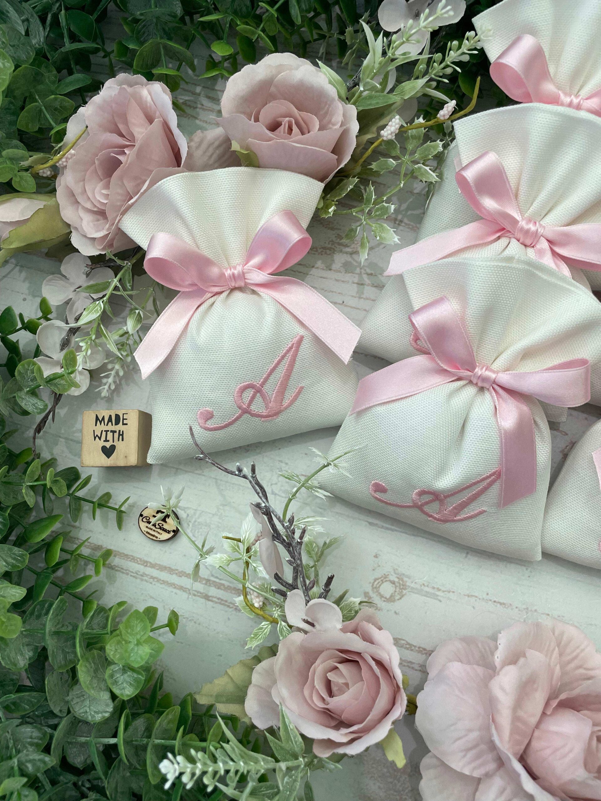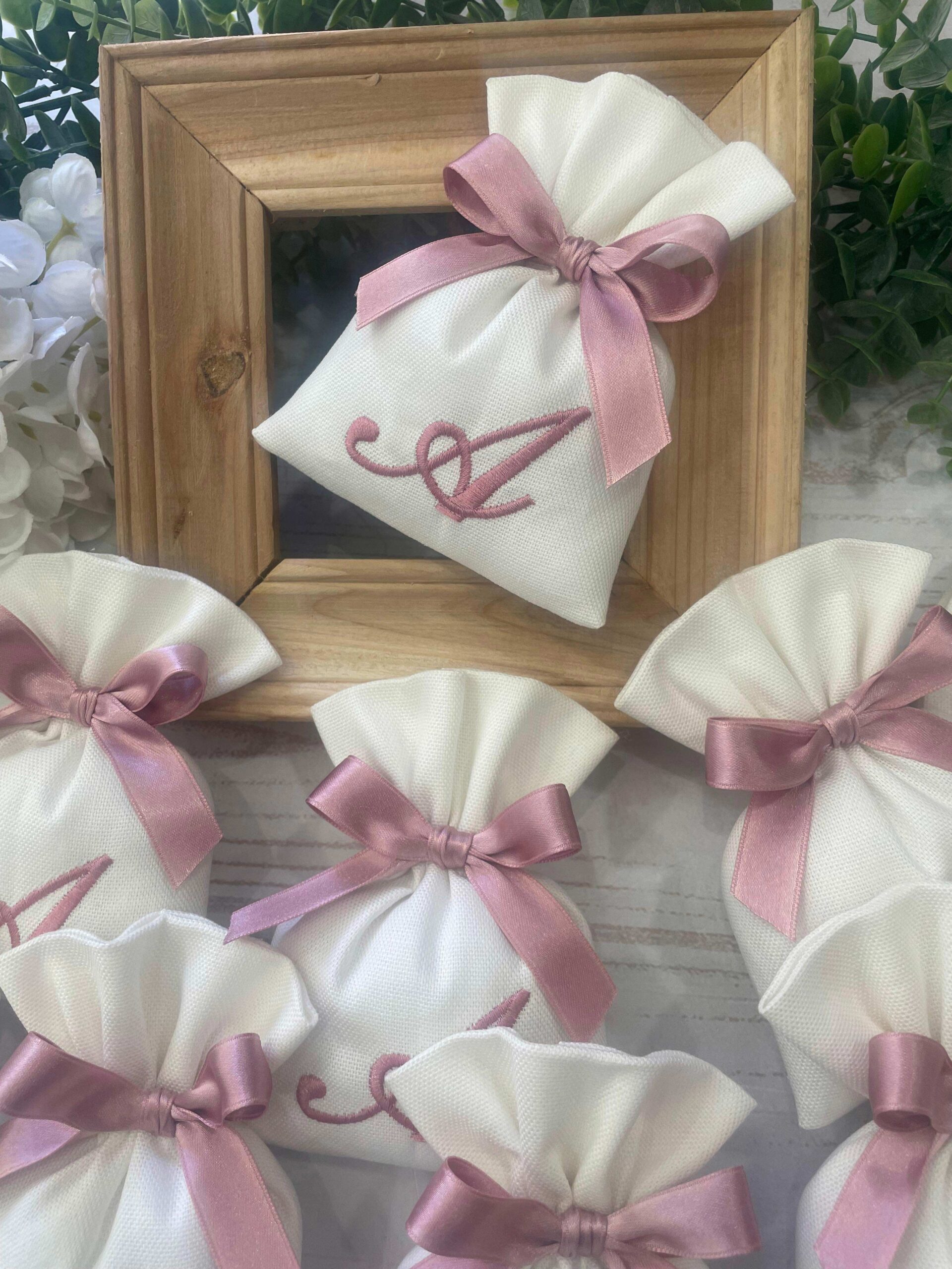 Questo sacchetto in cotone panama colore seta è impreziosito dal ricamo personalizzato di un’iniziale, per un dono unico e raffinato.