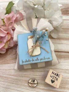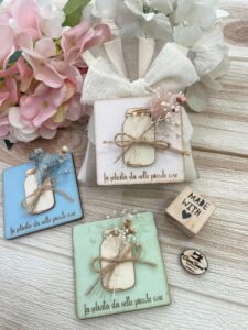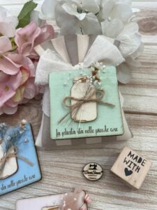 Il sacchetto, confezionato in cotone tinto filo nei colori e fantasie a scelta, è impreziosito da un quadretto calamita in legno con frase personalizzata, per un ricordo unico e originale.