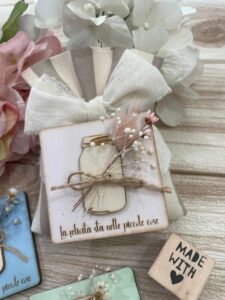 • Confezionato: bomboniera pronta da donare, completa di calamita, fiocco e confetti.