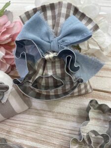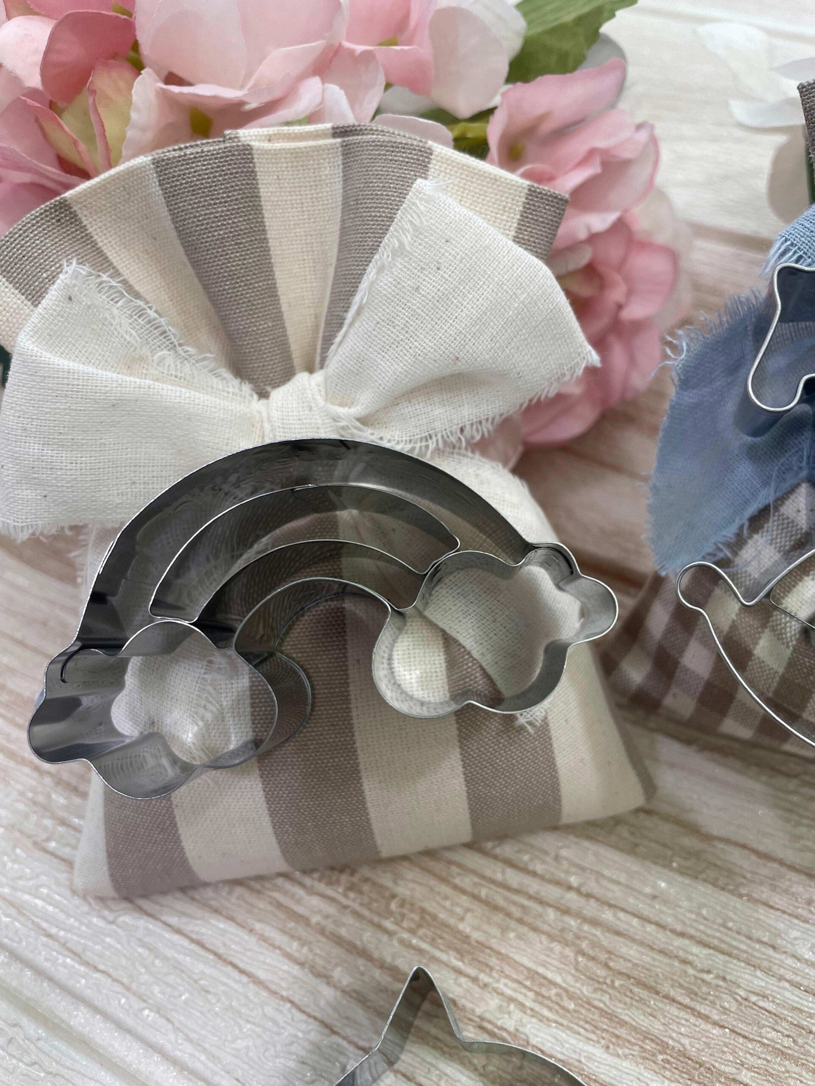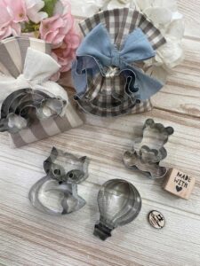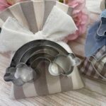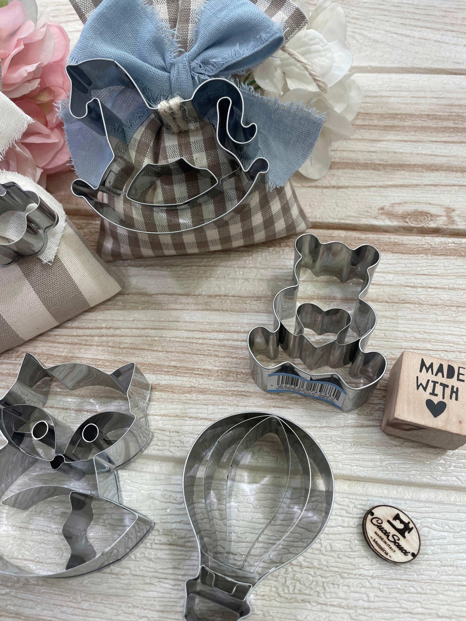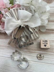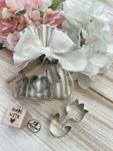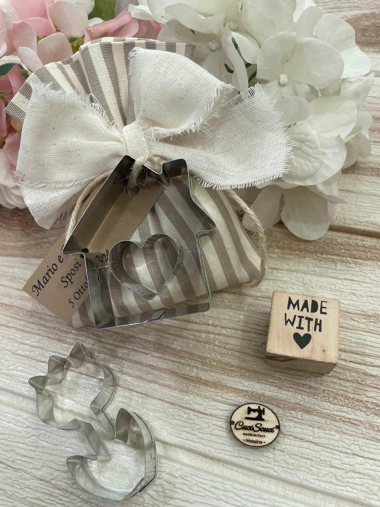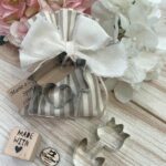 Il sacchetto, in cotone tinto filo con colore e fantasia a scelta, è impreziosito da una formina taglia biscotti — un dettaglio originale e dolce, perfetto per celebrare le occasioni più speciali.