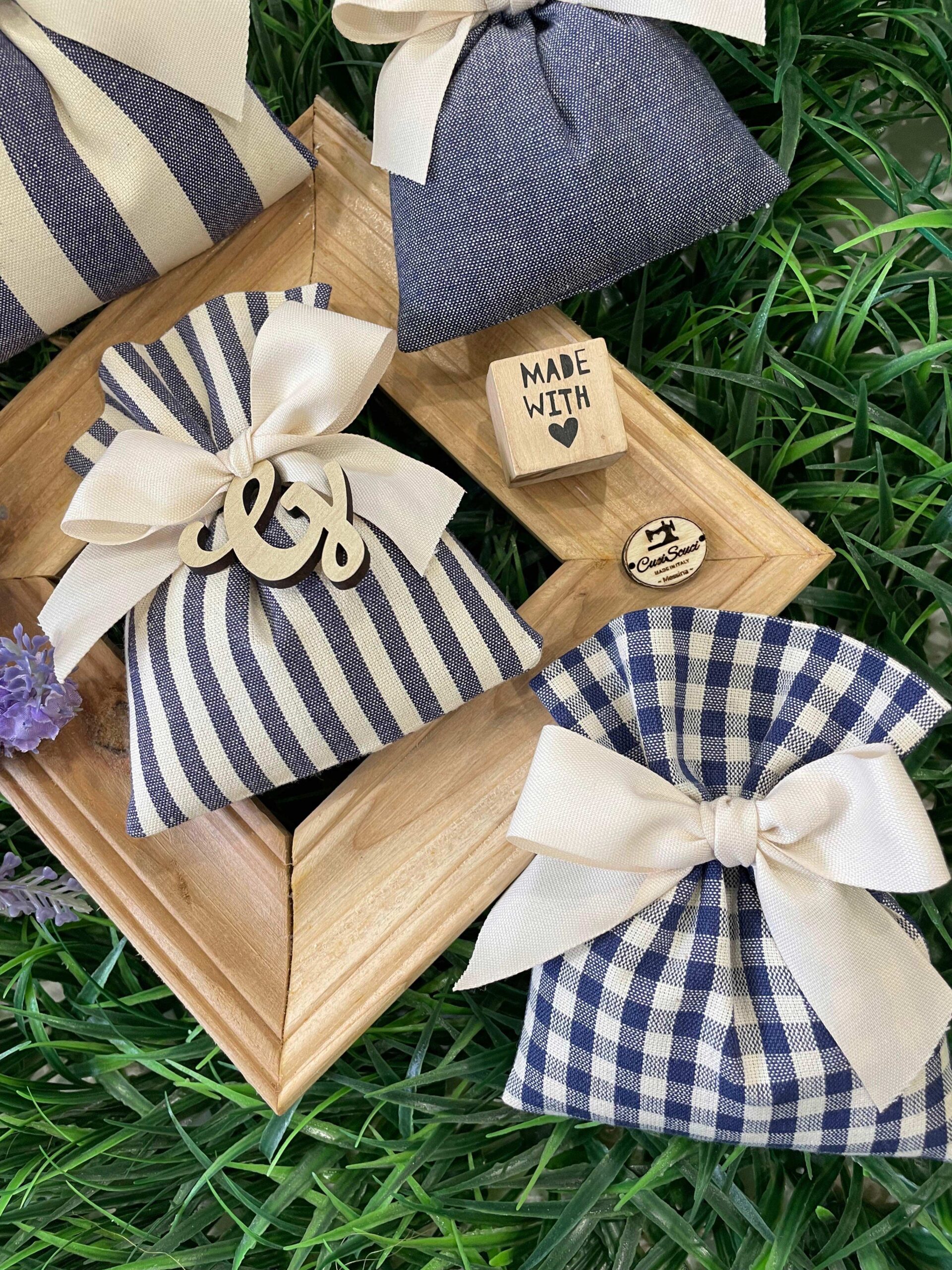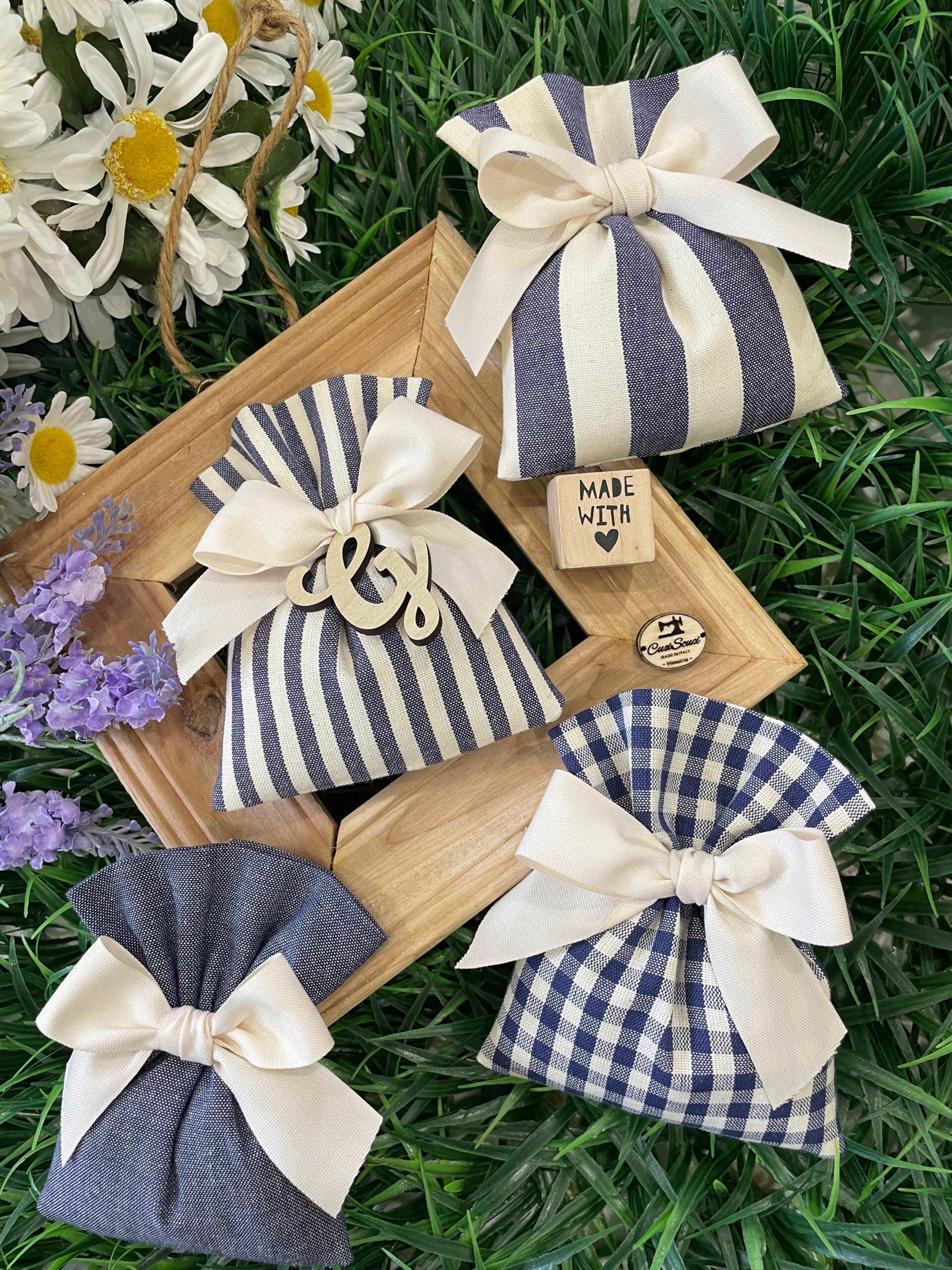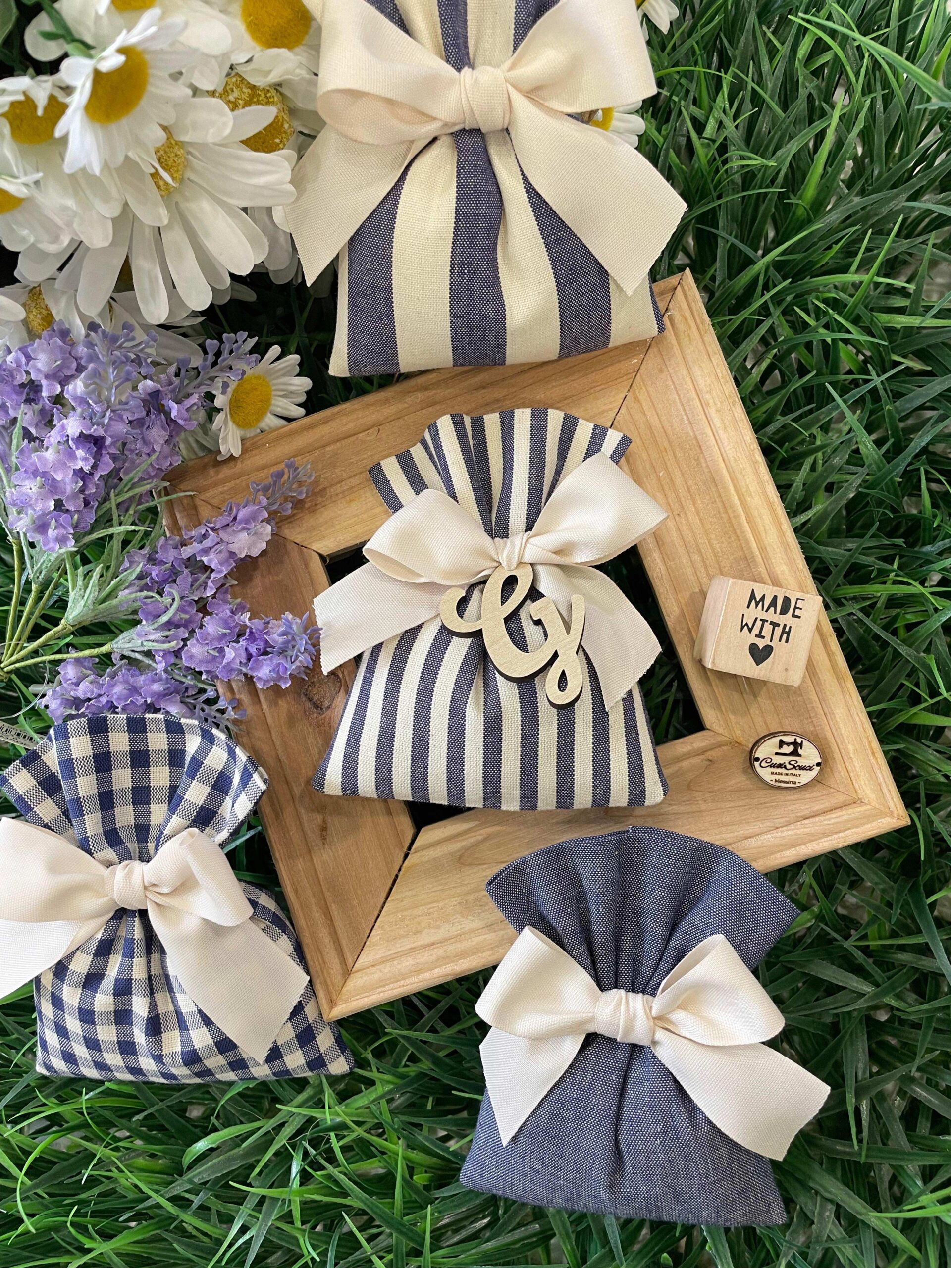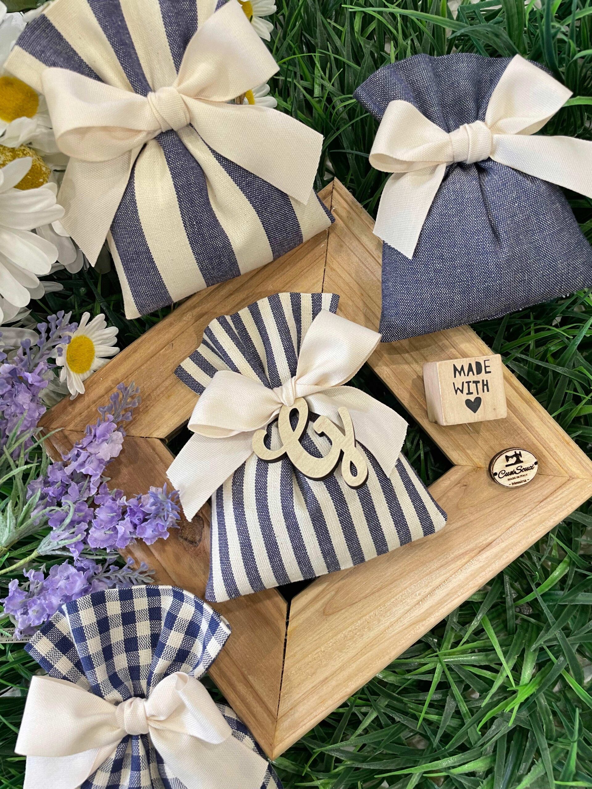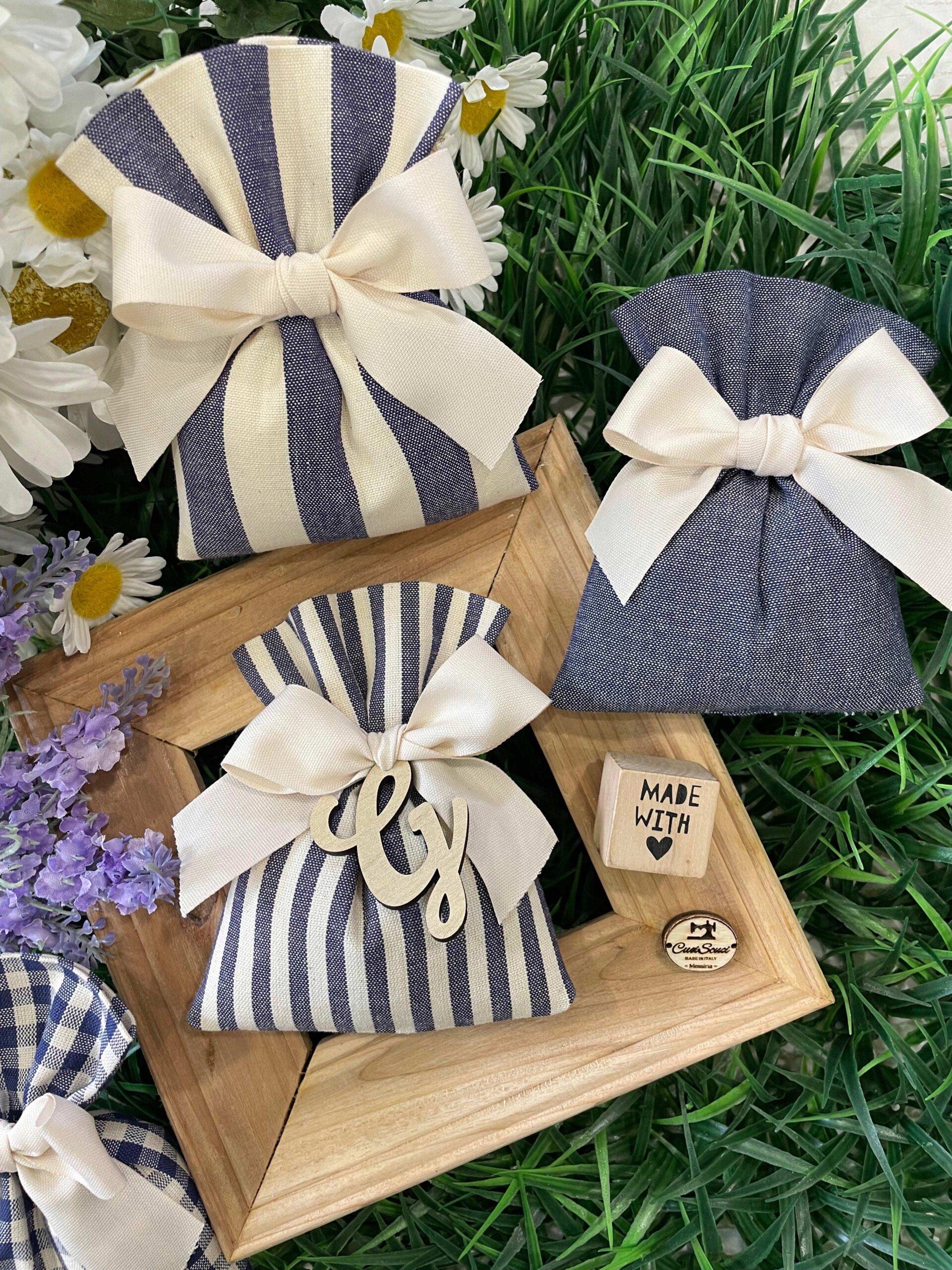 Il sacchetto, confezionato in cotone tinto filo con colore e fantasia a scelta, è impreziosito da una delicata iniziale in legno, per un tocco raffinato e personalizzato che rende ogni creazione unica.