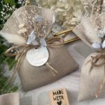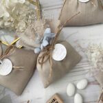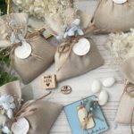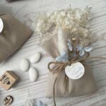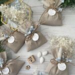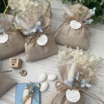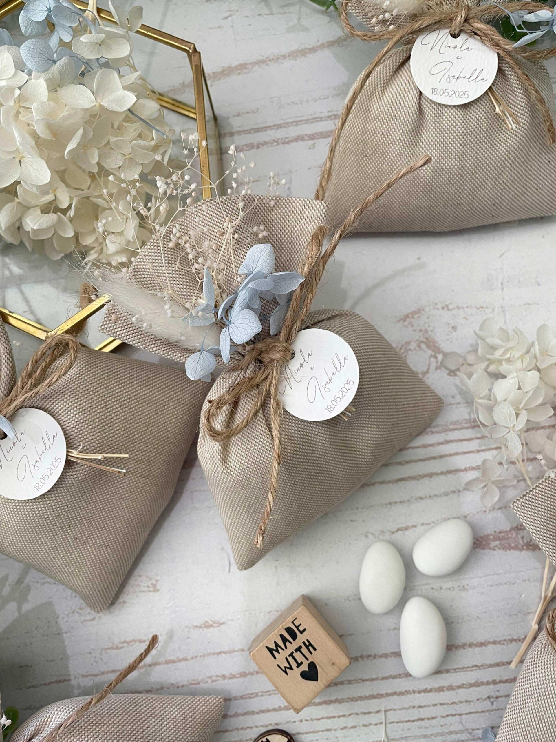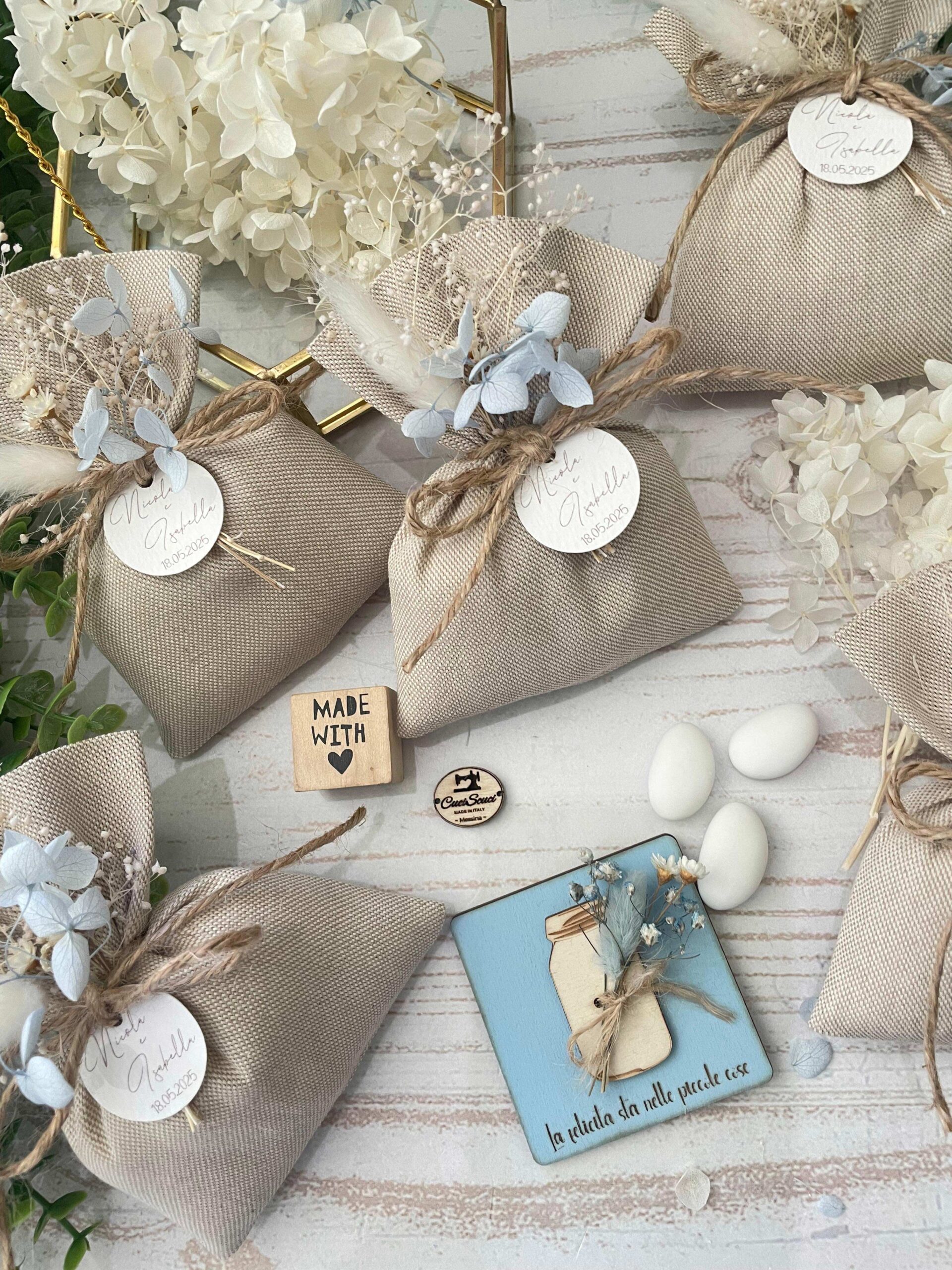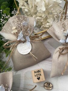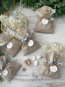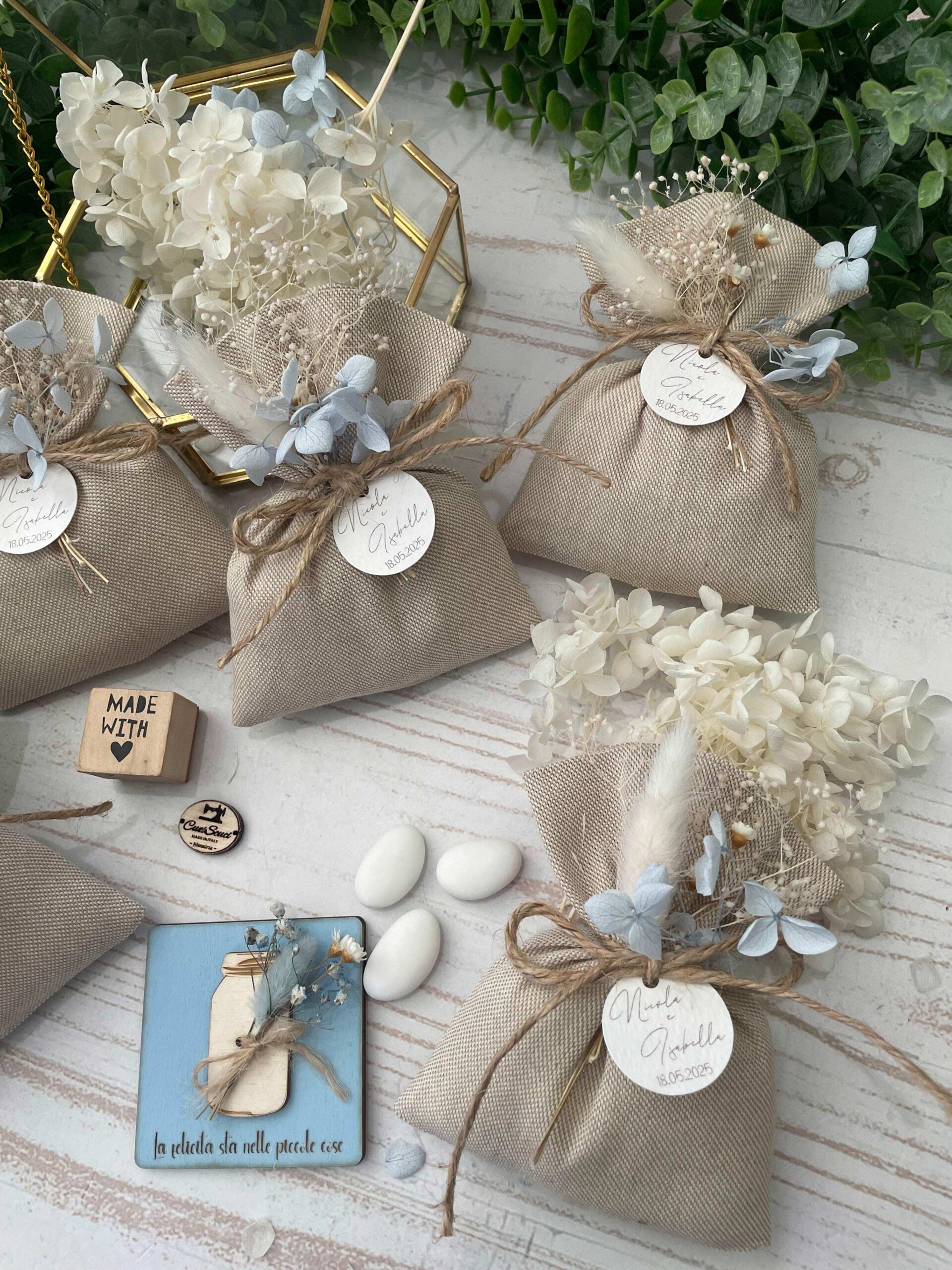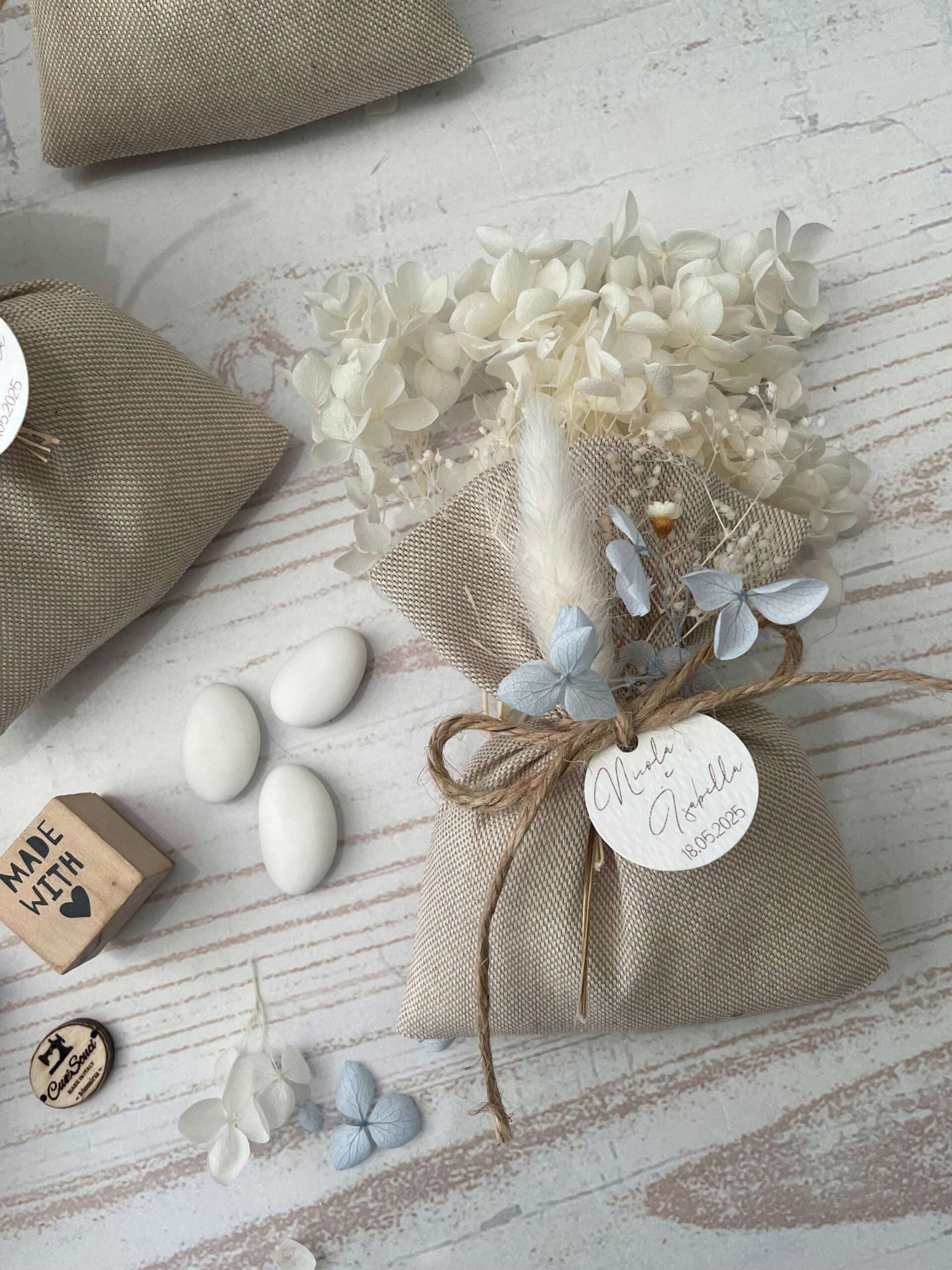 • Confezionato – bomboniera pronta da donare, con sacchetto, fiocco coordinato, imbottitura in ovatta, 5 confetti in busta sigillata e applicazione di fiori essiccati