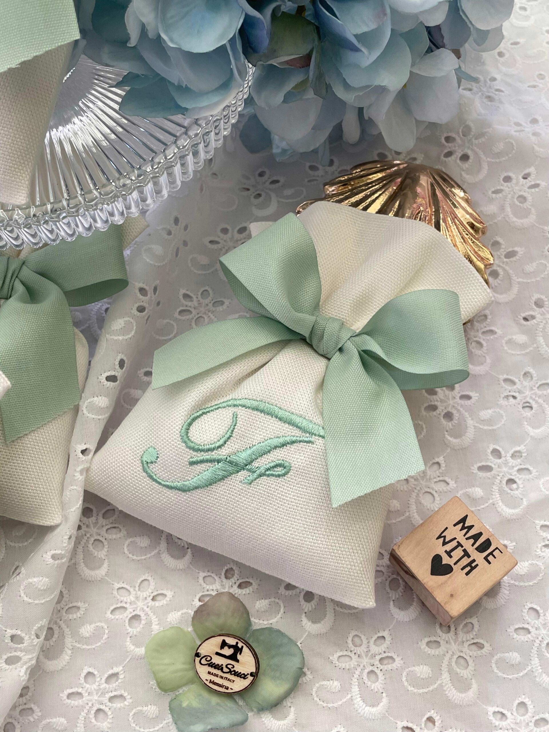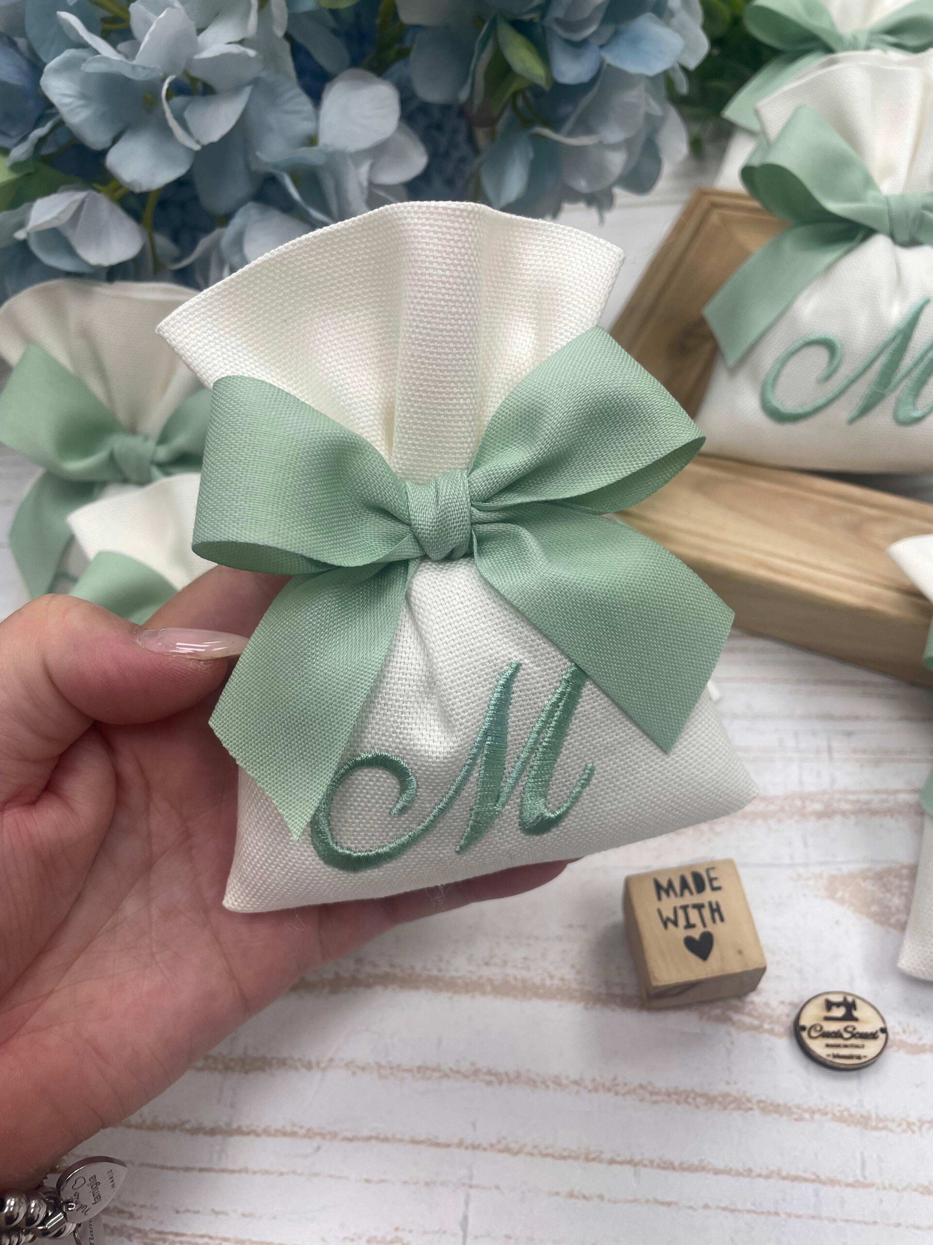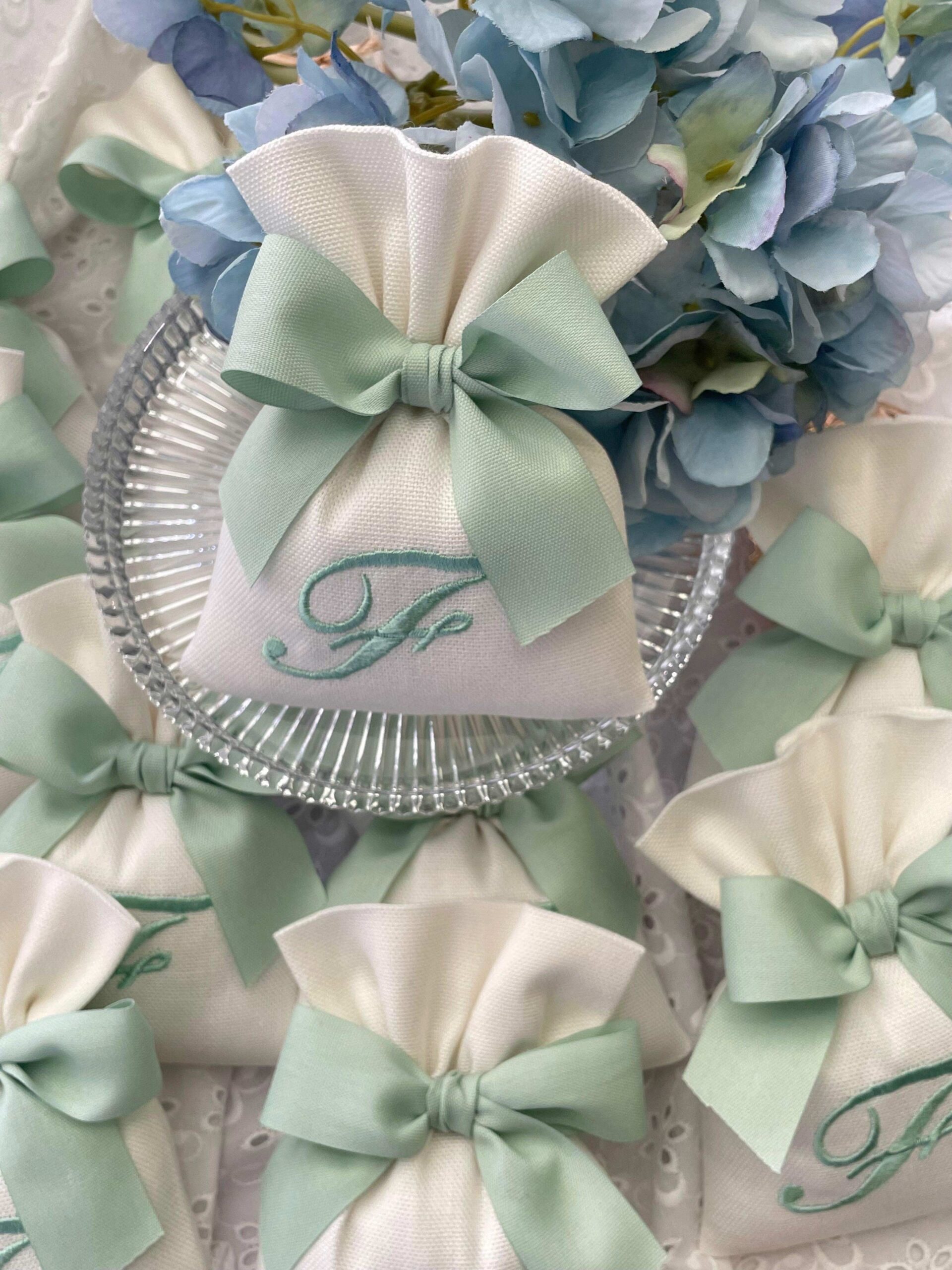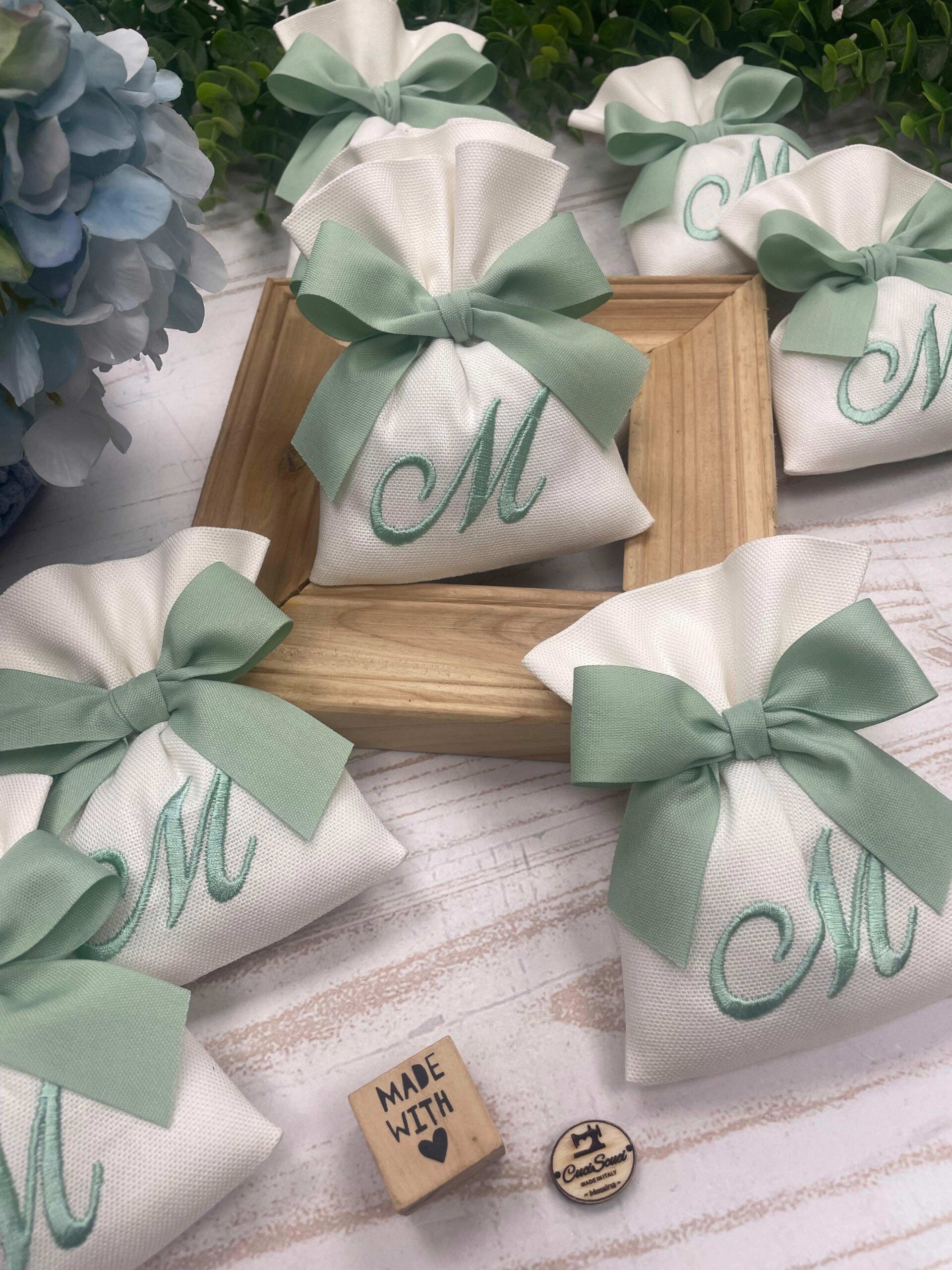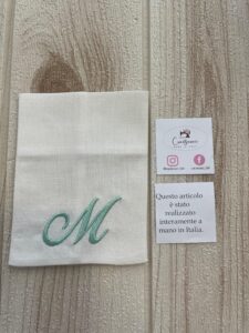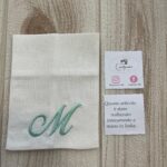 Realizzato in cotone panama color seta, impreziosito da un ricamo con iniziale verde acqua, rappresenta una bomboniera dal gusto sobrio e luminoso.