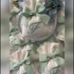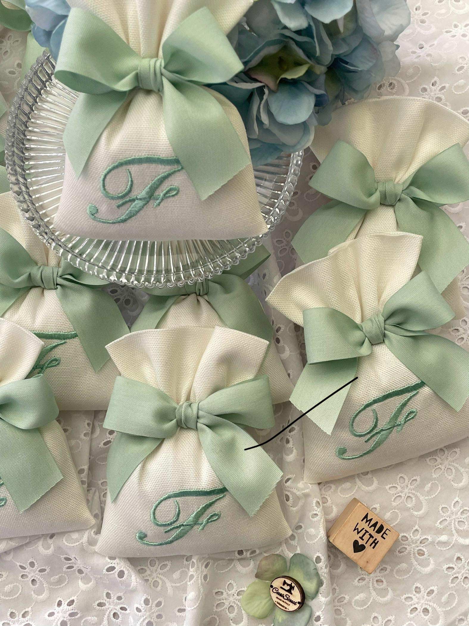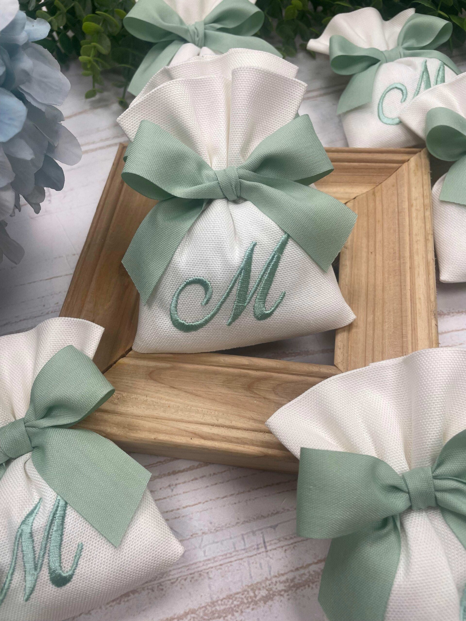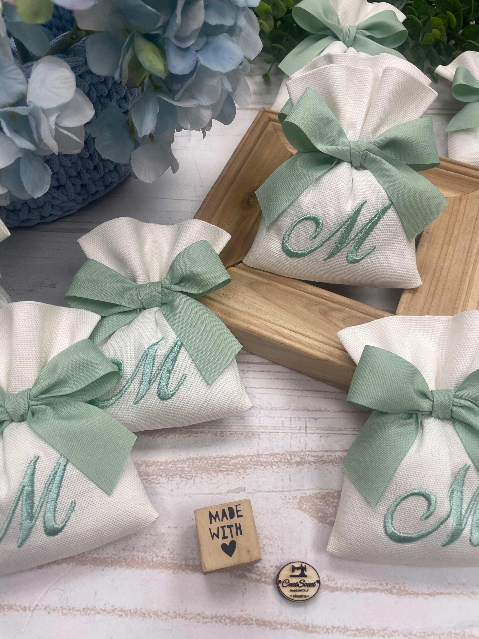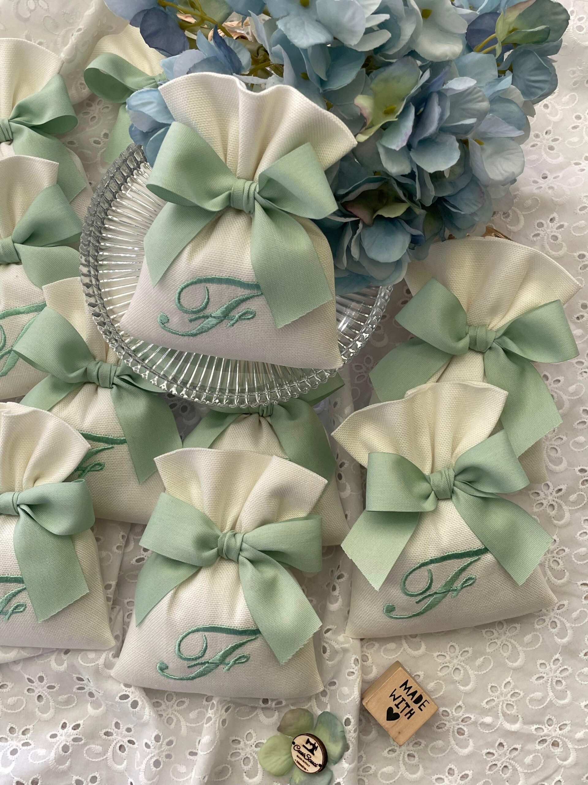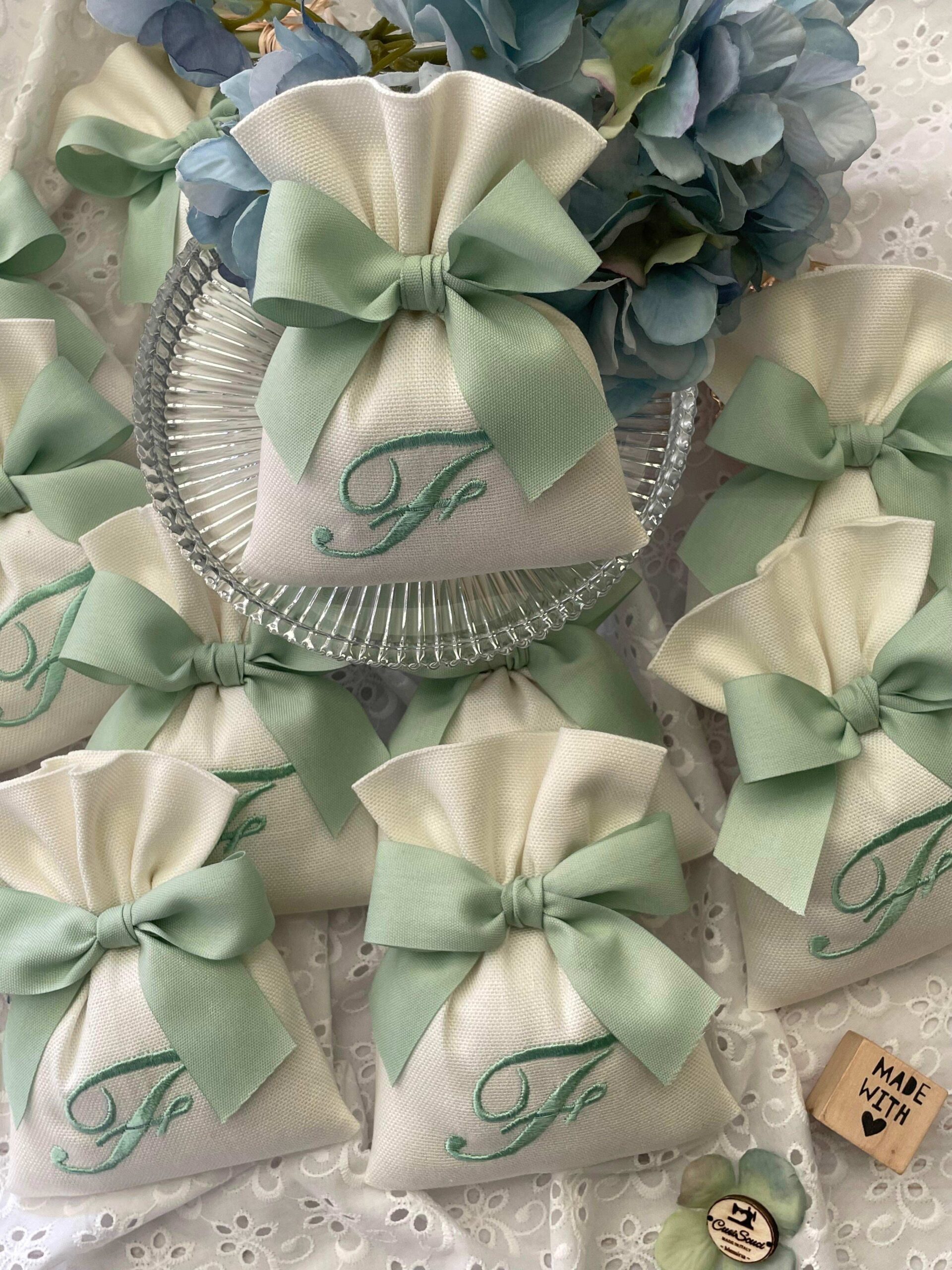 Realizzato in cotone panama color seta, impreziosito da un ricamo con iniziale verde acqua, rappresenta una bomboniera dal gusto sobrio e luminoso.