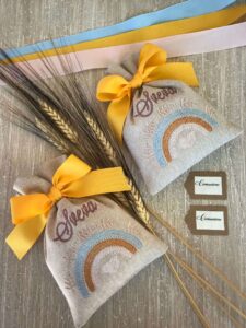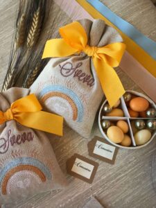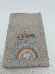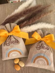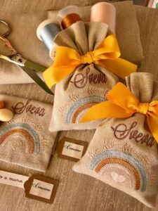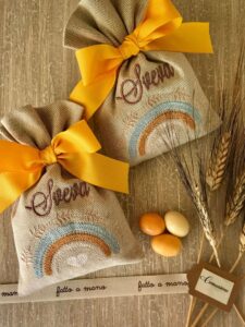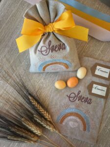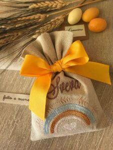 Confezionato in cotone panama colore naturale, è impreziosito dal ricamo di un arcobaleno delicato e dal nome della bimba, rendendo ogni bomboniera un dono speciale e personalizzato.