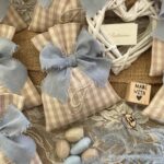 Confezionato: bomboniera pronta da donare, con imbottitura in ovatta, fiocco abbinato e 5 confetti in busta sigillata.