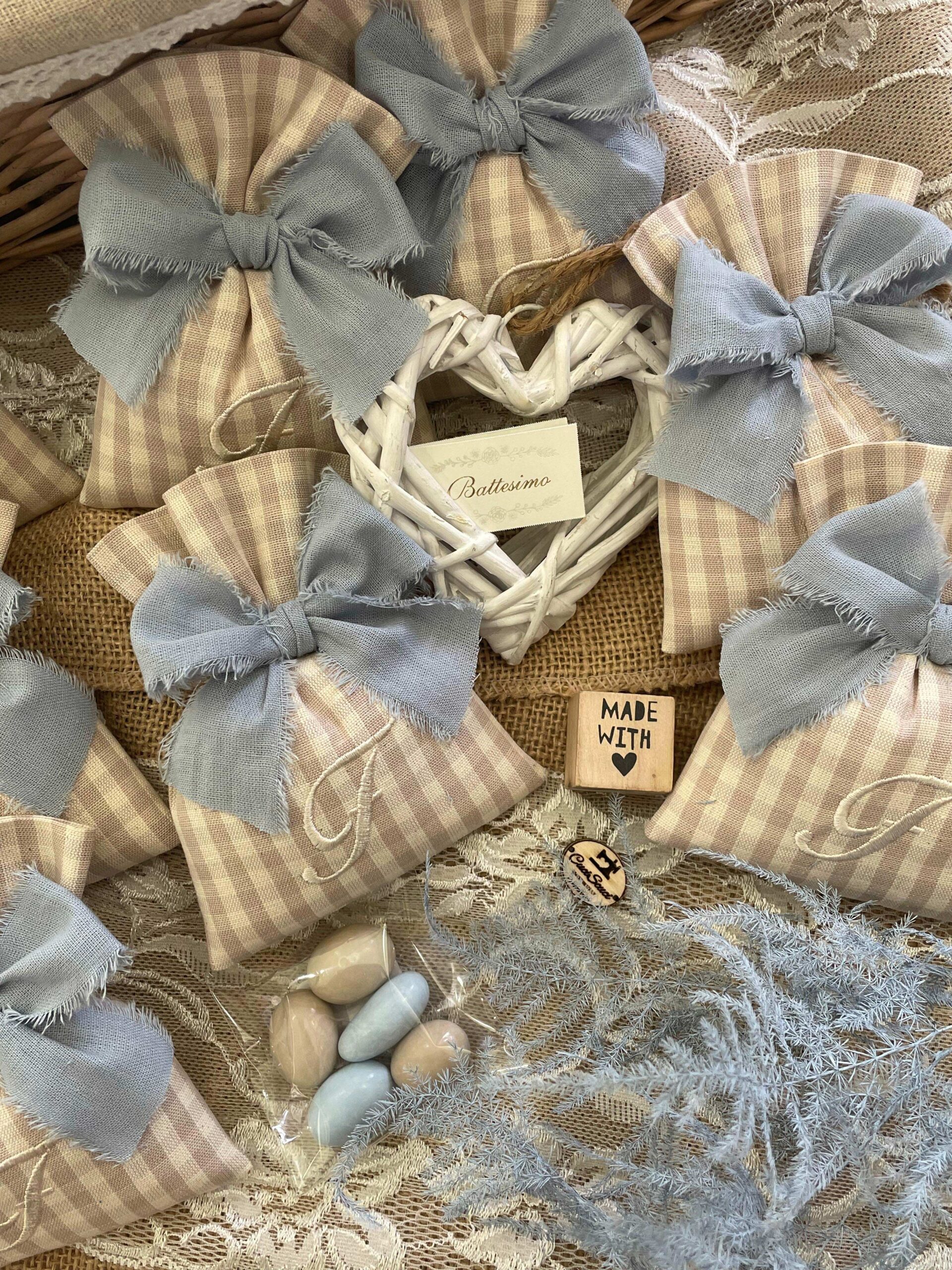 Confezionato: bomboniera pronta da donare, con imbottitura in ovatta, fiocco abbinato e 5 confetti in busta sigillata.
