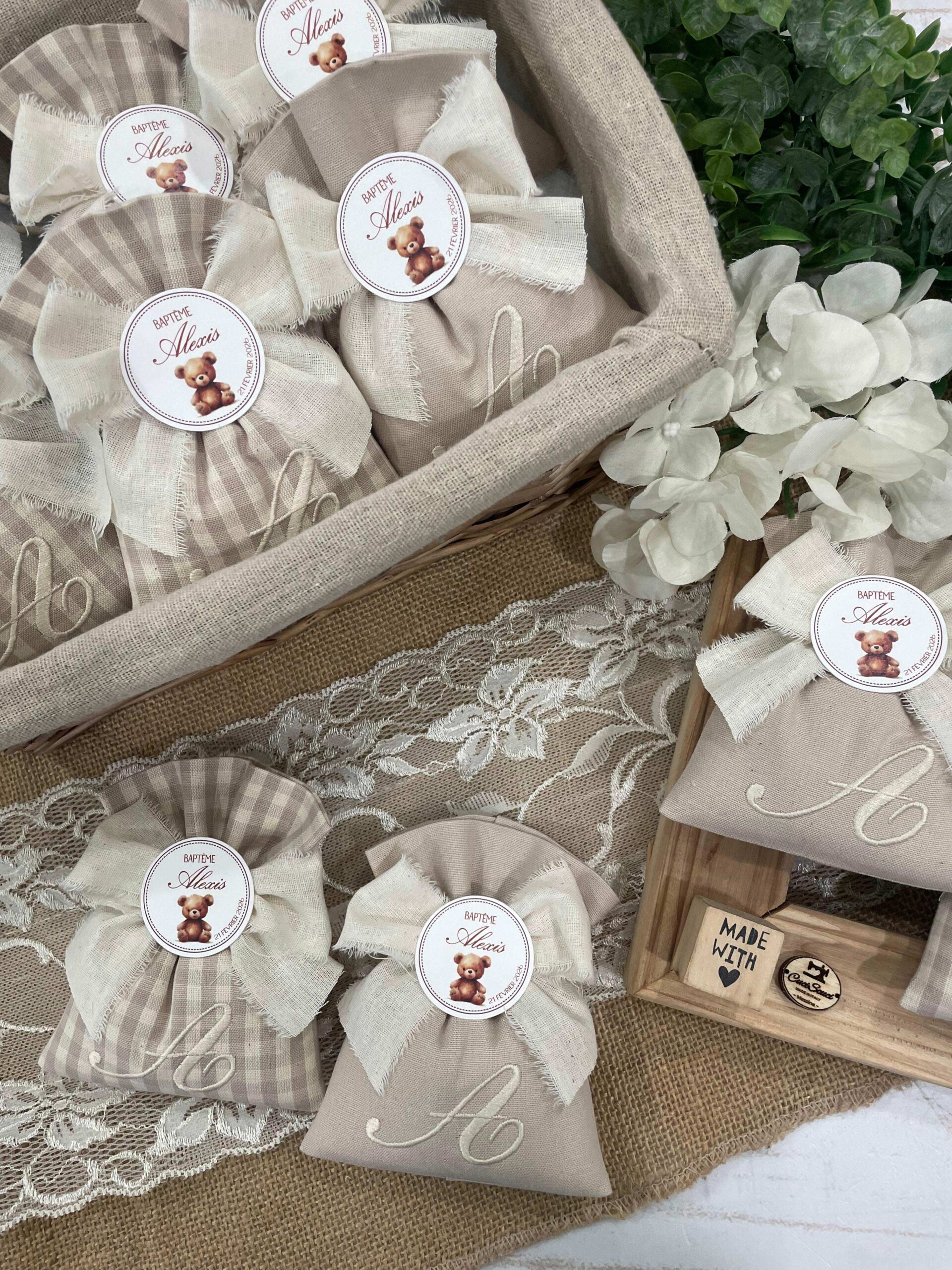 Questo raffinato sacchetto in cotone tinto filo nei toni del mandorla, impreziosito dal ricamo di un’iniziale personalizzata, dona un tocco di calore e raffinatezza a ogni occasione.