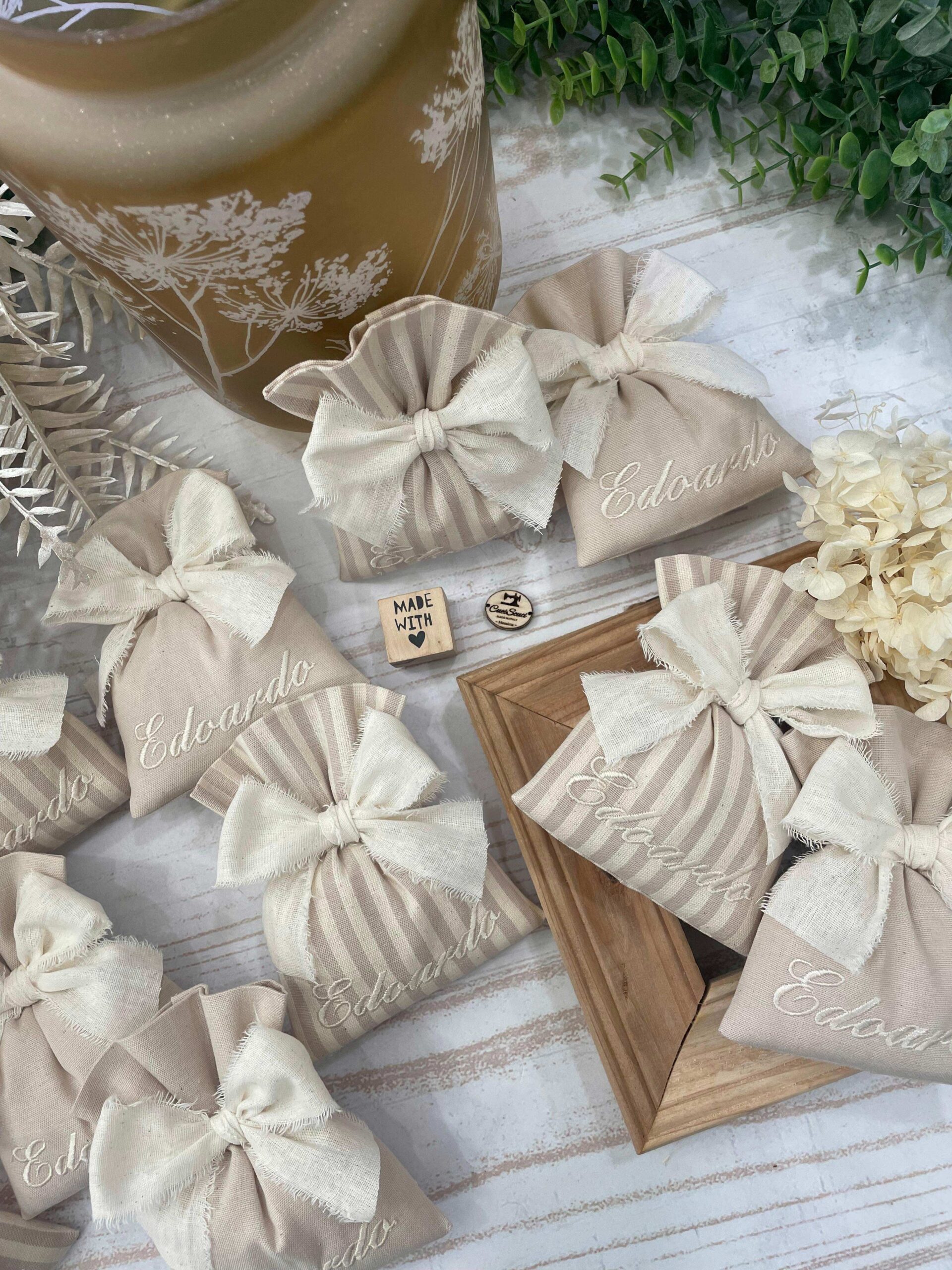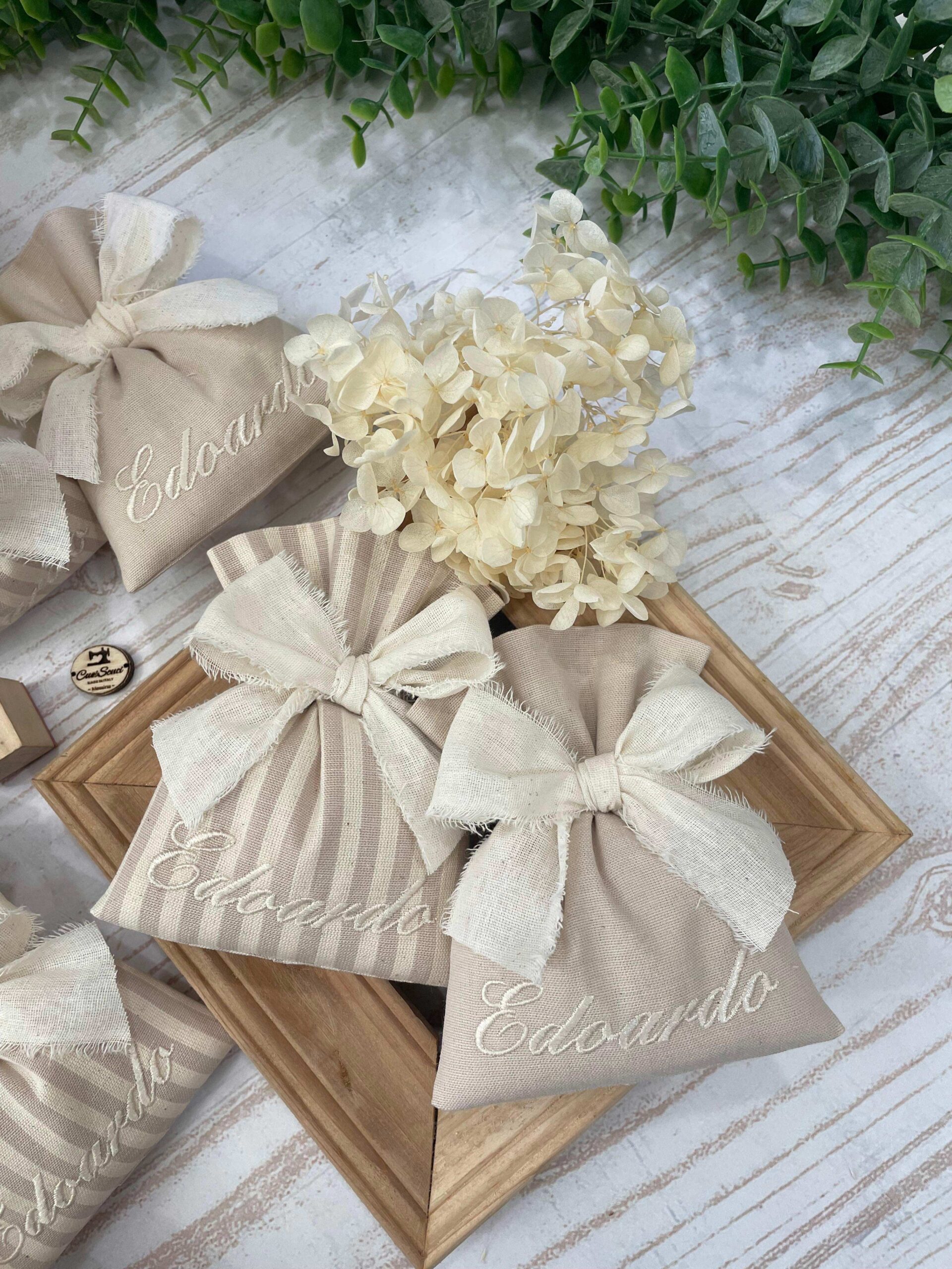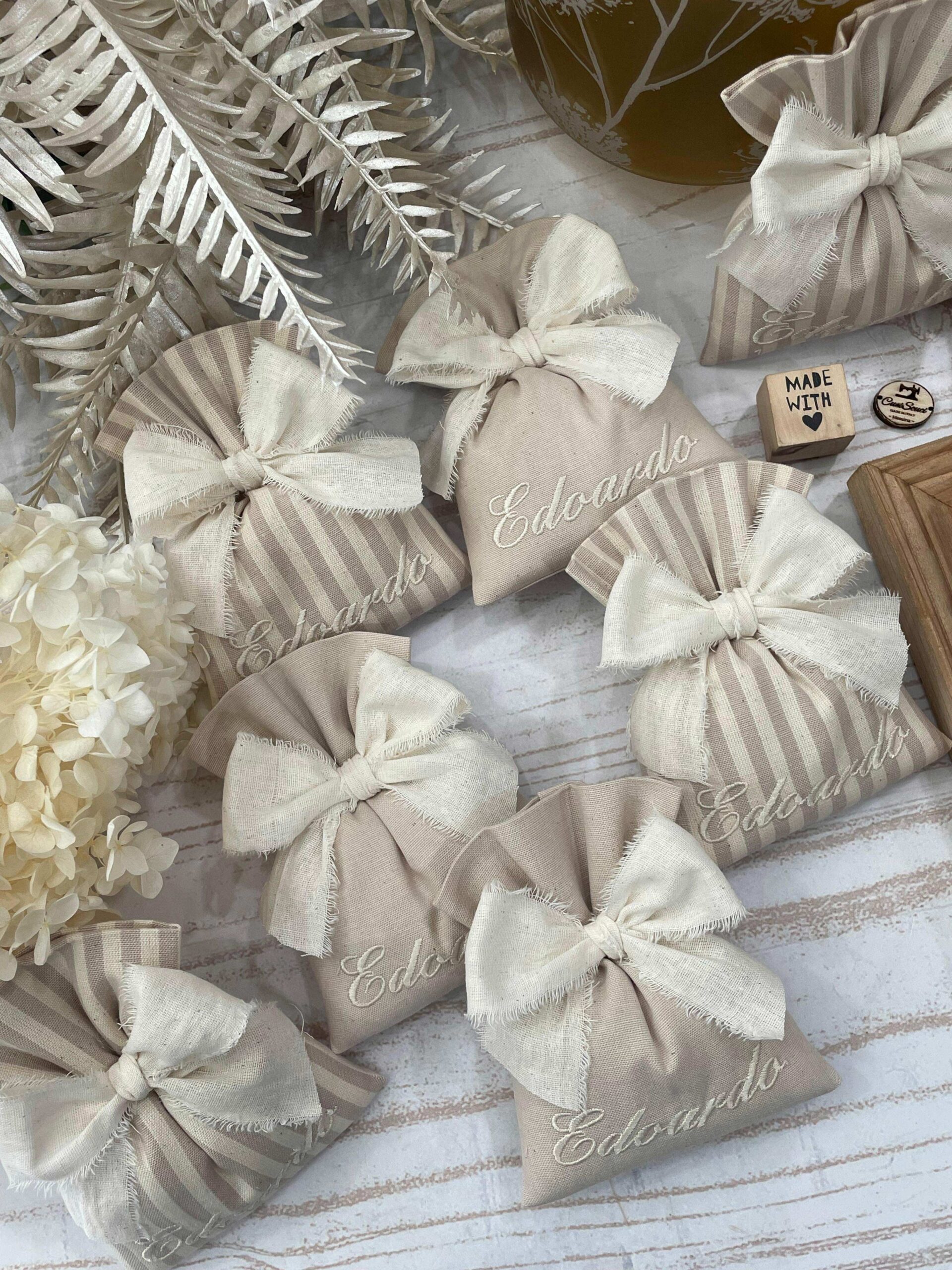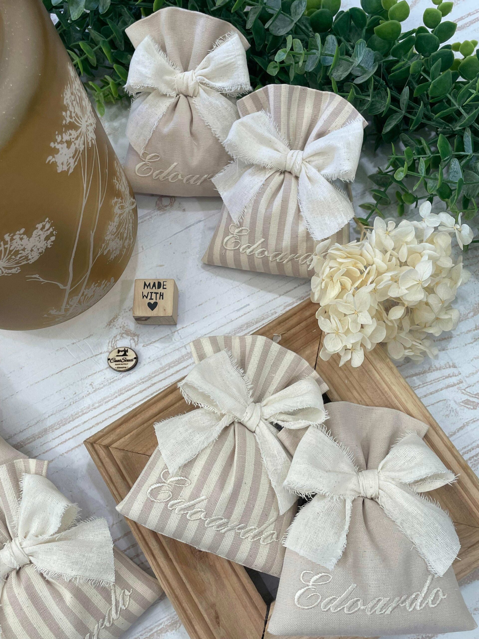 Il sacchetto in cotone tinto filo è disponibile in fantasie assortite (o a scelta) nei delicati toni del mandorla, ed è impreziosito dal ricamo personalizzato del nome, per rendere ogni creazione unica e raffinata.