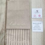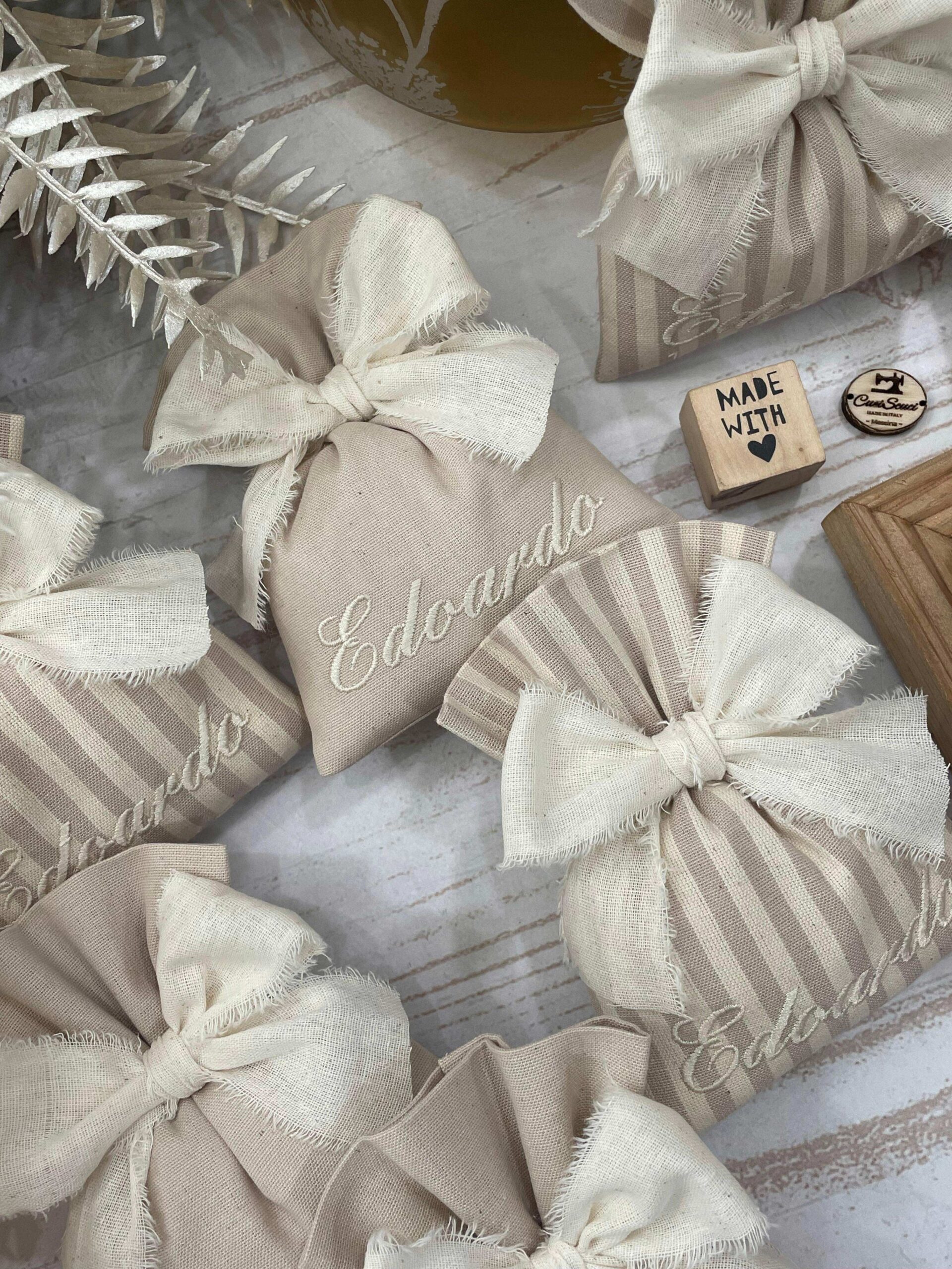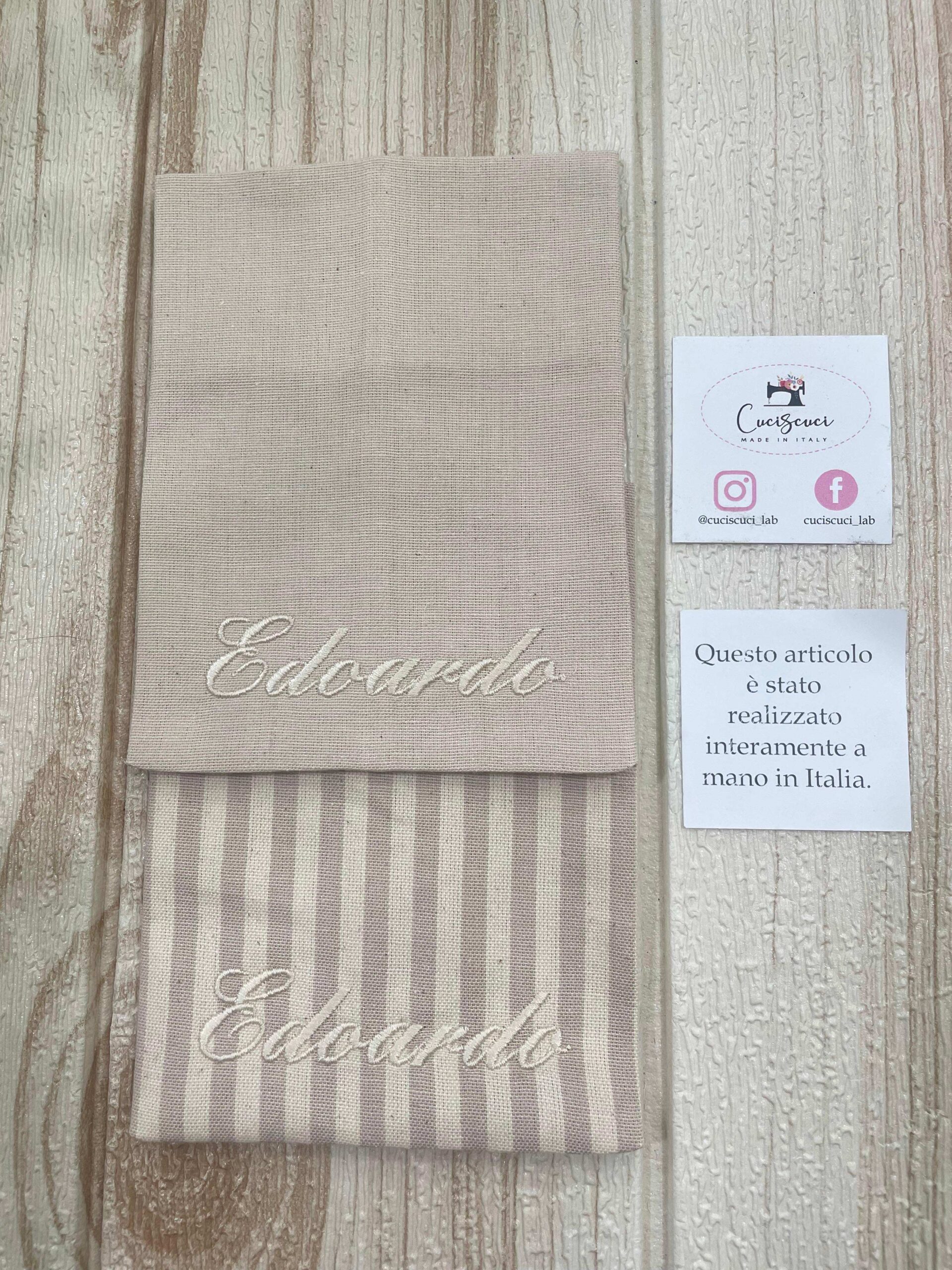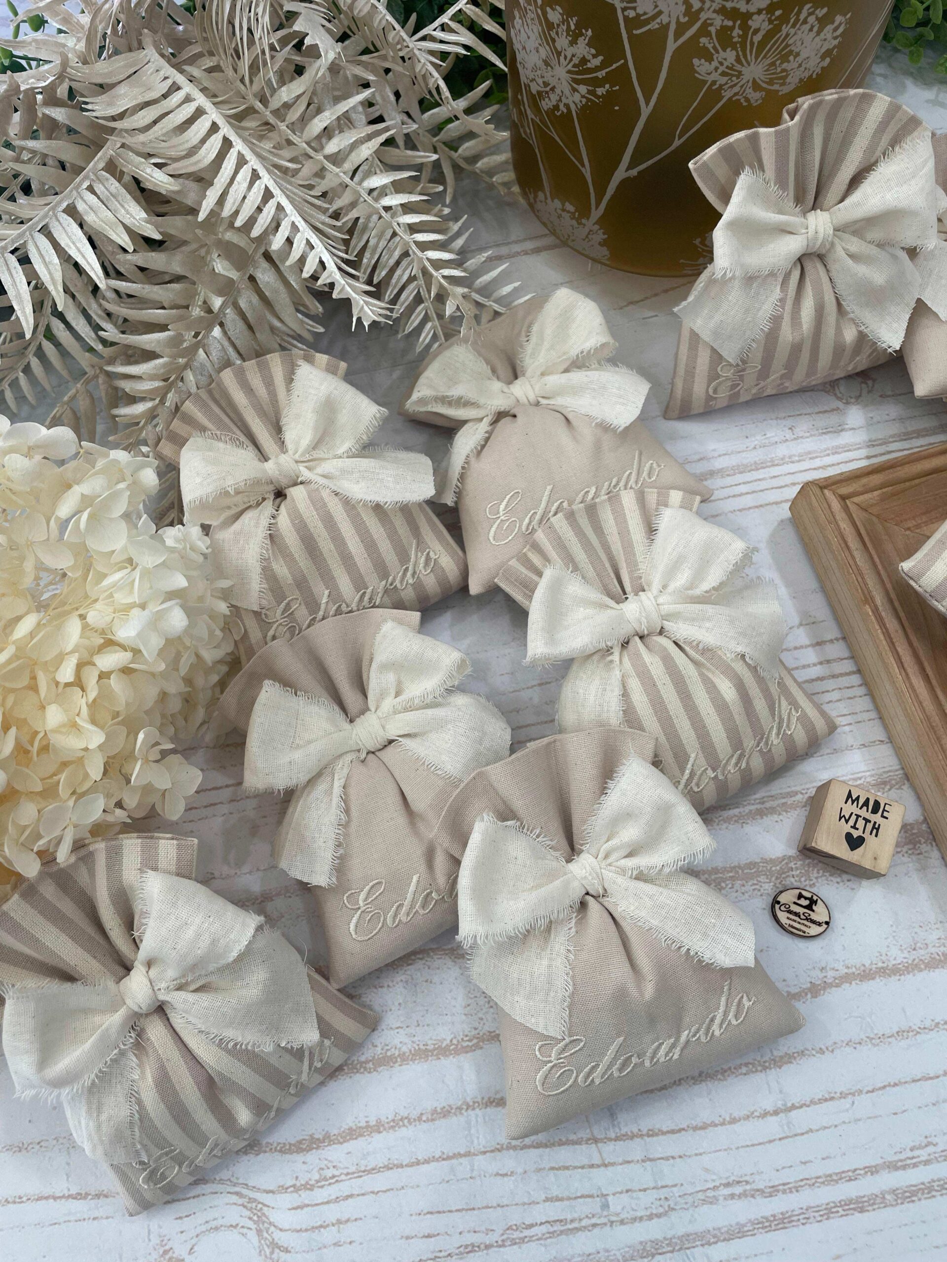Il sacchetto in cotone tinto filo è disponibile in fantasie assortite (o a scelta) nei delicati toni del mandorla, ed è impreziosito dal ricamo personalizzato del nome, per rendere ogni creazione unica e raffinata.