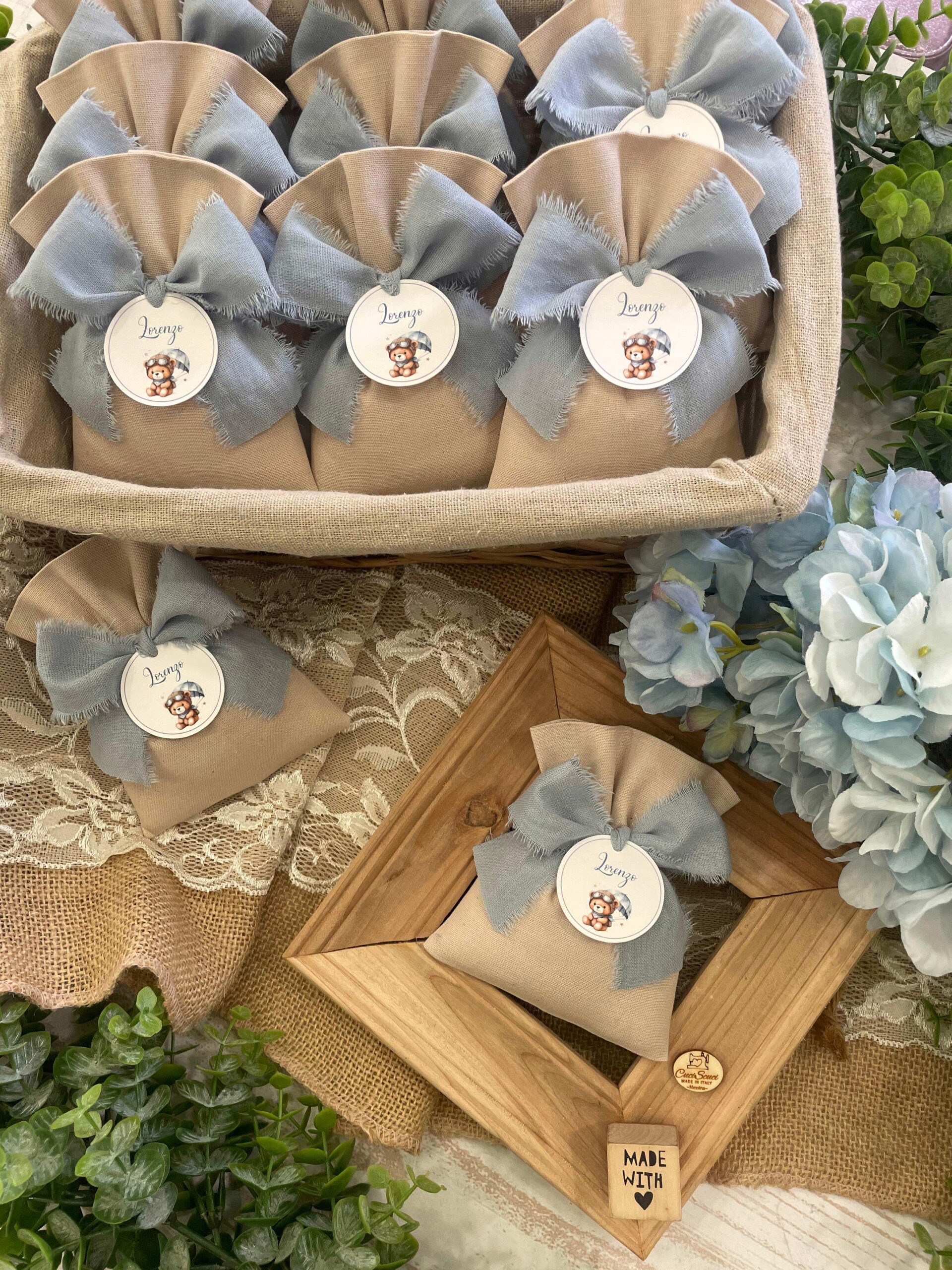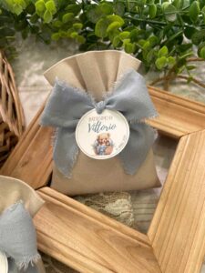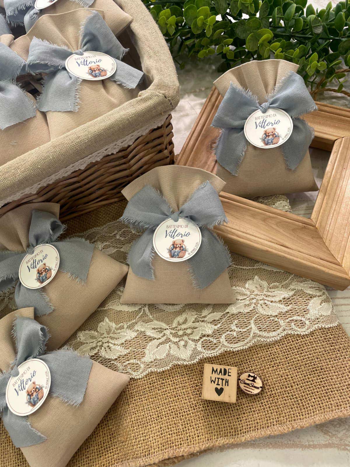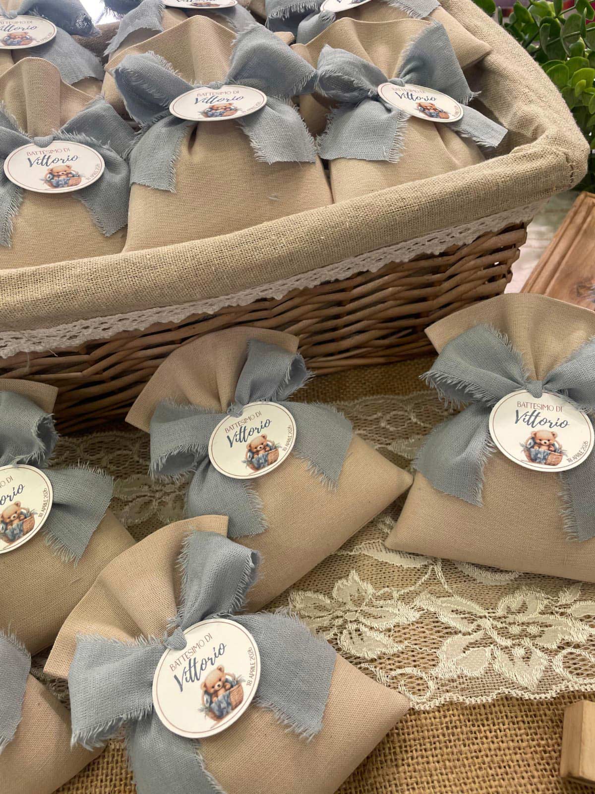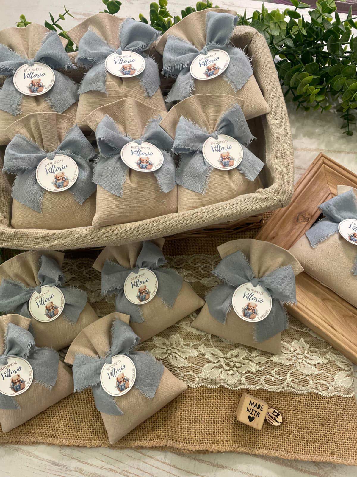 • Confezionato – sacchetto pronto da donare, confezionato con imbottitura in ovatta, fiocco abbinato e 5 confetti in busta sigillata