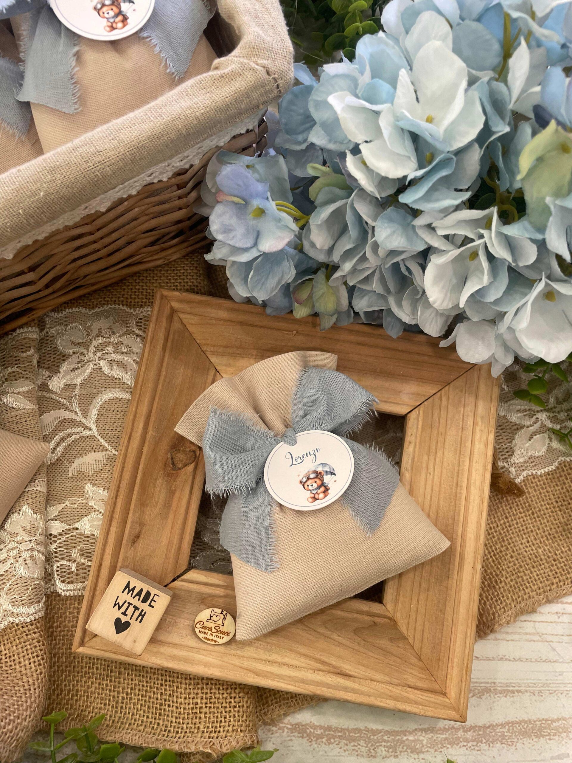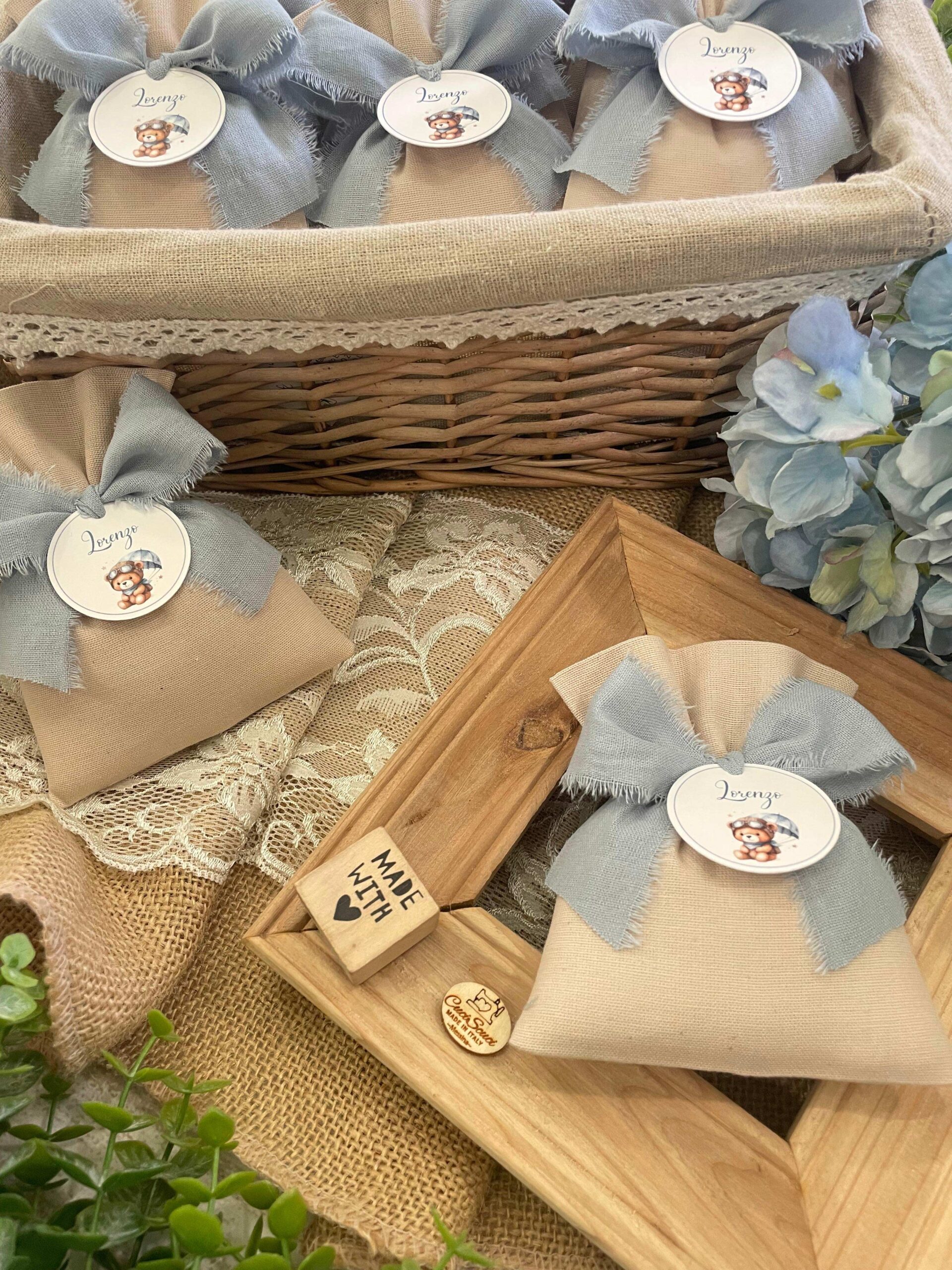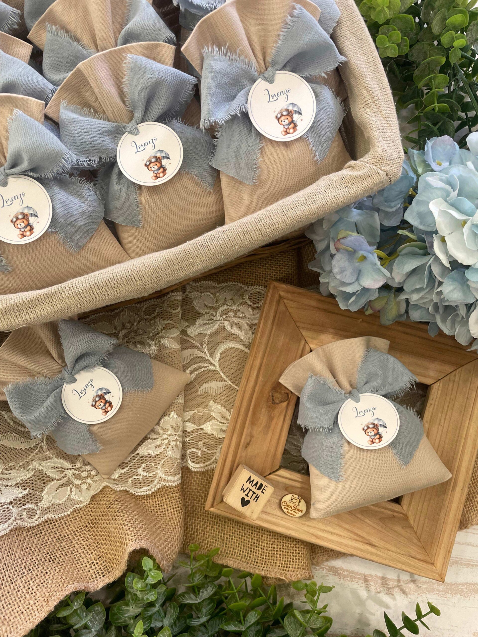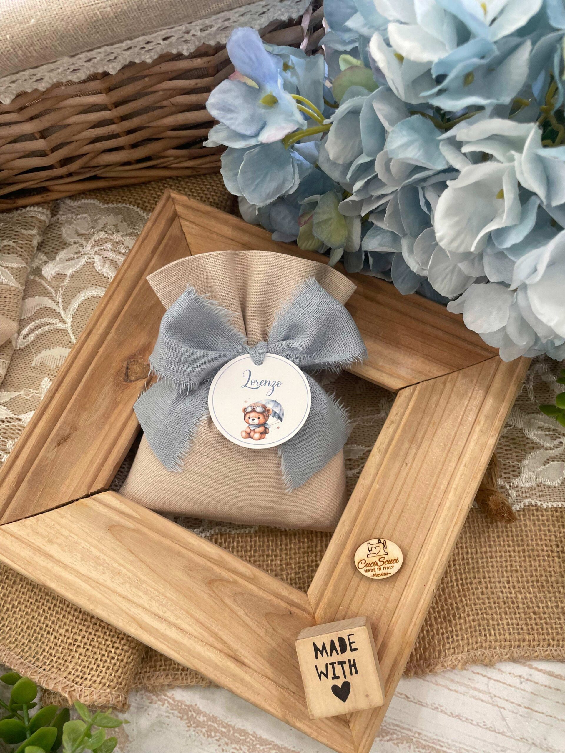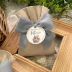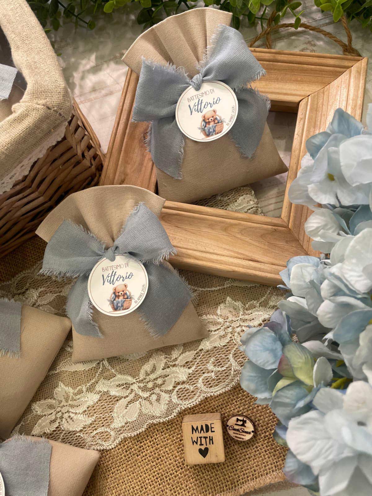 • Confezionato – sacchetto pronto da donare, confezionato con imbottitura in ovatta, fiocco abbinato e 5 confetti in busta sigillata