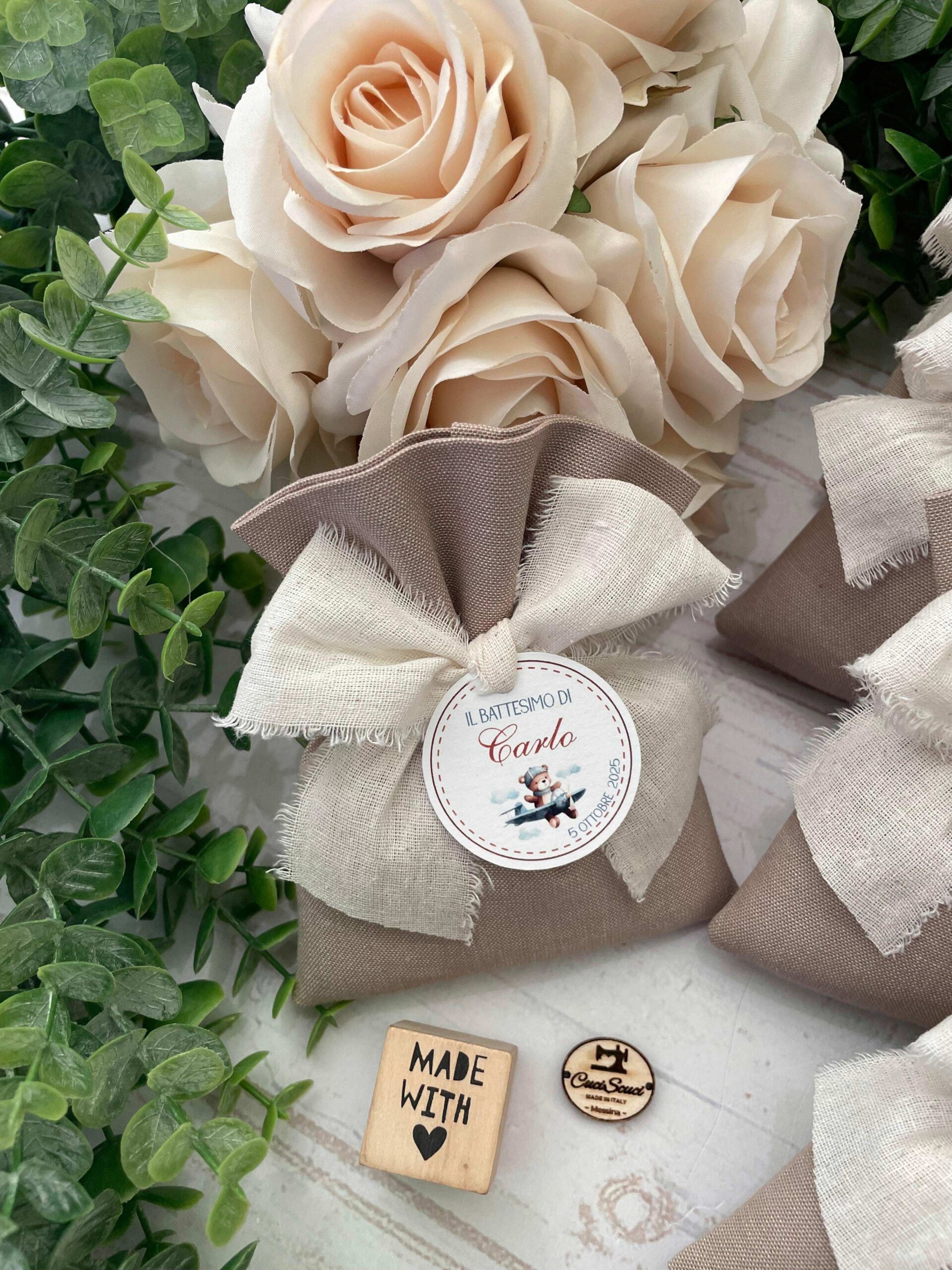 Il sacchetto, confezionato in cotone tinto filo nocciola, è pensato per essere un dono raffinato e unico per ogni occasione speciale.