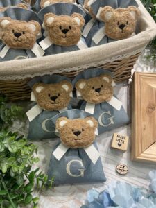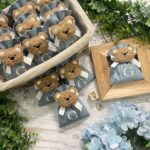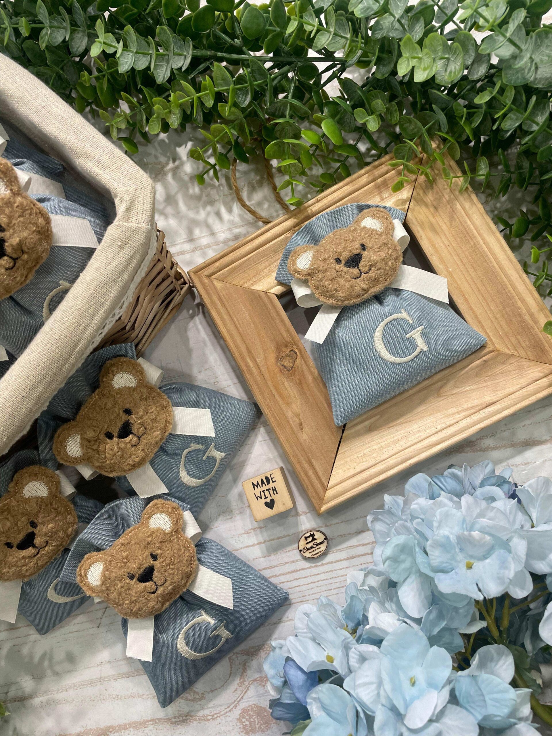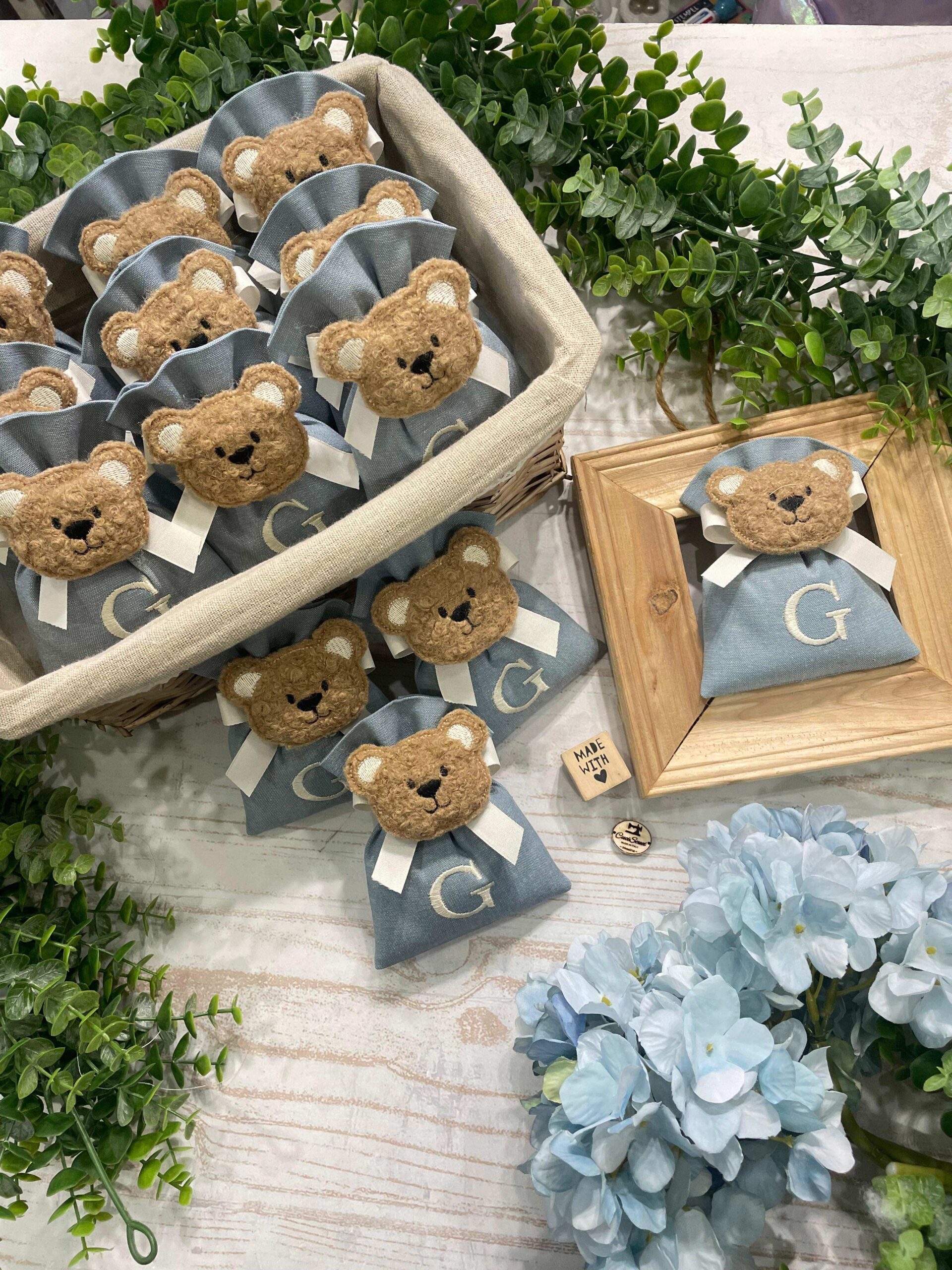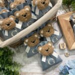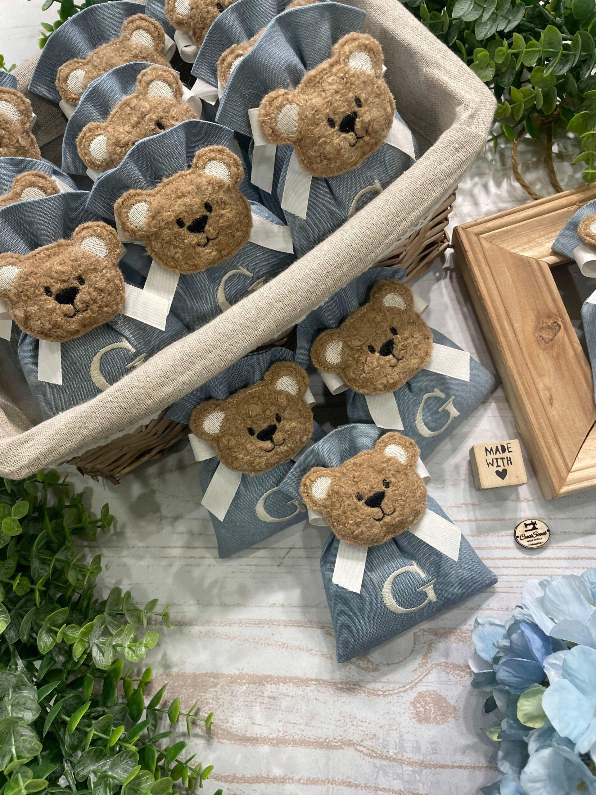 • Confezionato – bomboniera pronta da donare, con sacchetto ricamato, imbottitura in ovatta, fiocco abbinato, 5 confetti in busta sigillata e applicazione orsetto calamita