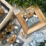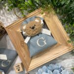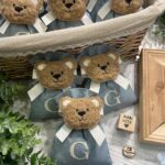 Confezionato in cotone tinto filo color nuvola, è impreziosito dal ricamo di un’iniziale e dall’applicazione di un delicato orsetto calamita in tessuto bouclè marrone o bianco, per una bomboniera dal fascino tenero e raffinato.