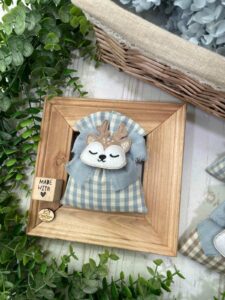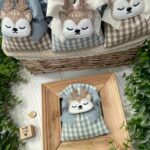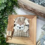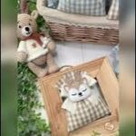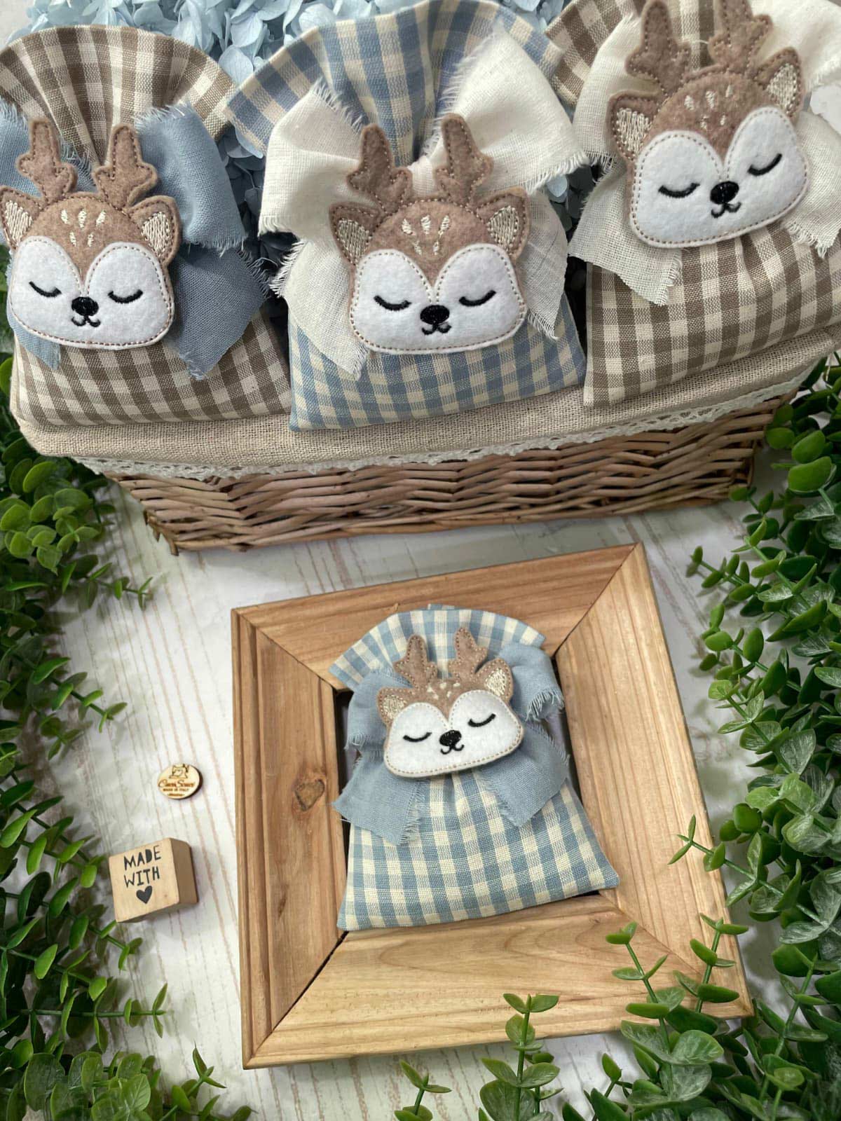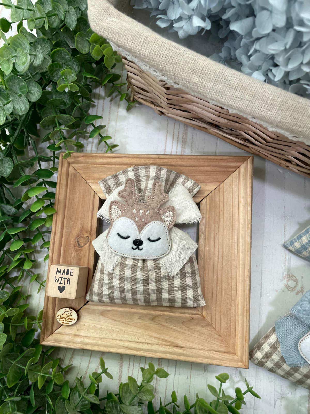 Confezionato in cotone tinto filo nei delicati toni del nuvola e del nocciola, con fantasia a quadretti assortita o a scelta, è arricchito dall’applicazione di una tenera renna calamita in pannolenci.
