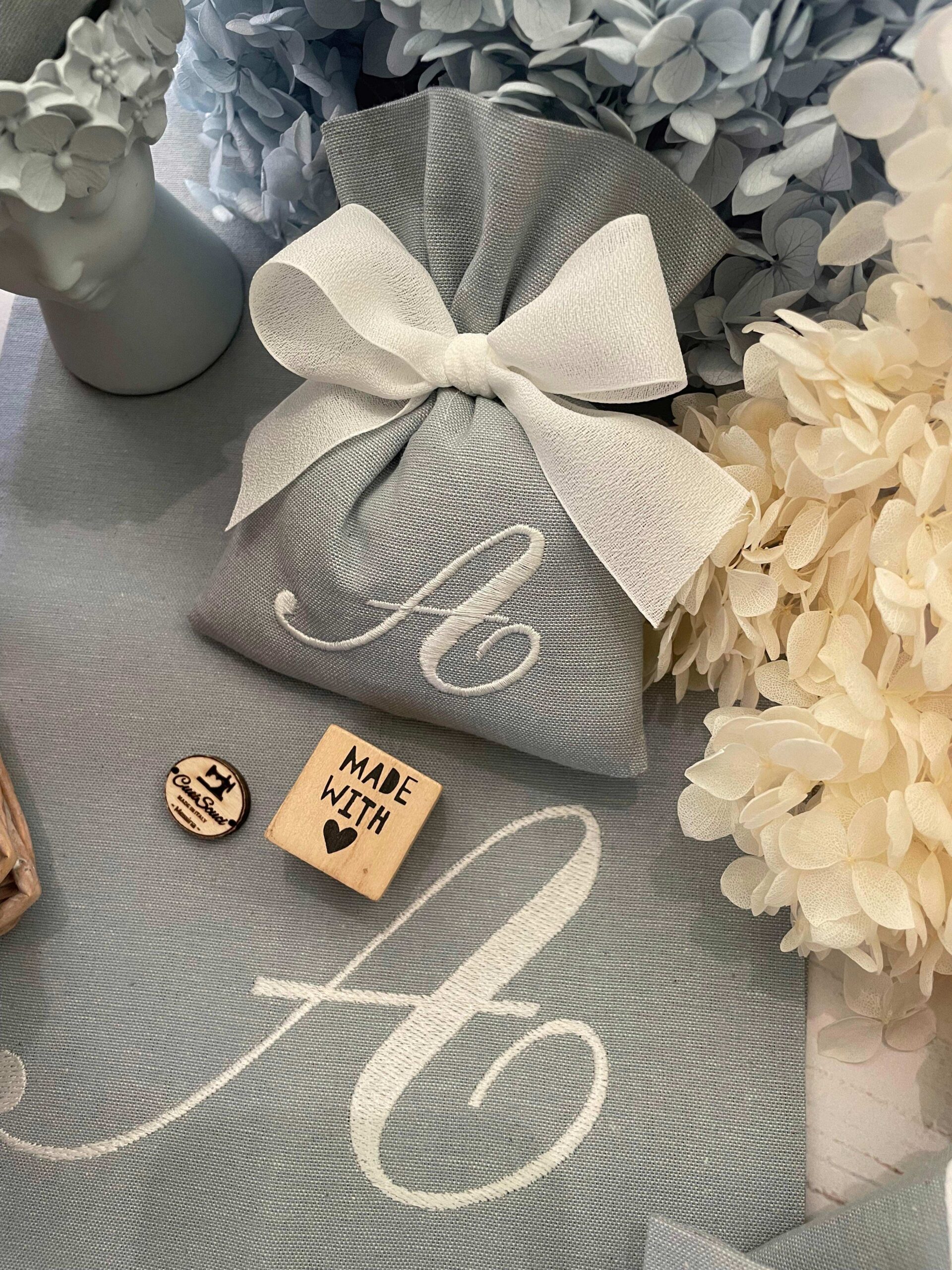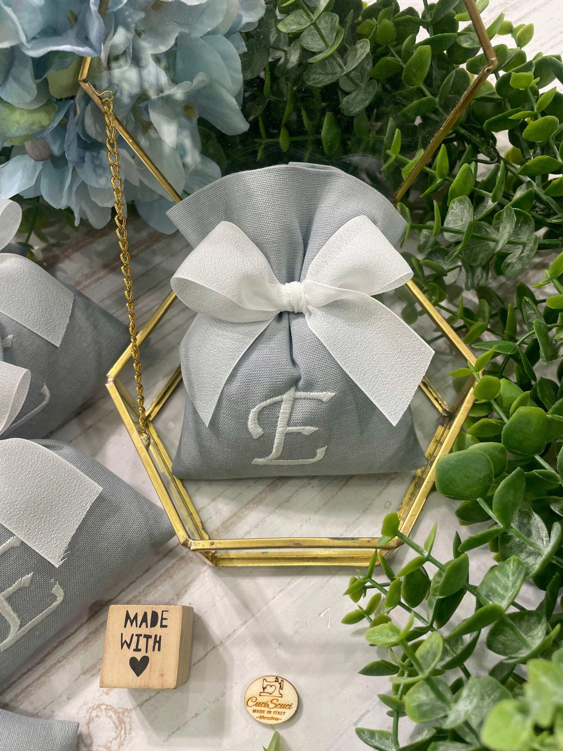 ✨ Sacchetto Artigianale in Cotone Nuvola con Iniziale Ricamata e Nastro in Crepe di Seta ✨