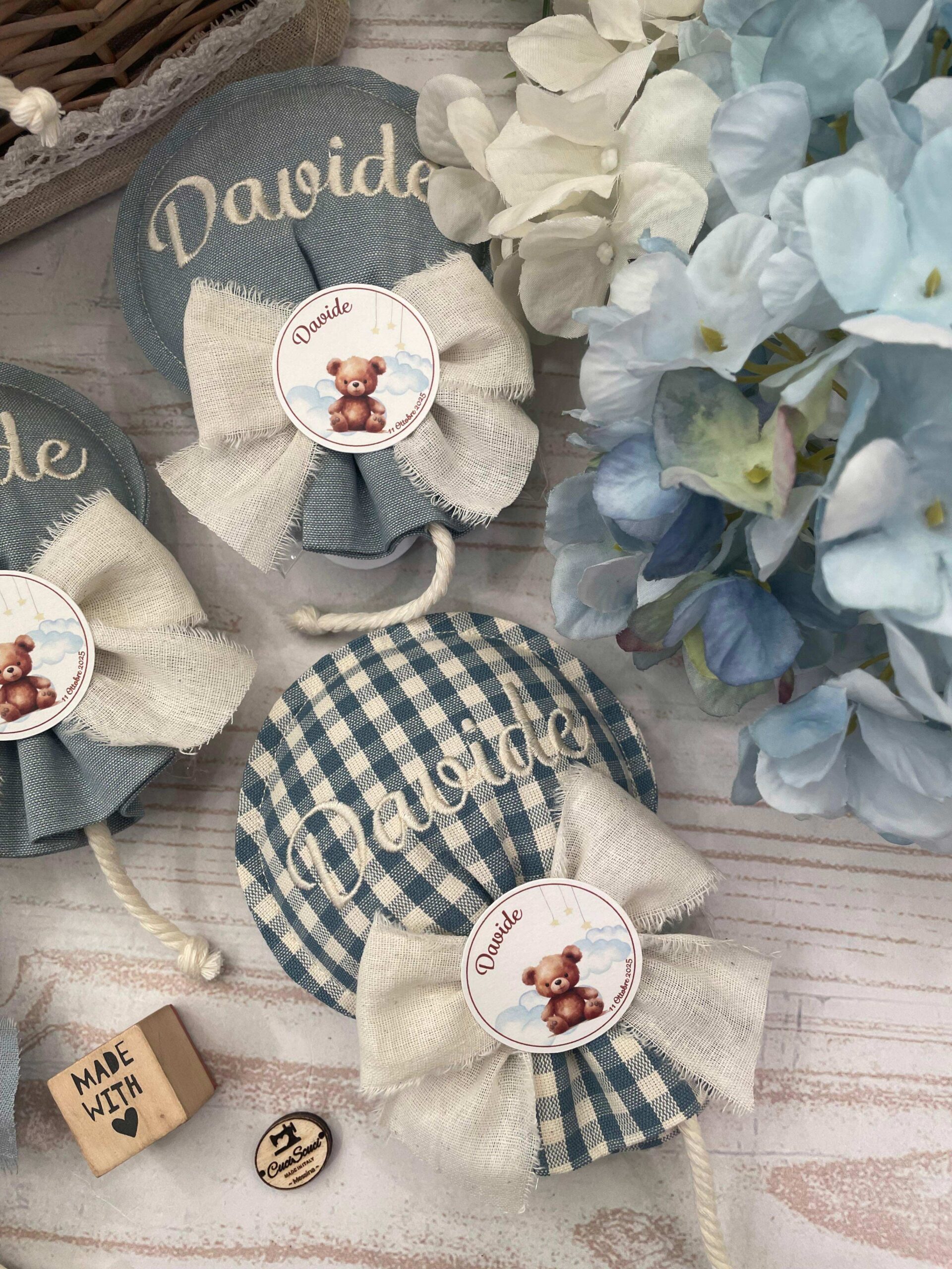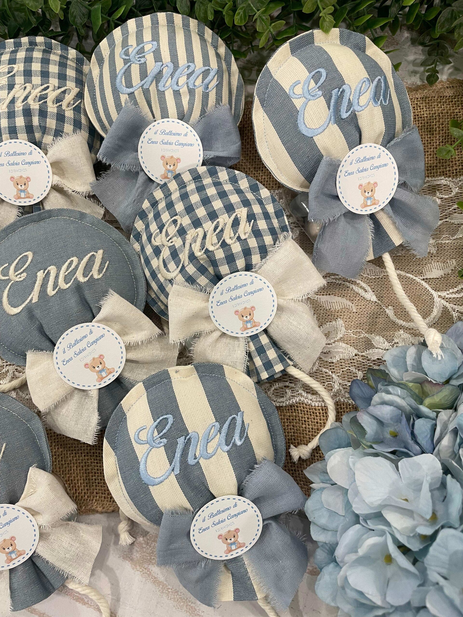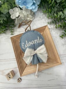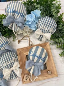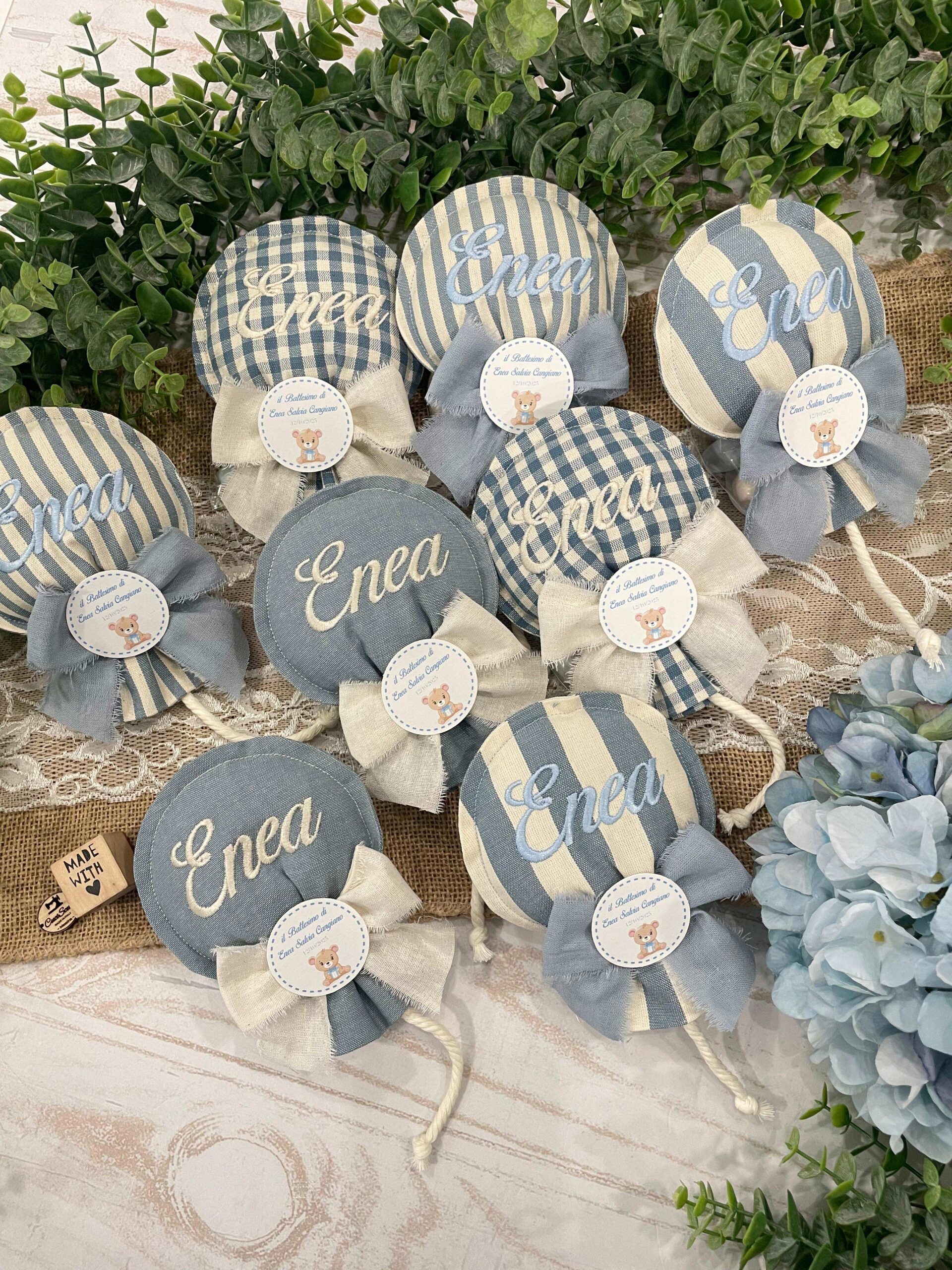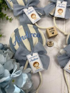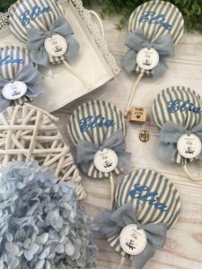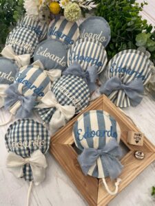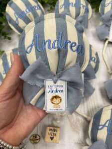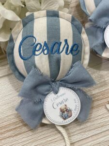 Questo sacchetto a forma di palloncino in cotone tinto filo, disponibile in fantasie assortite (o a scelta) nei delicati toni dell’azzurro polvere, è impreziosito dal ricamo personalizzato del nome del bimbo.
