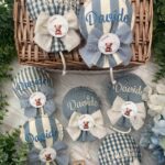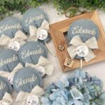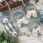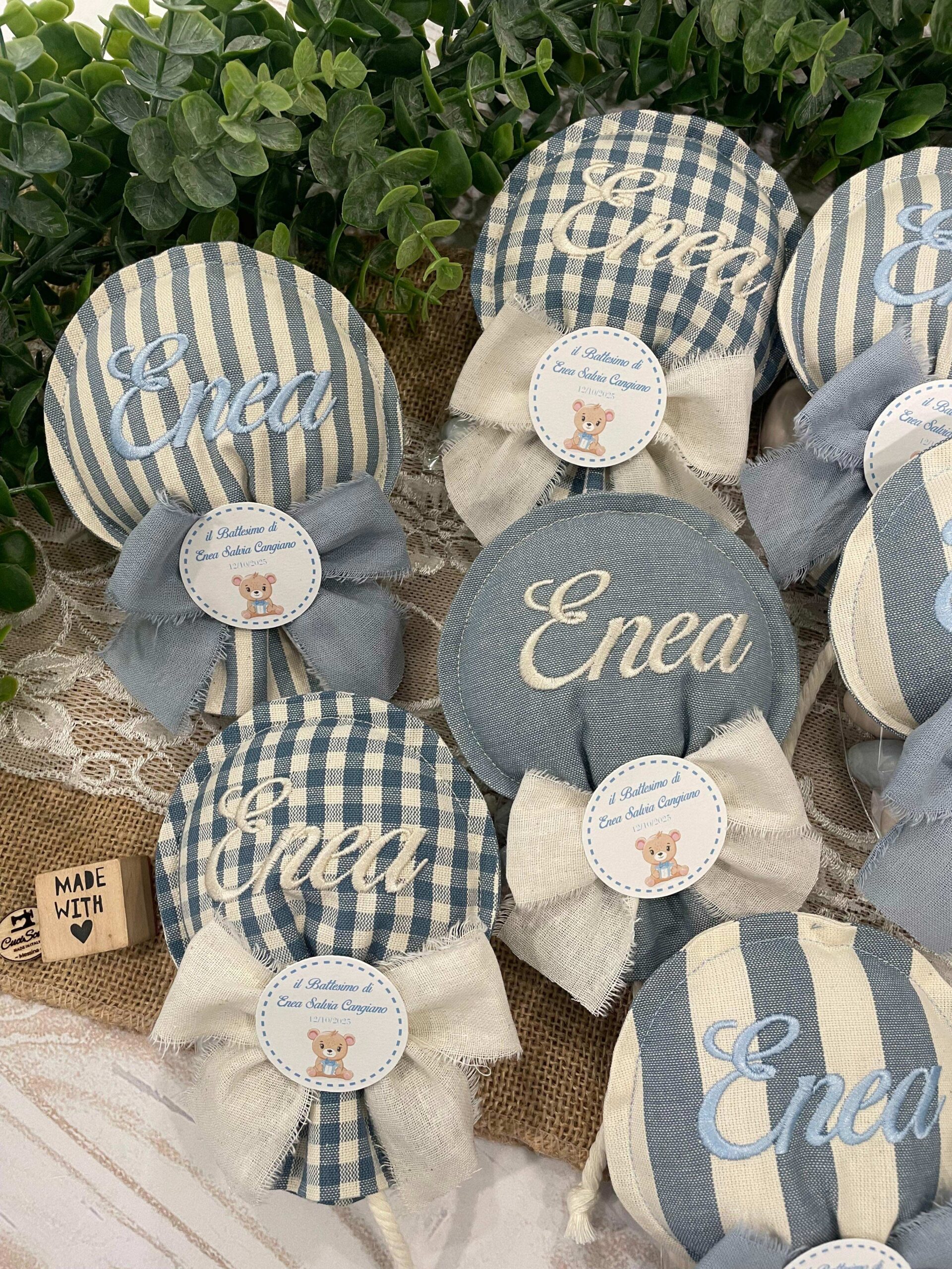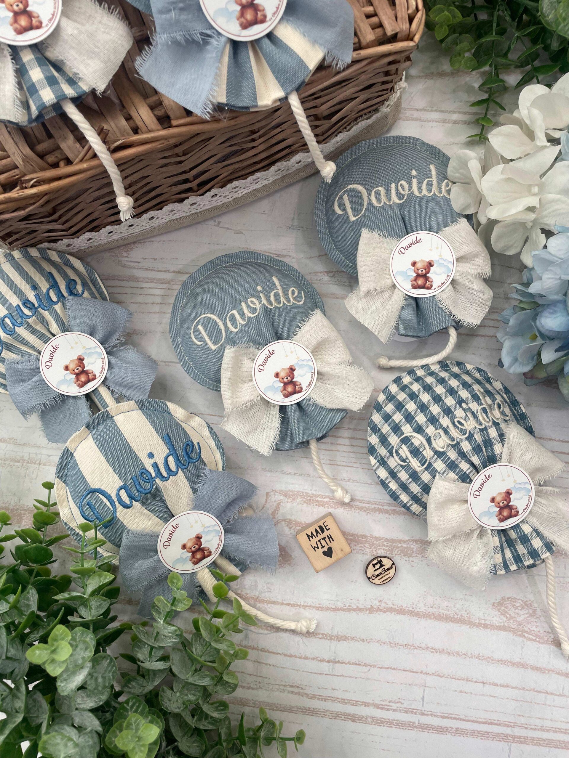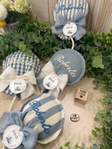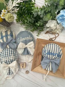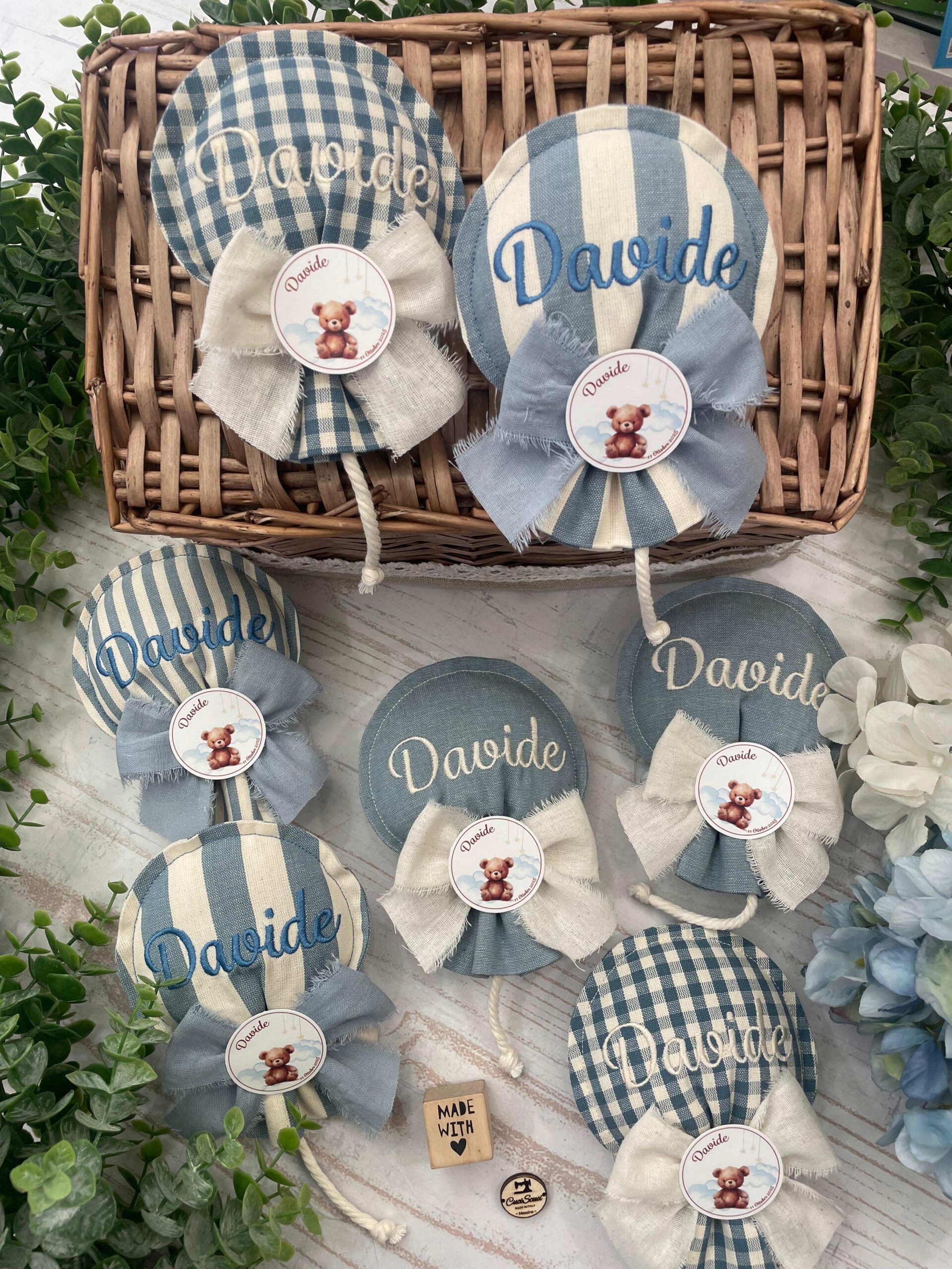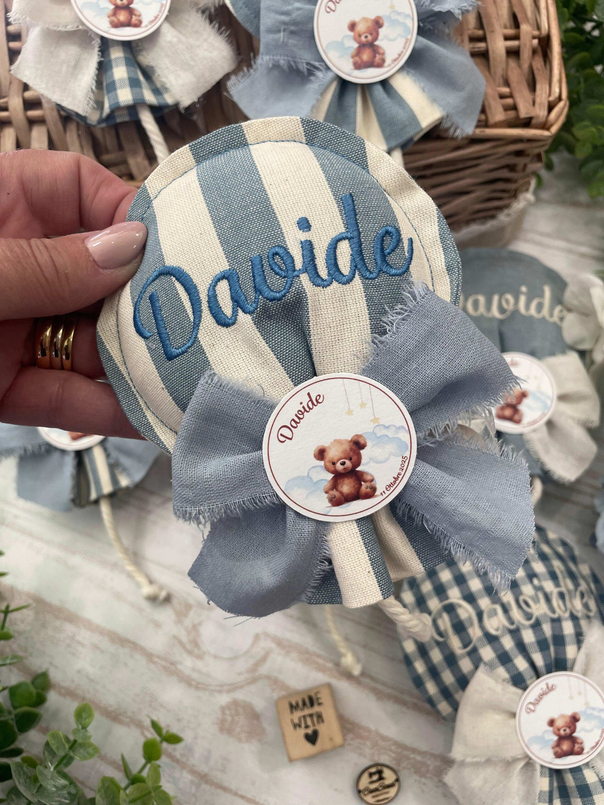 Questo sacchetto a forma di palloncino in cotone tinto filo, disponibile in fantasie assortite (o a scelta) nei delicati toni dell’azzurro polvere, è impreziosito dal ricamo personalizzato del nome del bimbo.