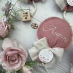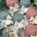 Questo dolce sacchetto a forma di palloncino, confezionato in cotone tinto filo nei toni delicati dell’azzurro polvere e del rosa antico, è impreziosito dal ricamo personalizzato del nome del bimbo, rendendo ogni pezzo unico e raffinato.